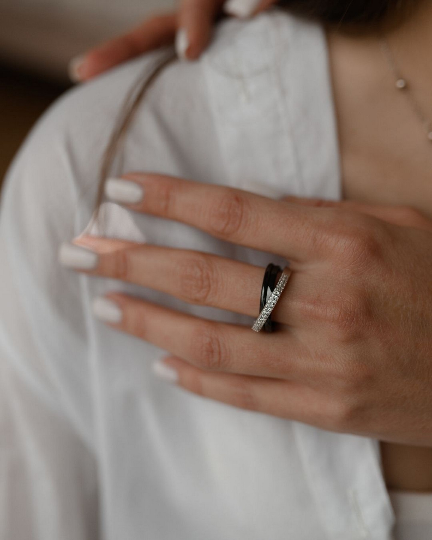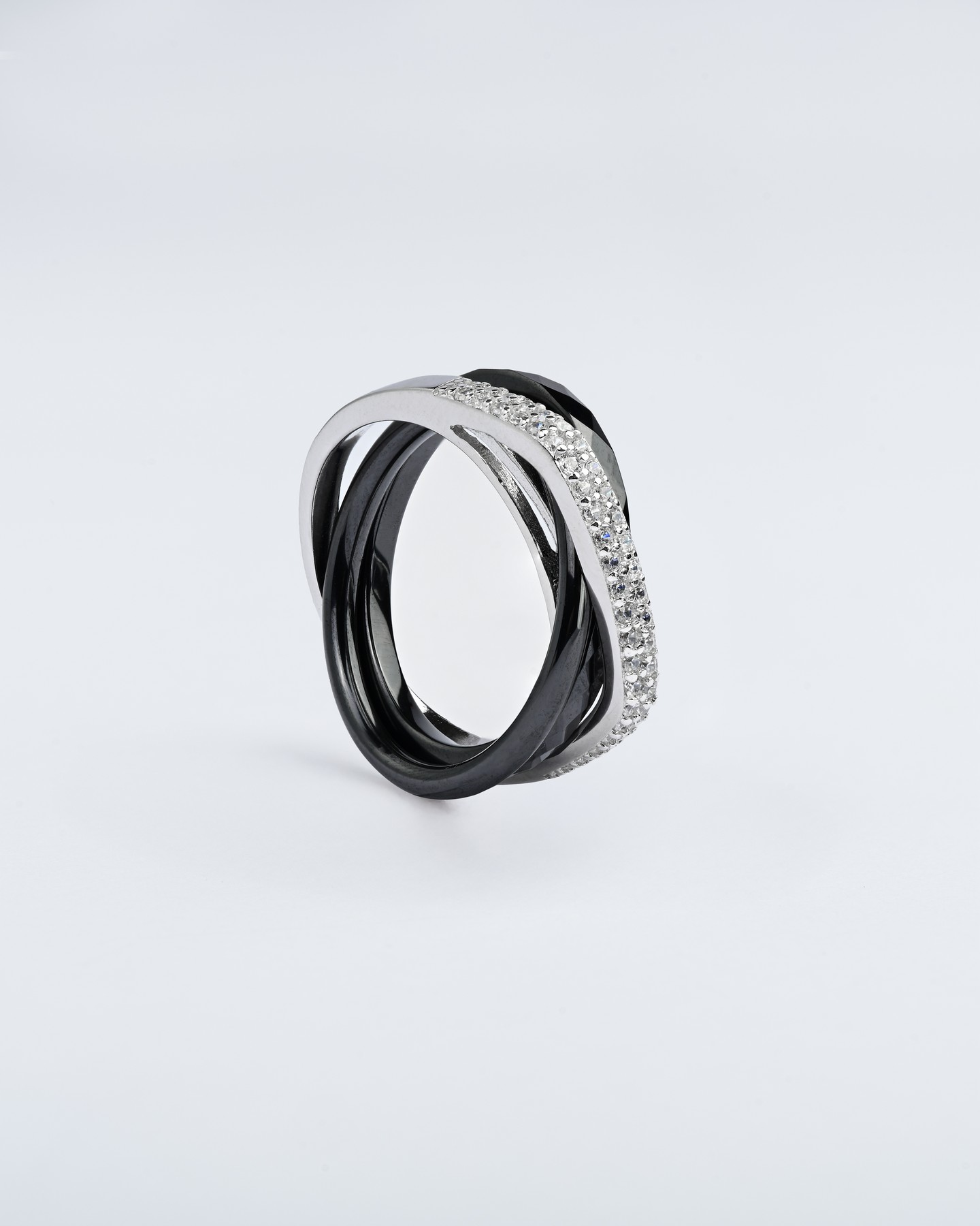 Каблучка срібна потрійна з чорною керамікою і цирконієм діамантової огранки 007071