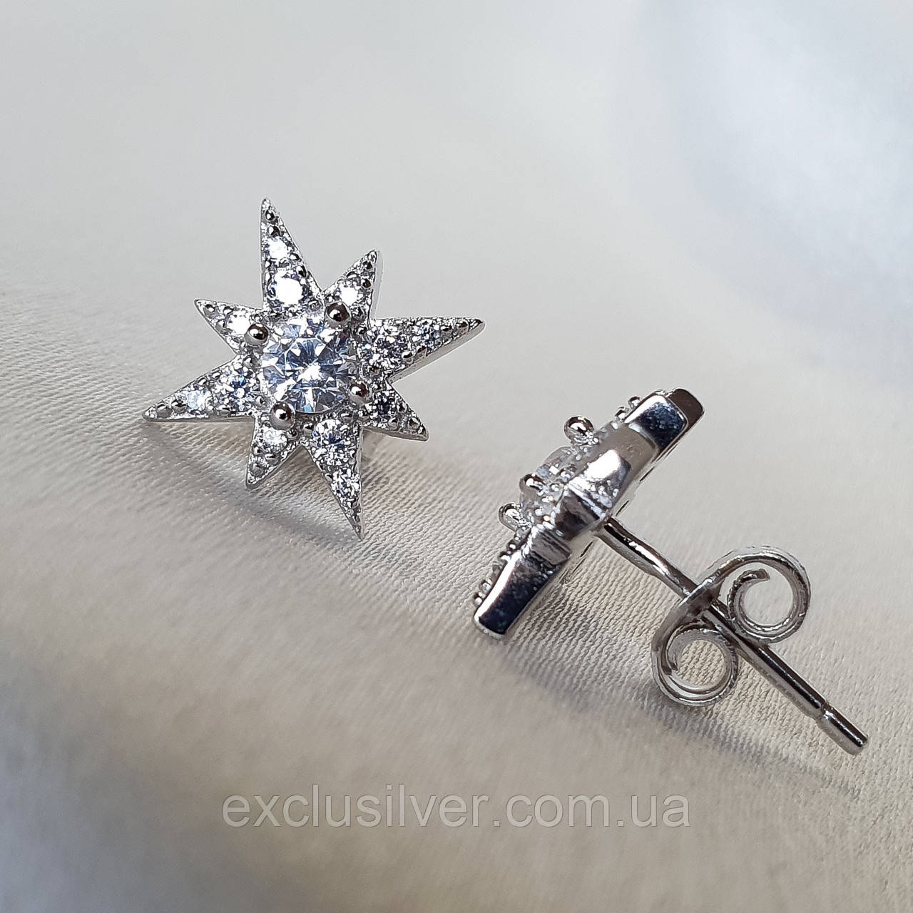 Сережки - пусети (гвоздики) срібні із цирконієм діамантової огранки Зірки
