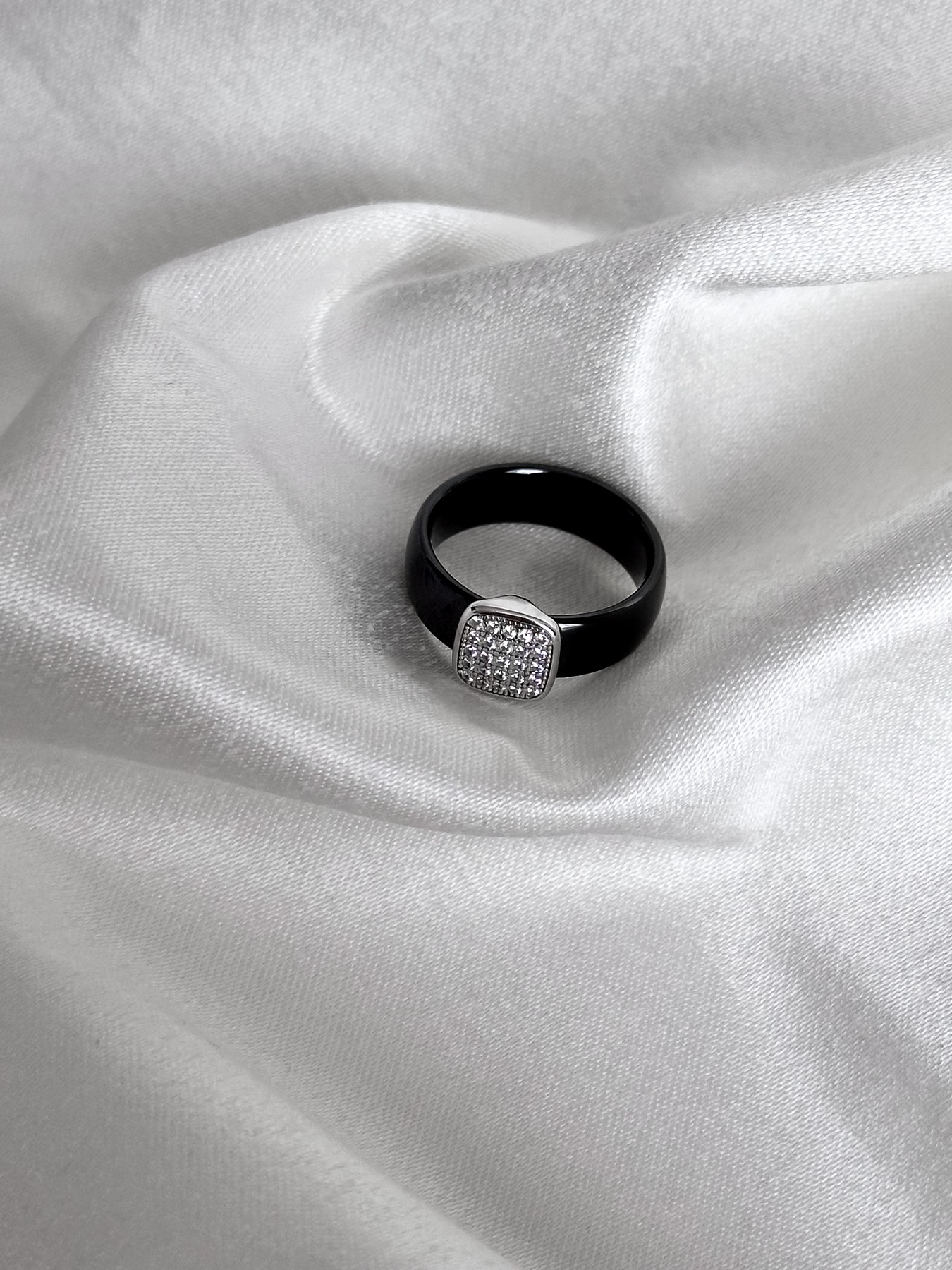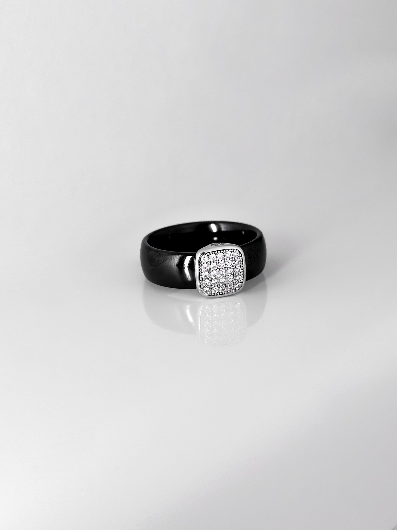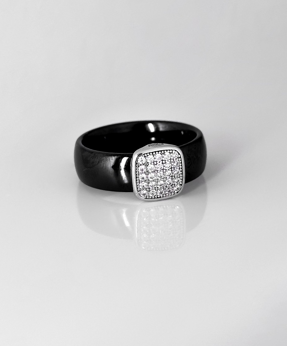 Каблучка срібна з чорною керамікою і цирконієм діамантової огранки 000690