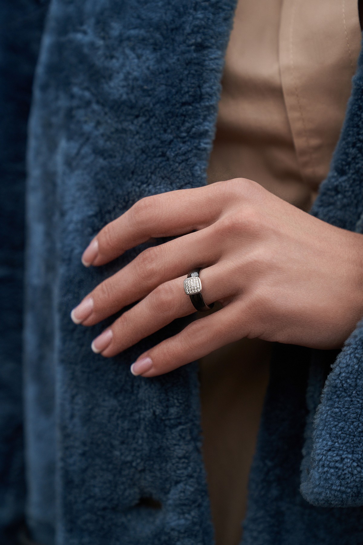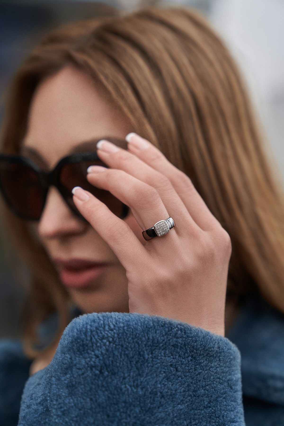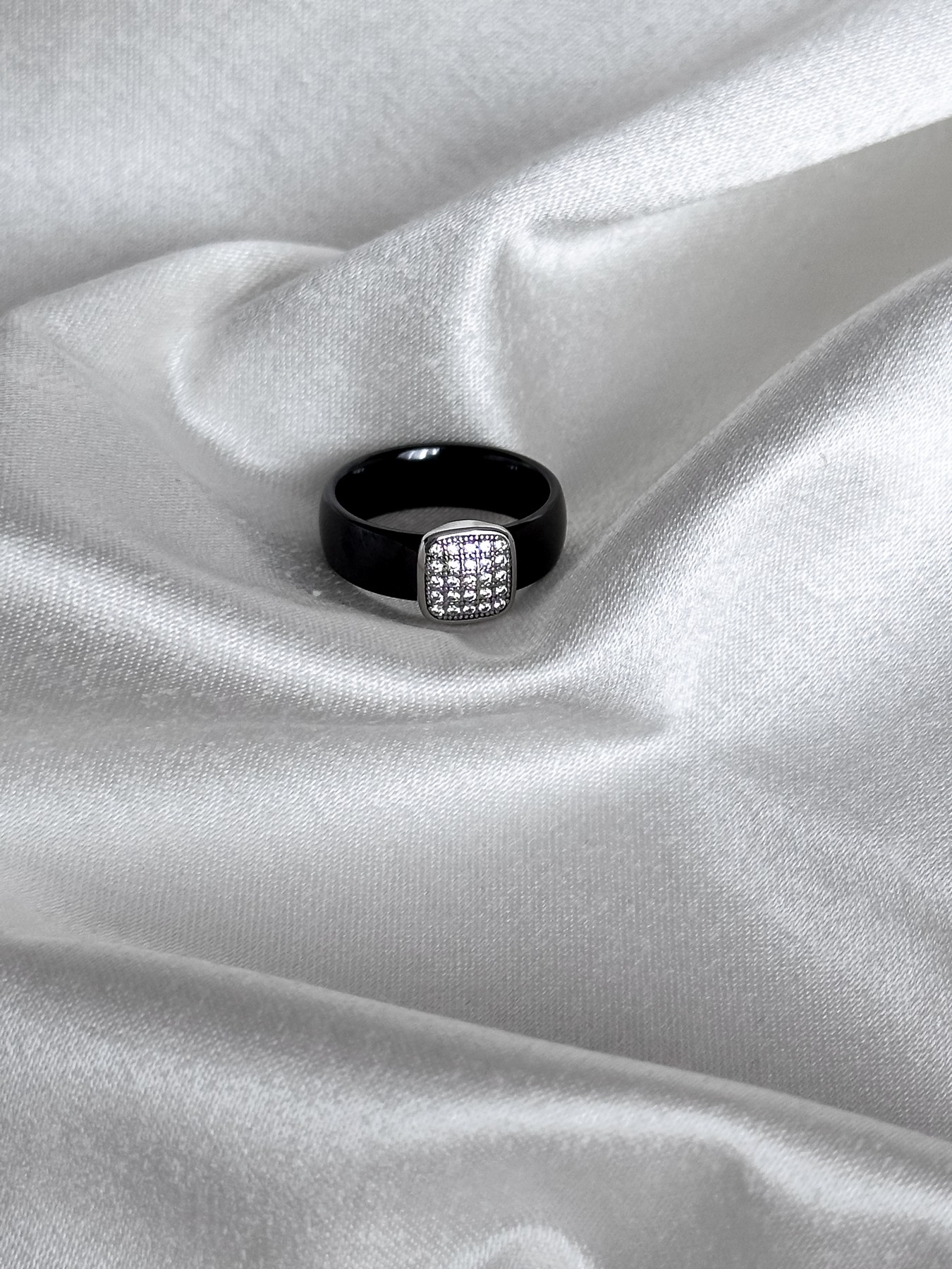 Каблучка срібна з чорною керамікою і цирконієм діамантової огранки 000690