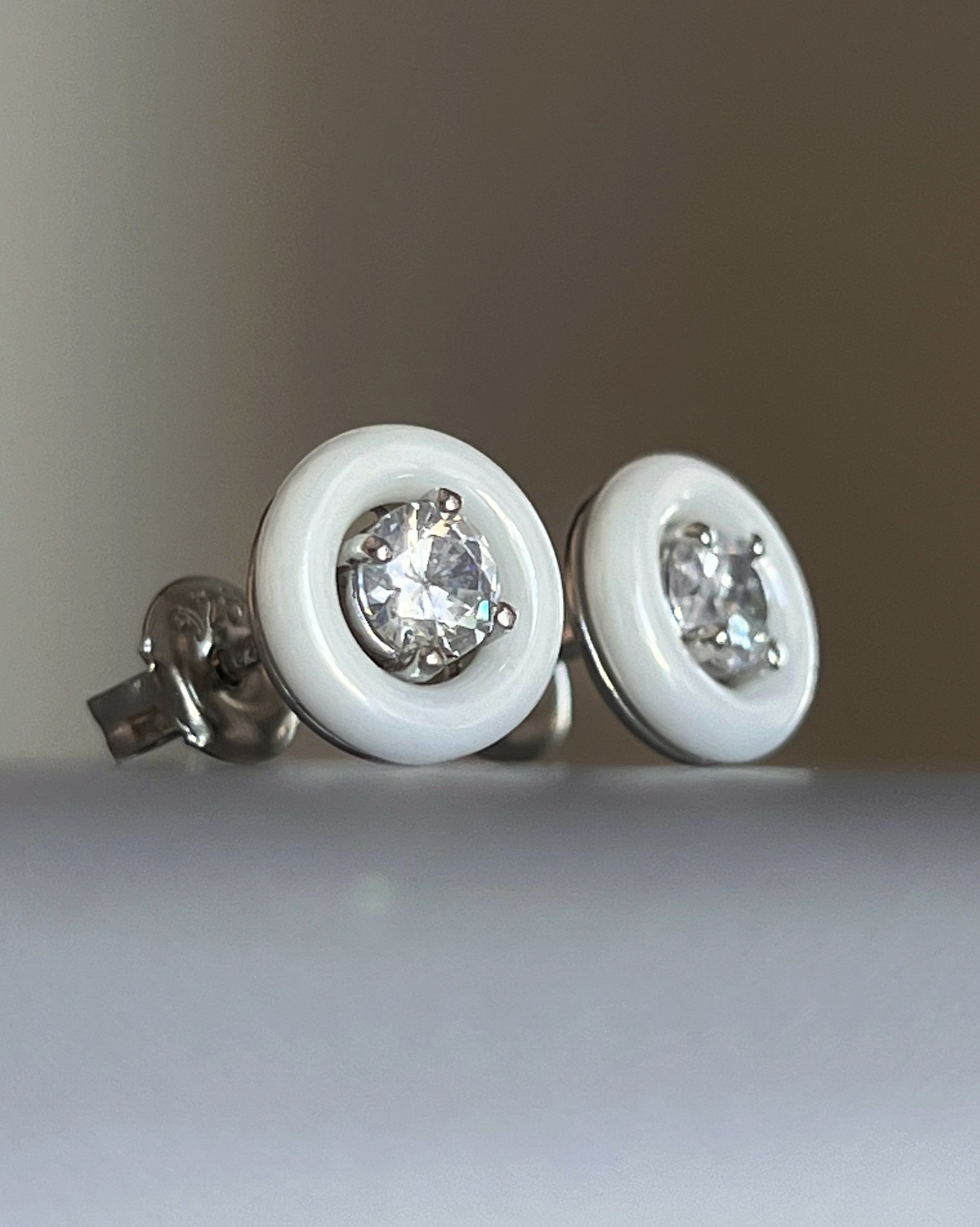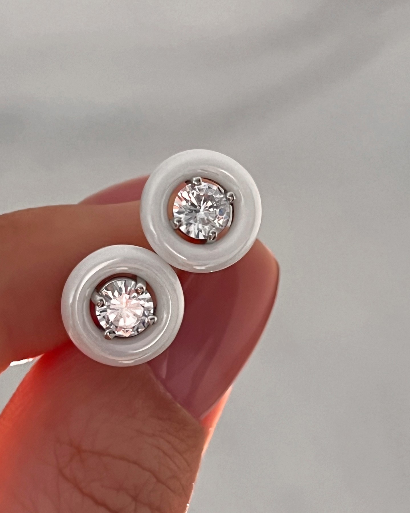 Сережки - пусети (гвоздики) срібні з білою керамікою і цирконієм діамантового огранювання 006679