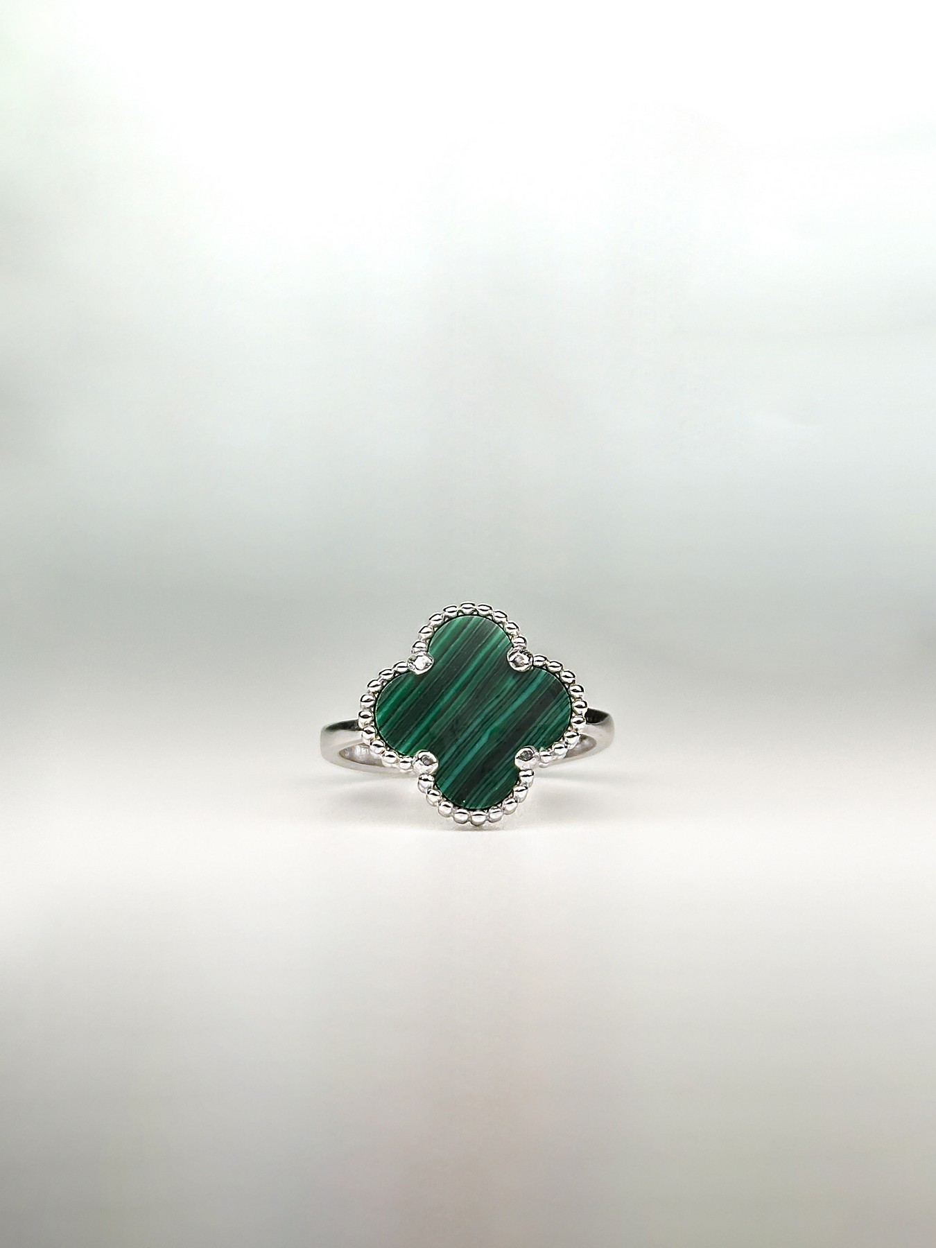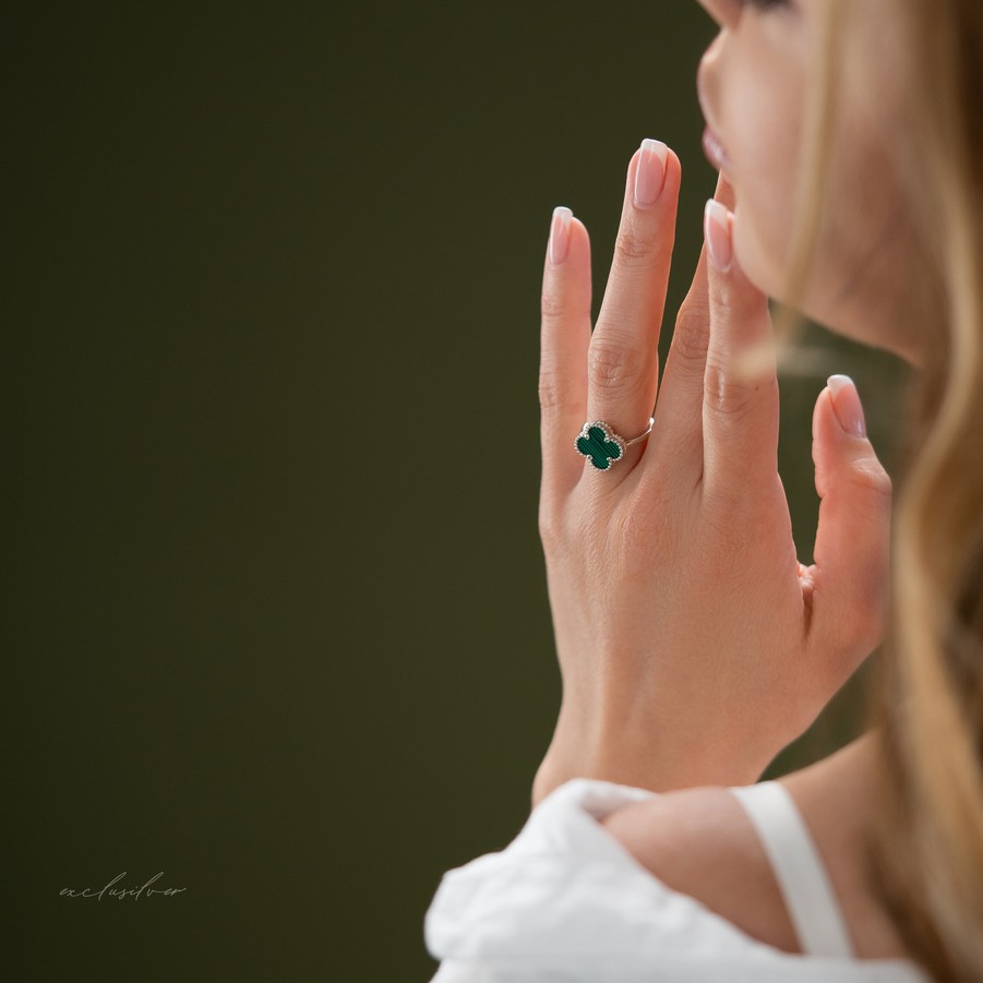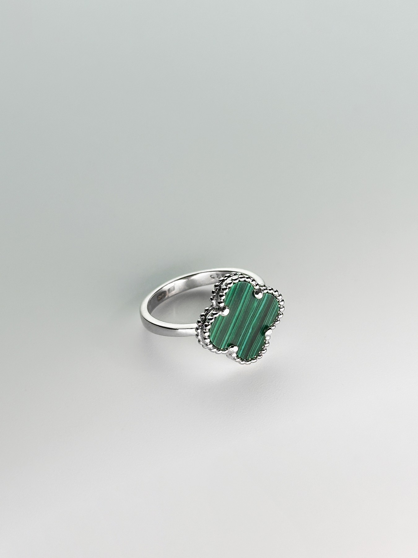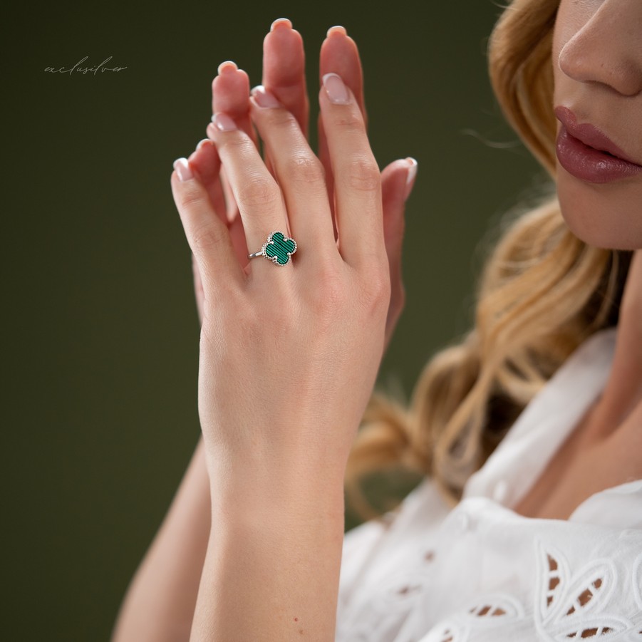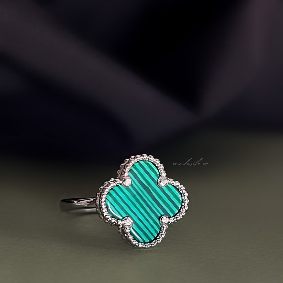 Каблучка срібна з малахітом Клевер 1,5см 006714