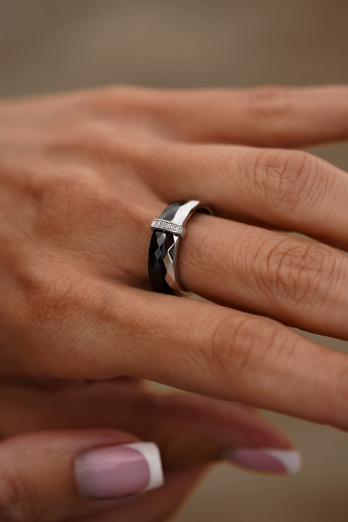 Каблучка срібна з чорною керамікою і цирконієм діамантової огранки 006718