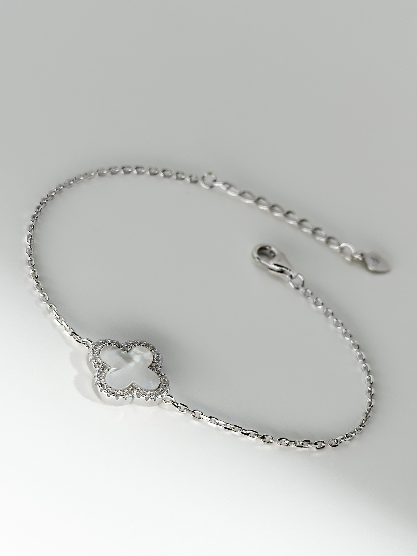 Браслет срібний з перламутром і цирконієм діамантового огранювання Клевер 1,5см 000014