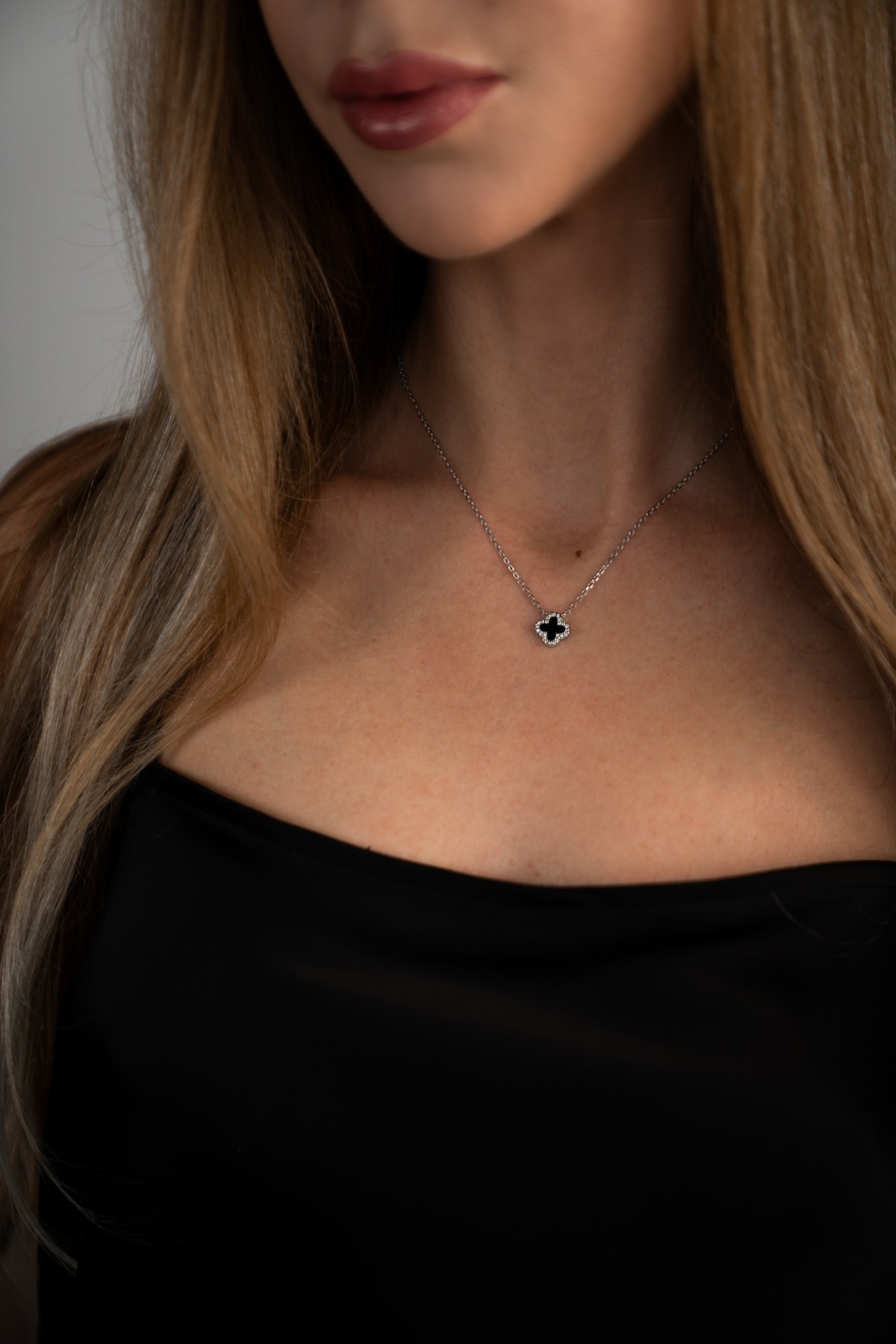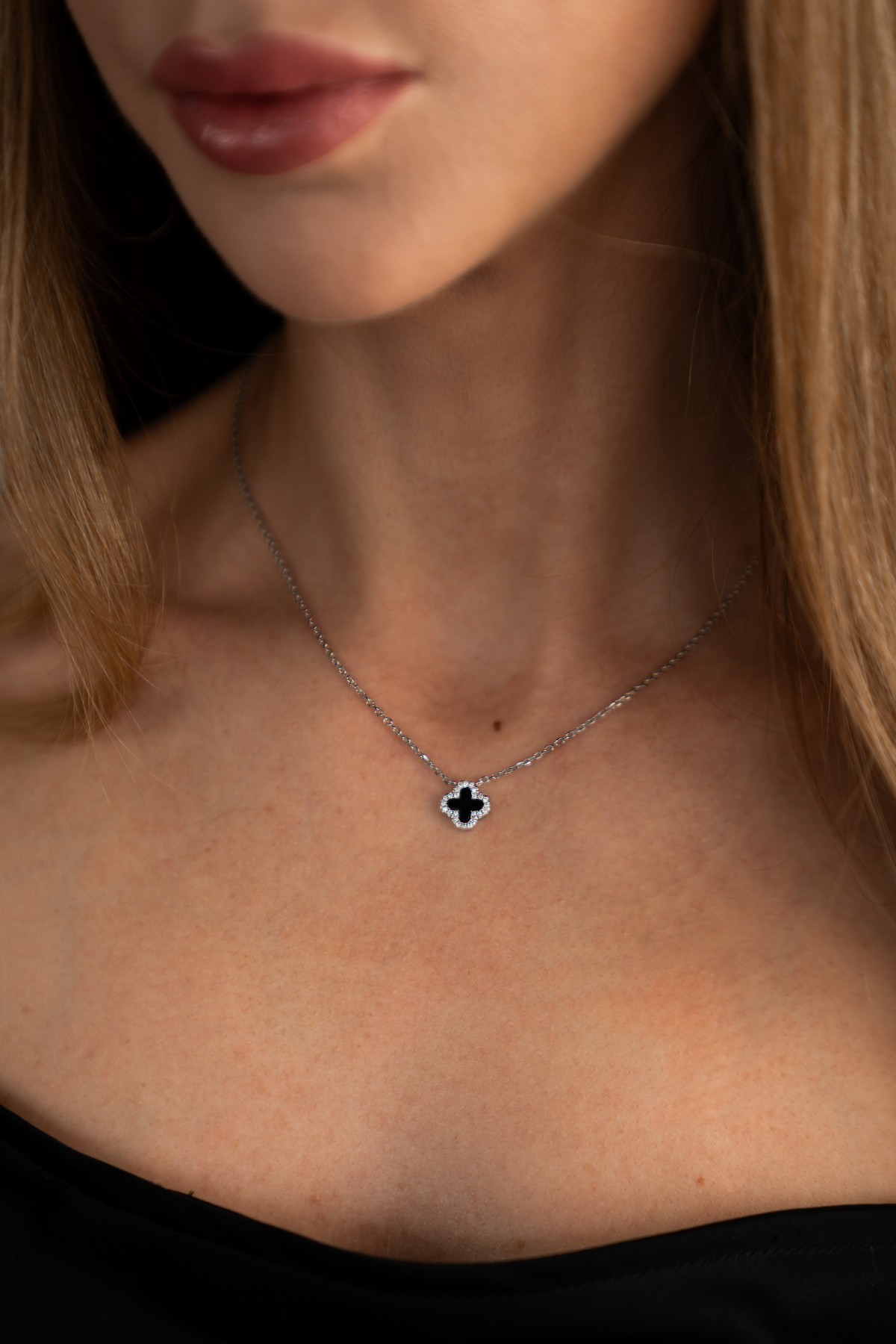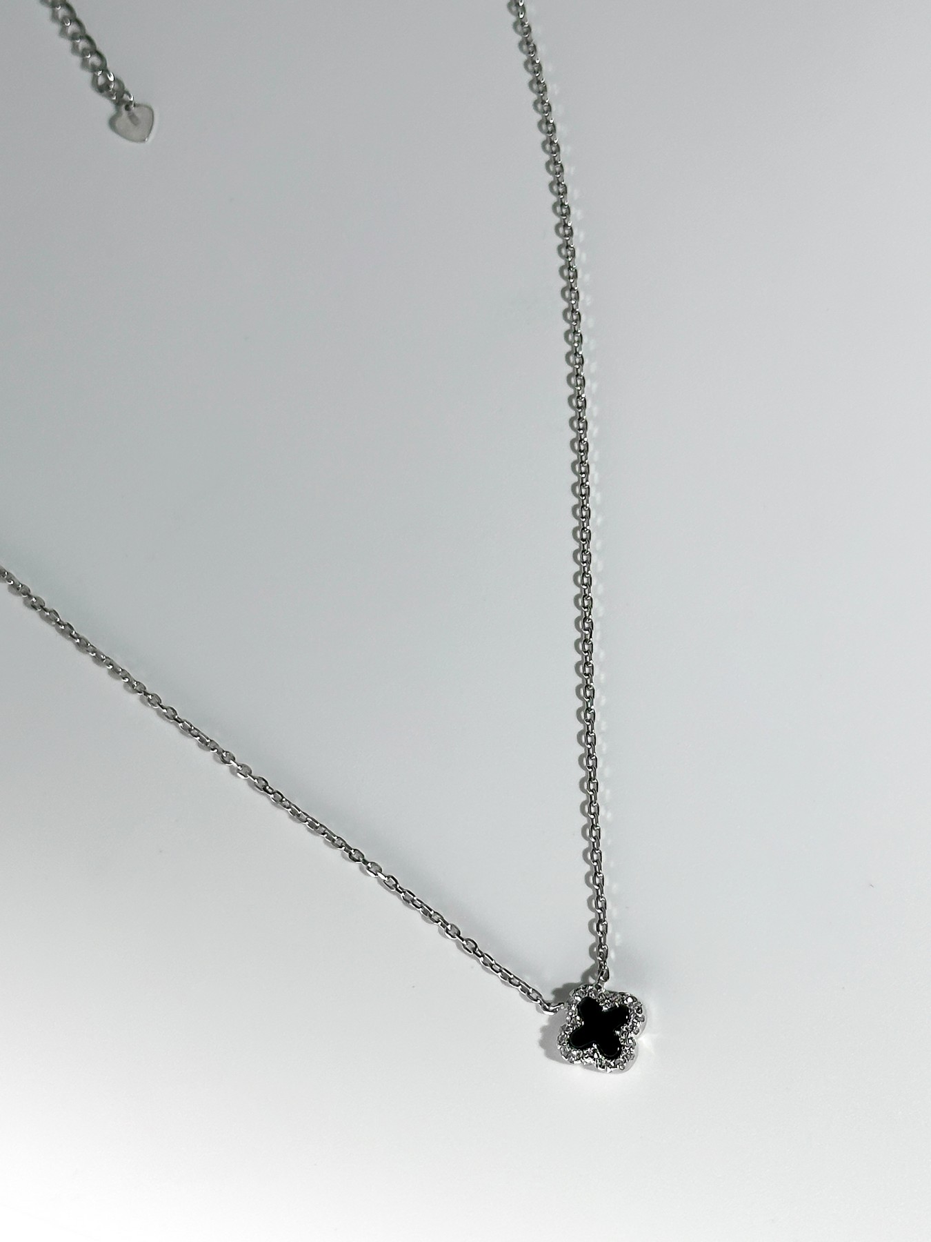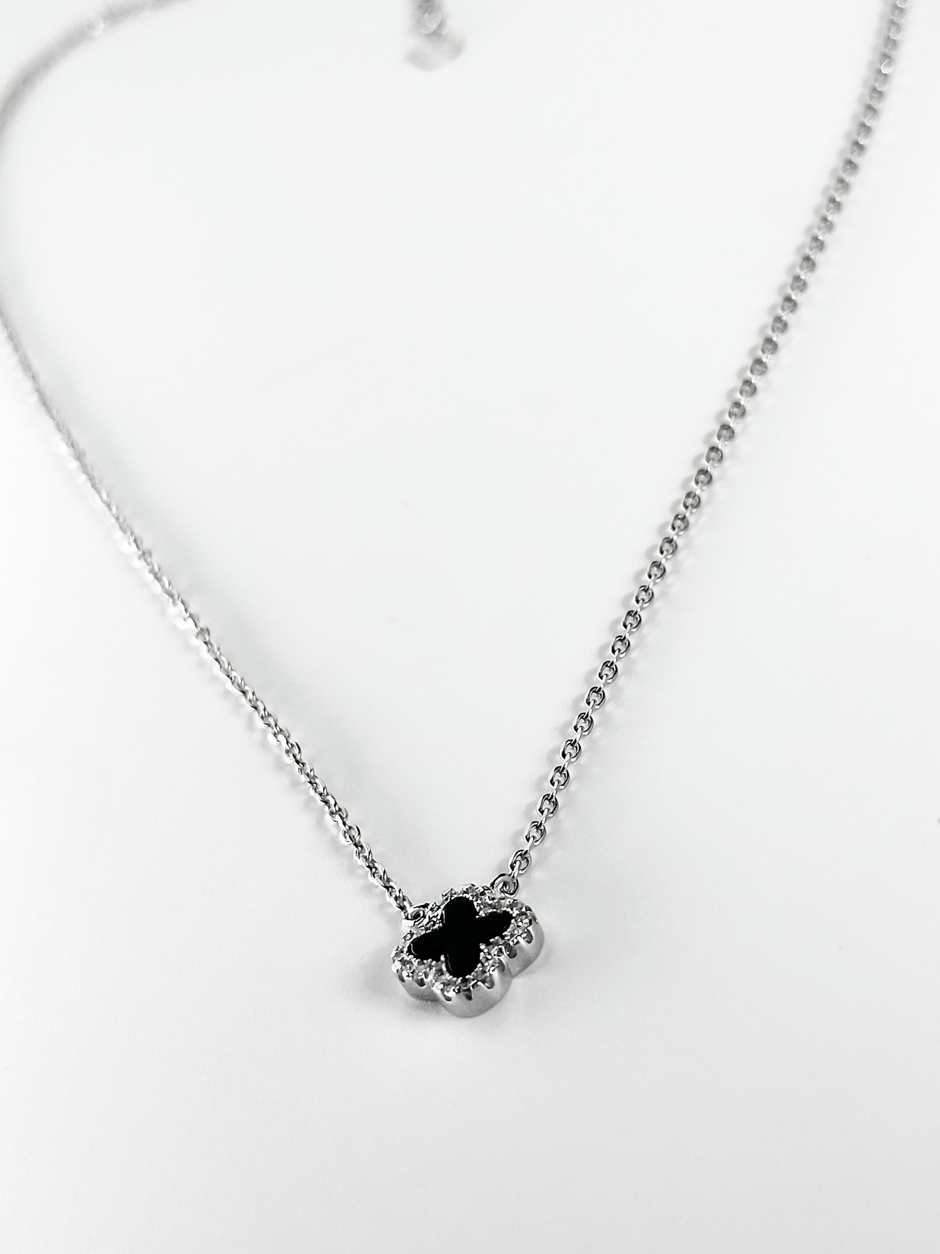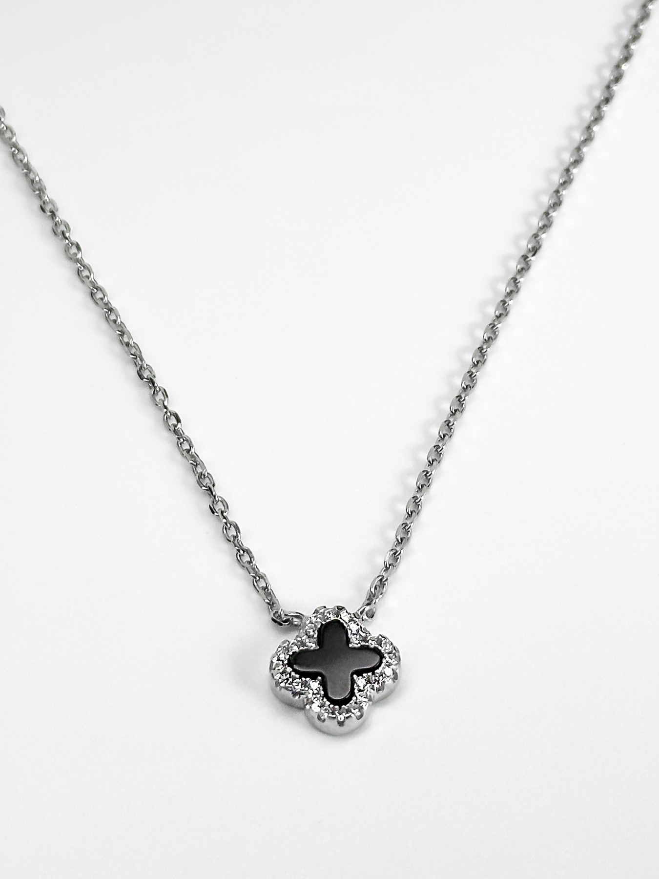 Кольє срібне з оніксом та цирконієм діамантового огранювання Клевер 1см 005109