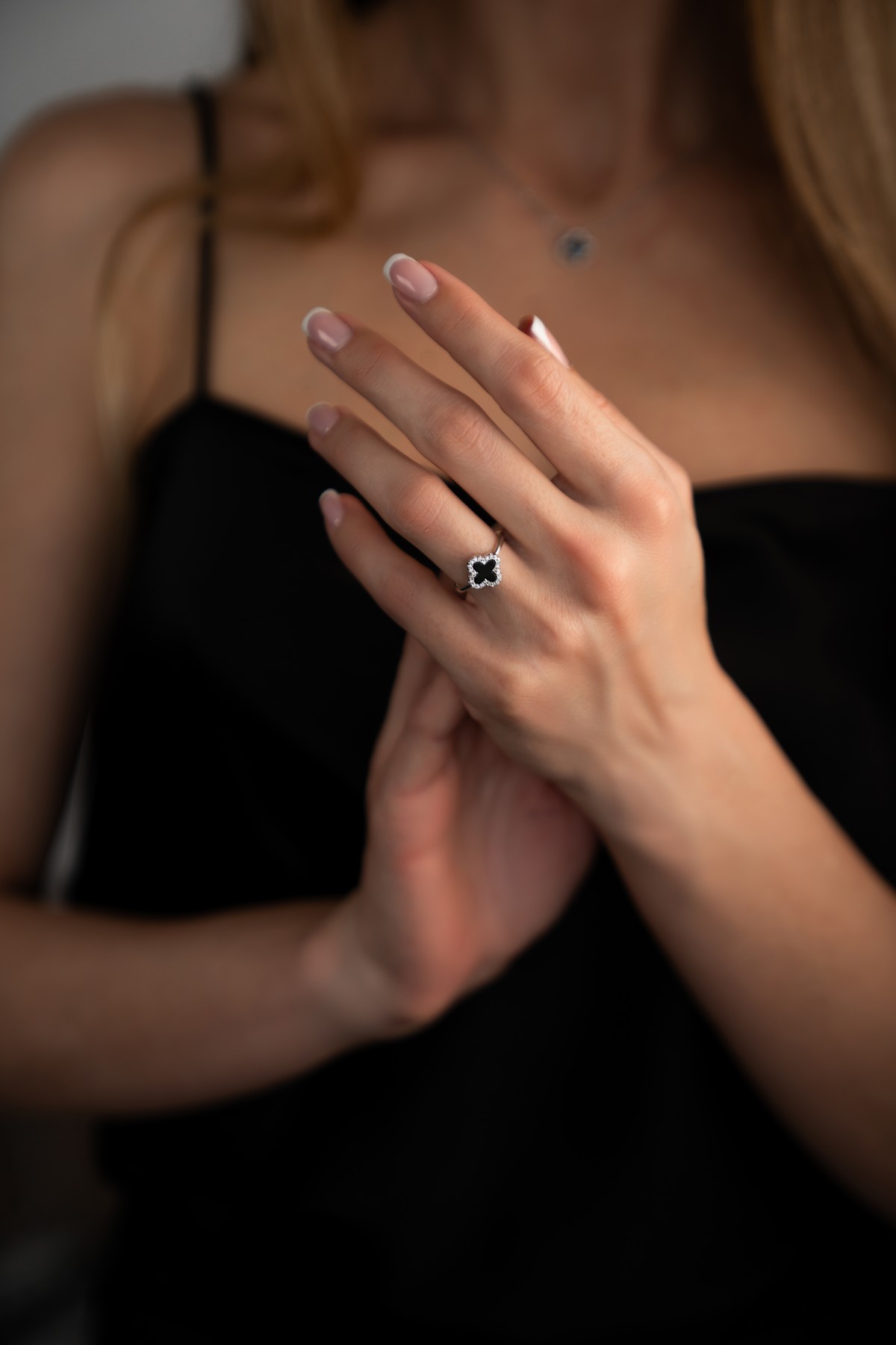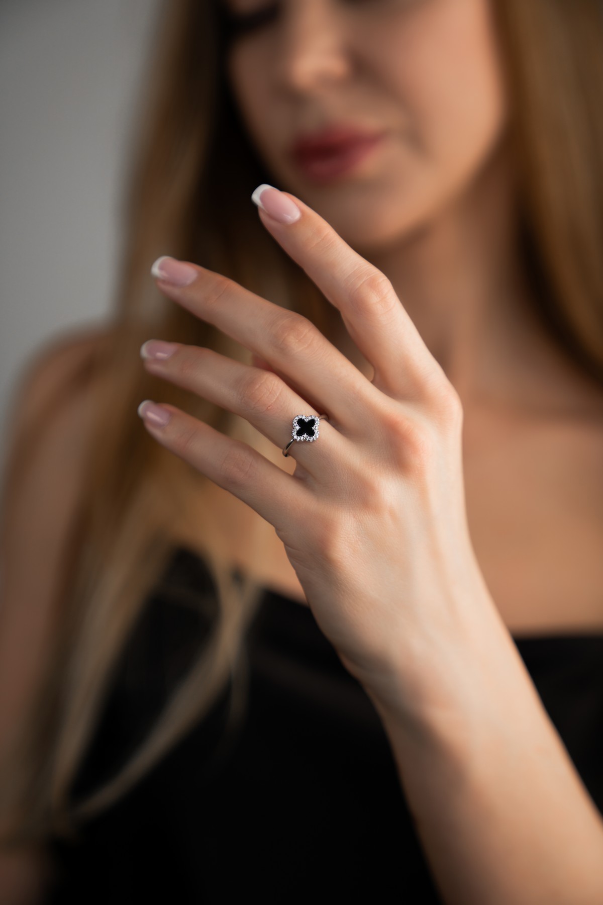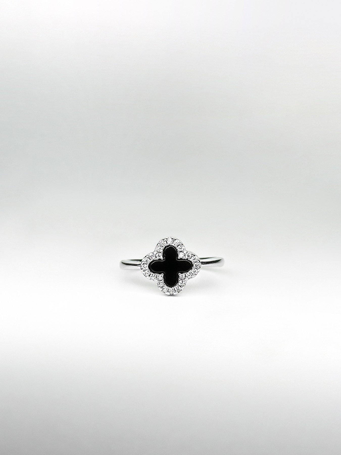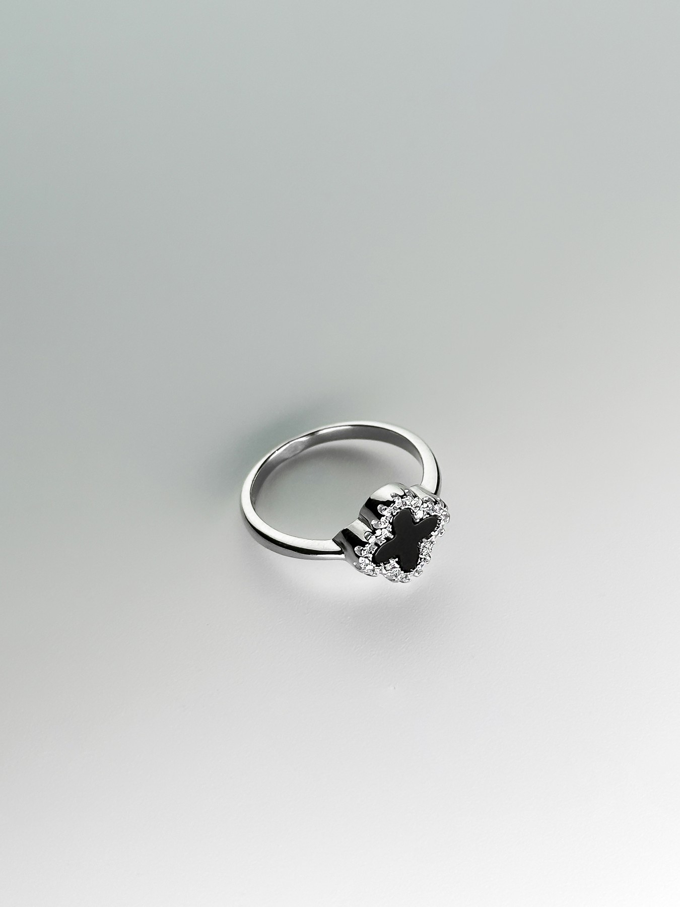 Каблучка срібна з оніксом і цирконієм діамантового огранювання Клевер 1см 001844