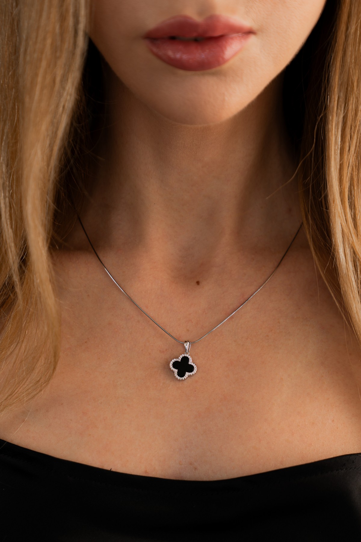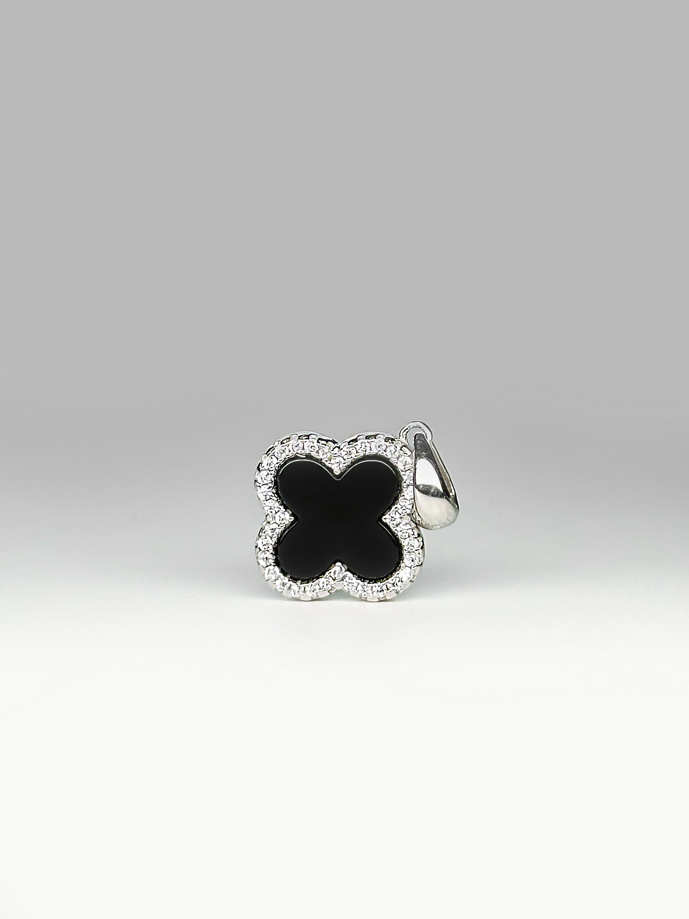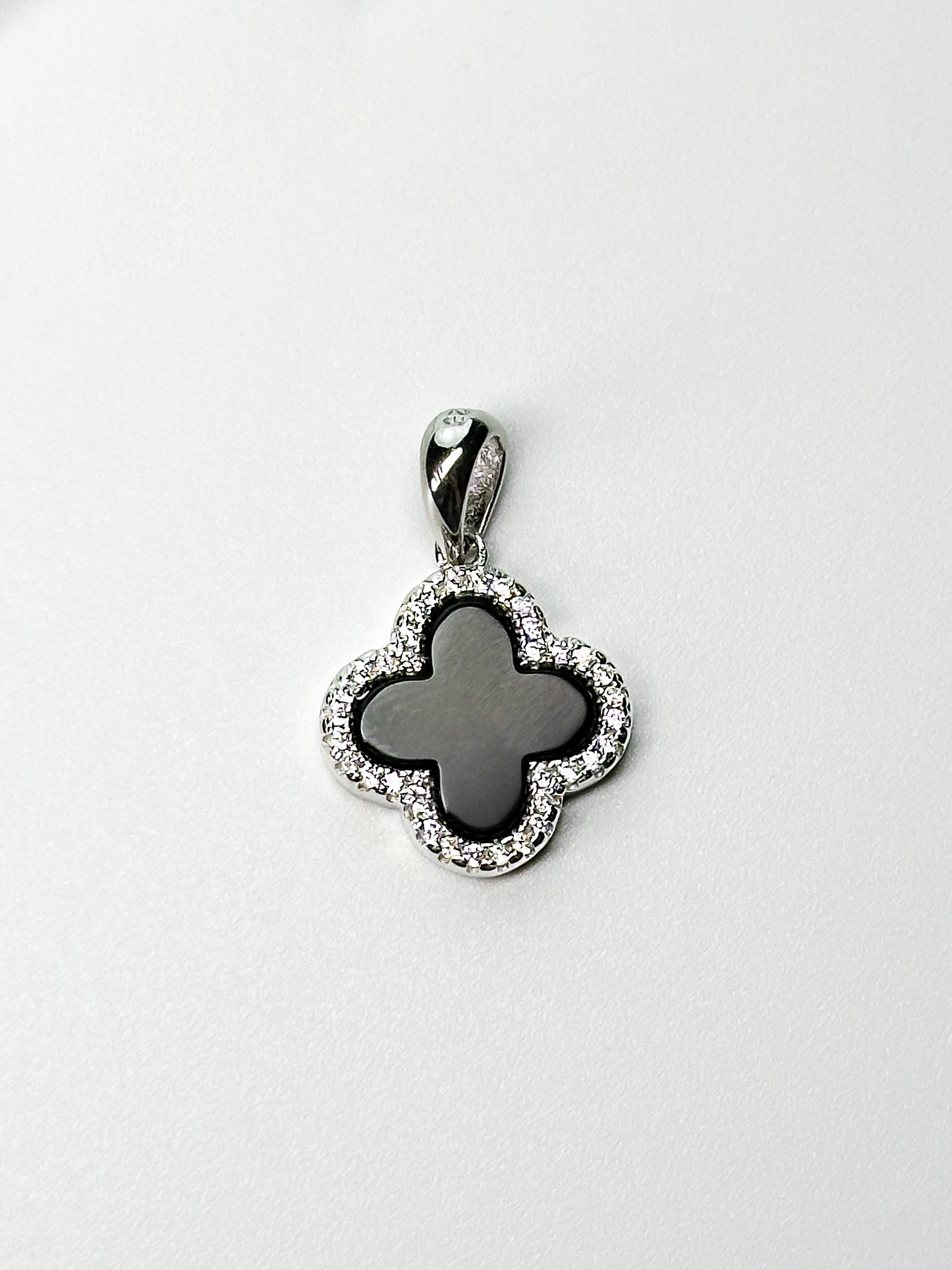 Підвіс срібний з оніксом та цирконієм діамантового огранювання Клевер 1,5см 002144