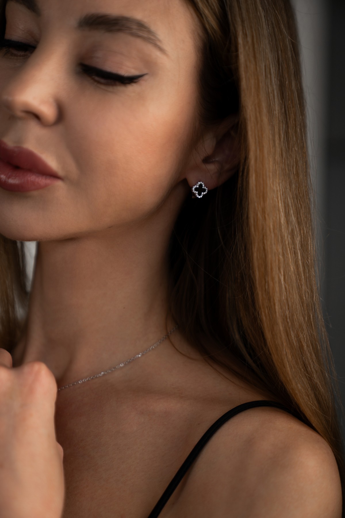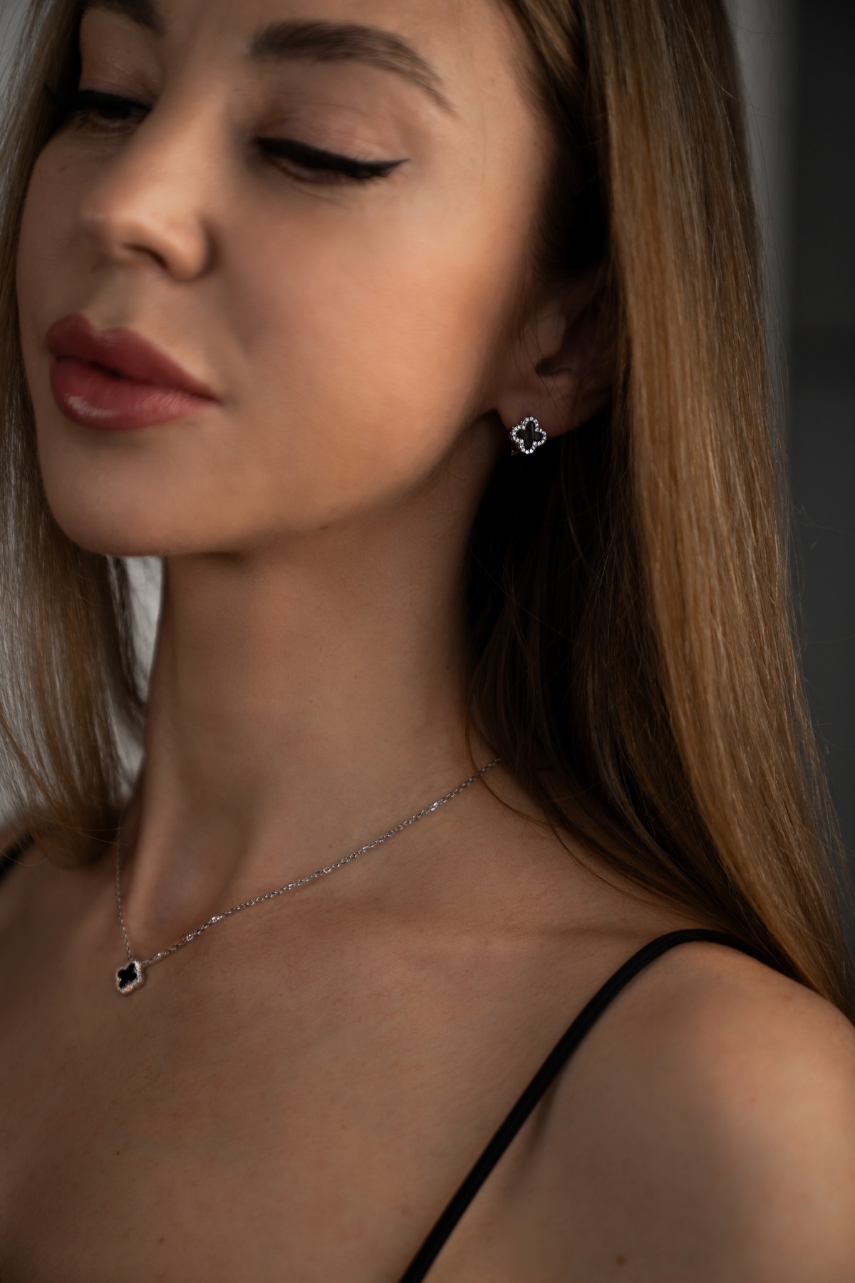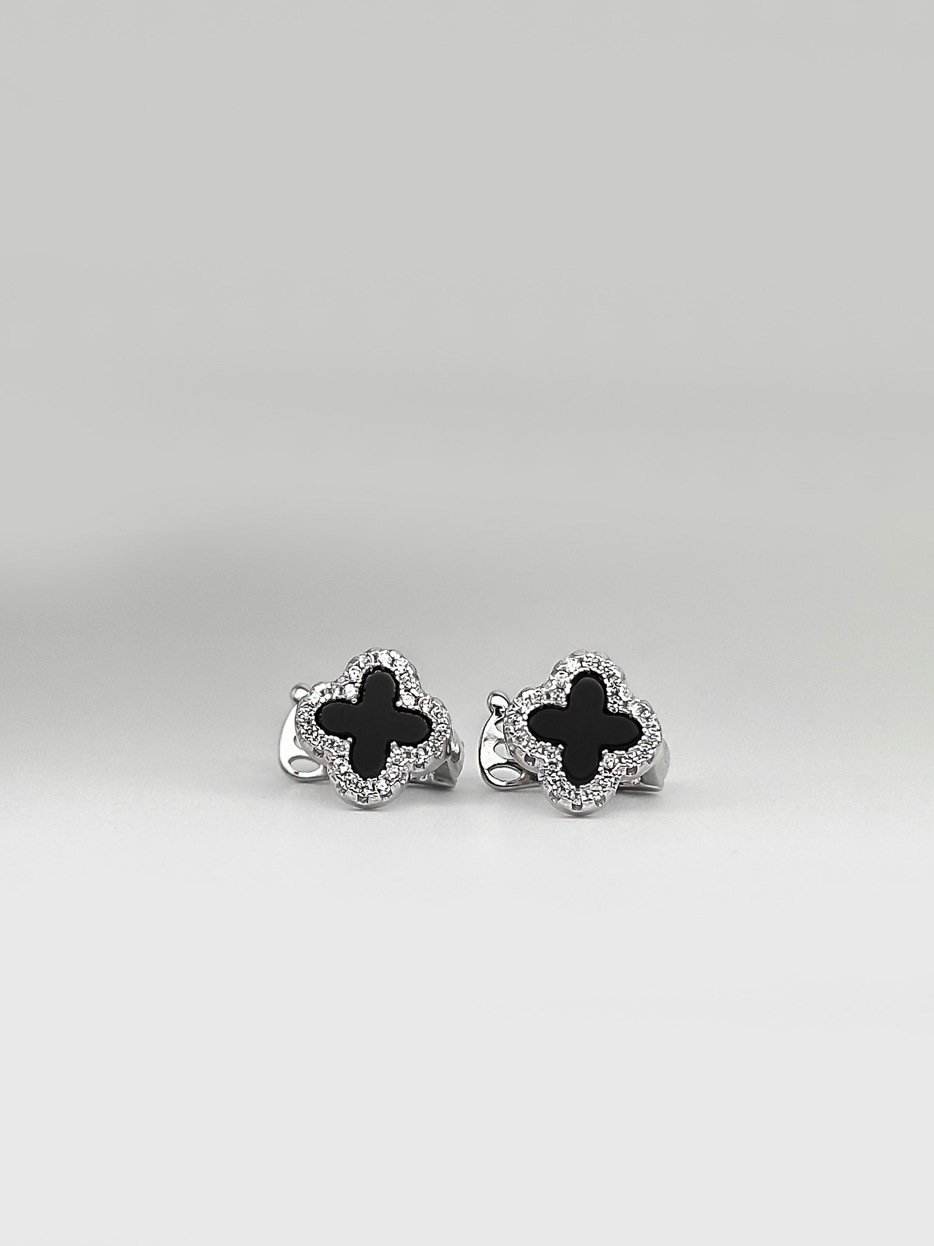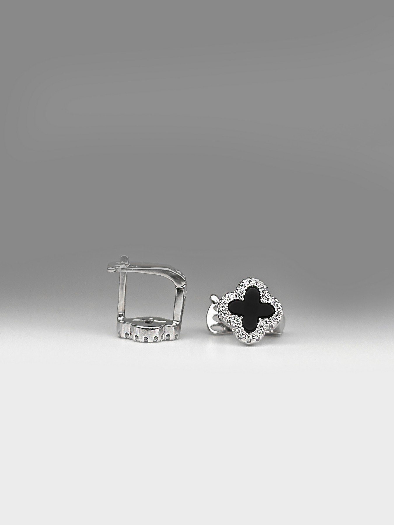 Cрібні сережки з оніксом та цирконієм діамантового огранювання Клевер 1см 002606