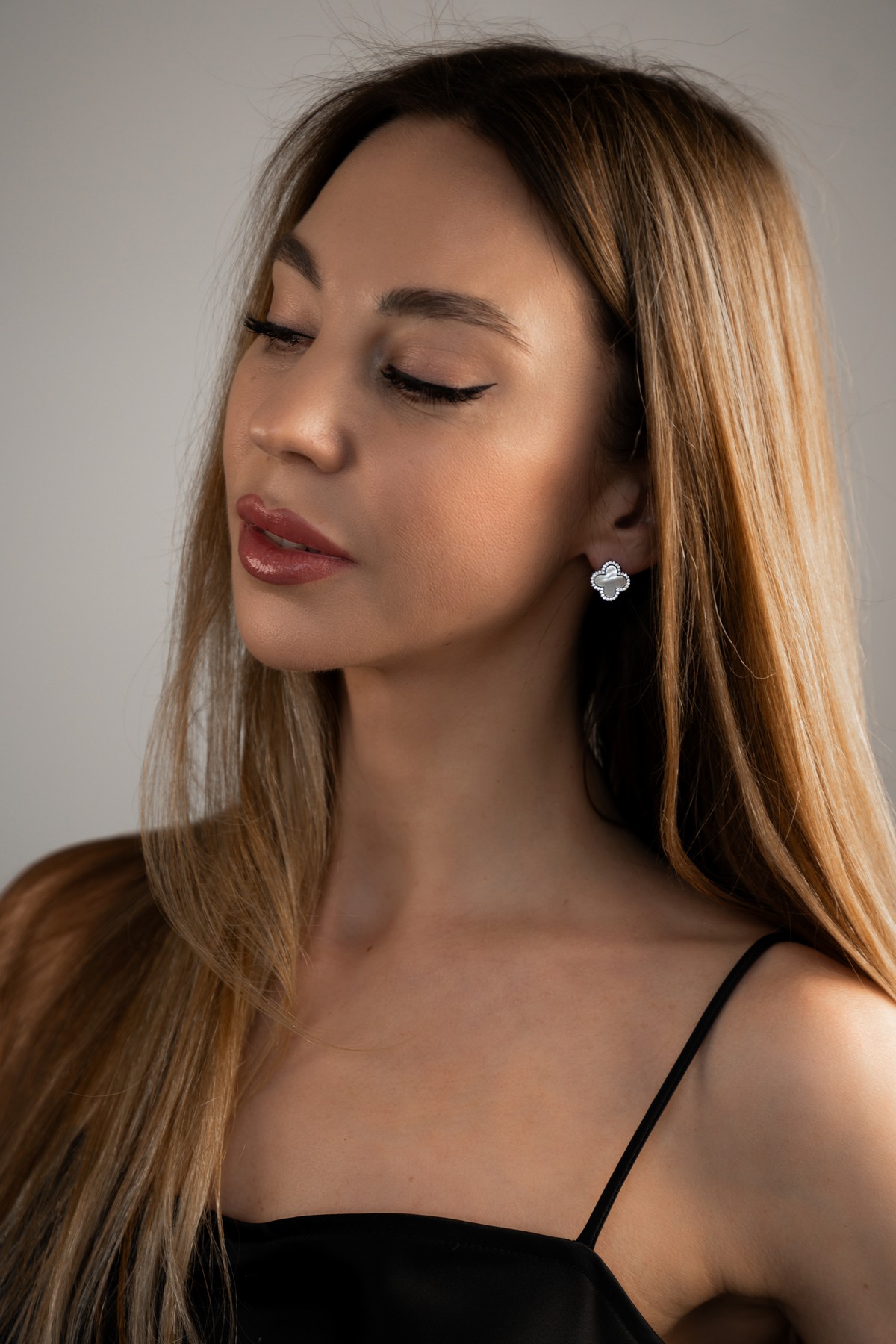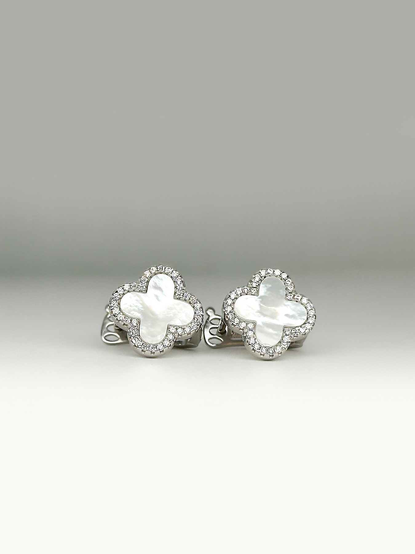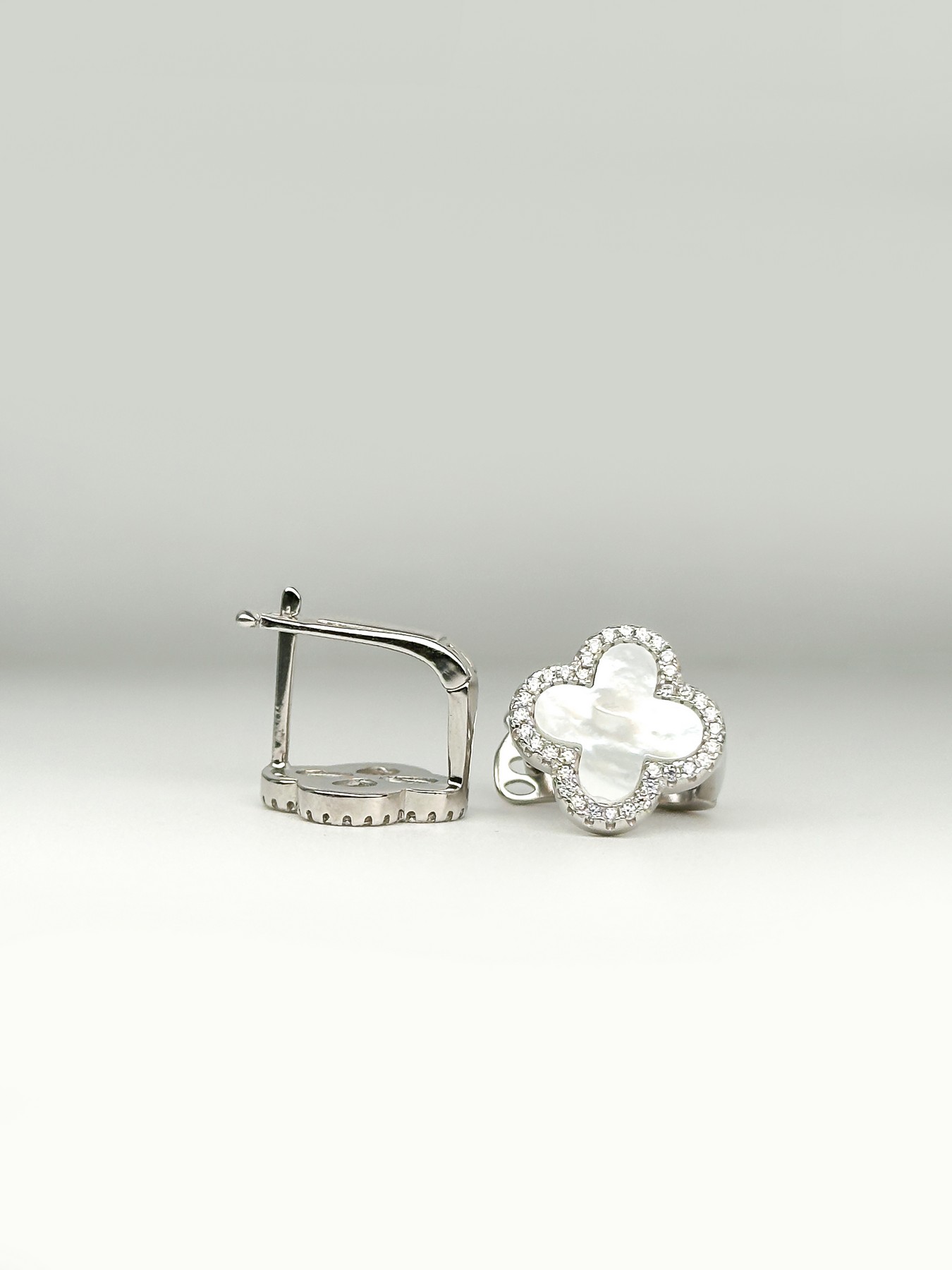 Сережки срібні з перламутром та цирконієм діамантового огранювання Клевер 1,5см 002679