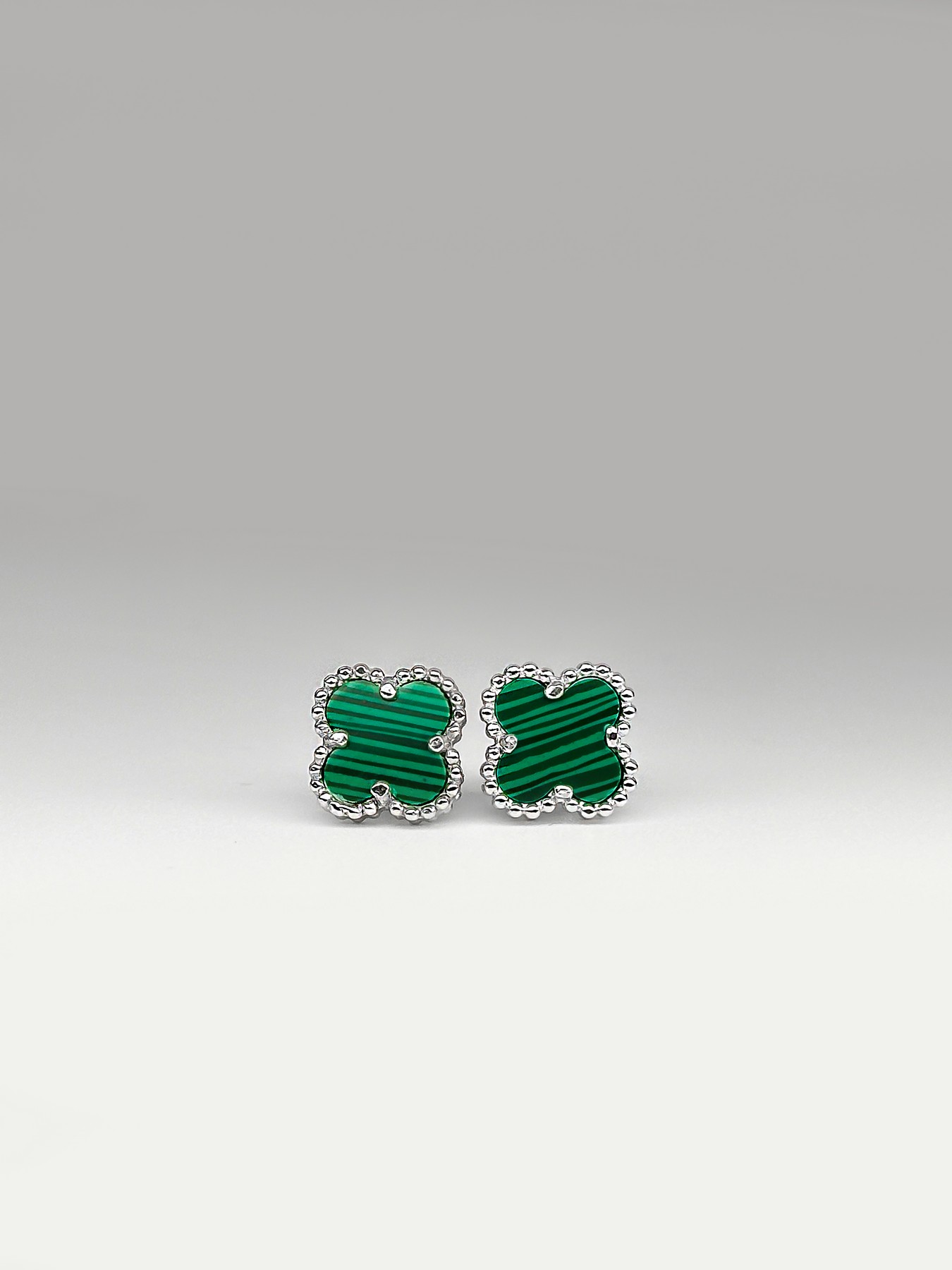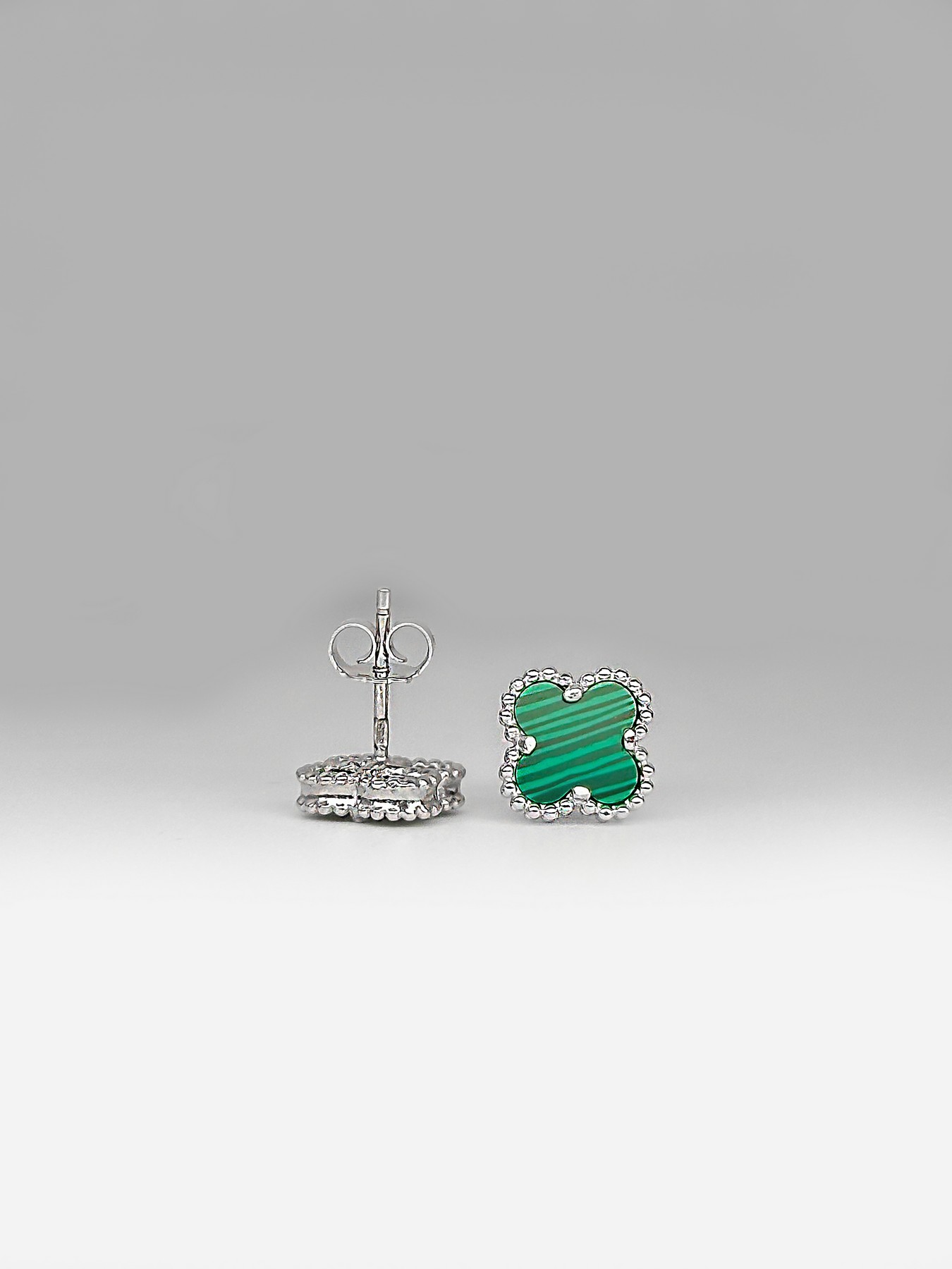Сережки - пусети (гвоздики) срібні з малахітом Клевер 1см 006545