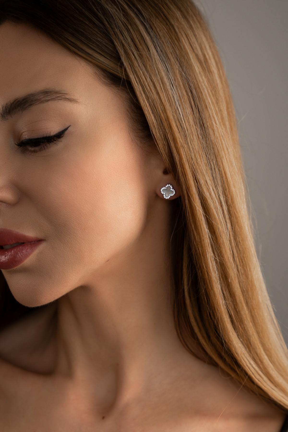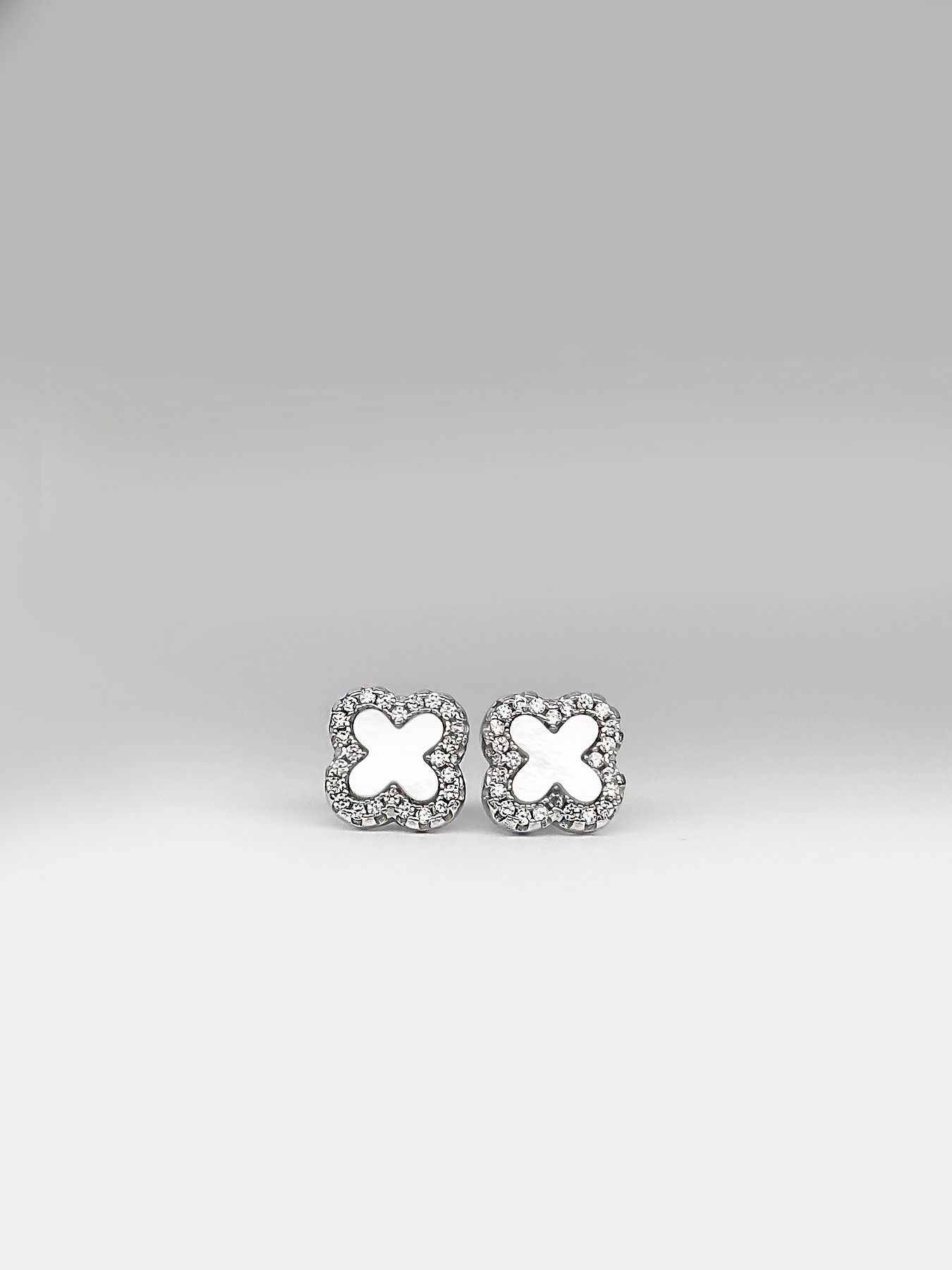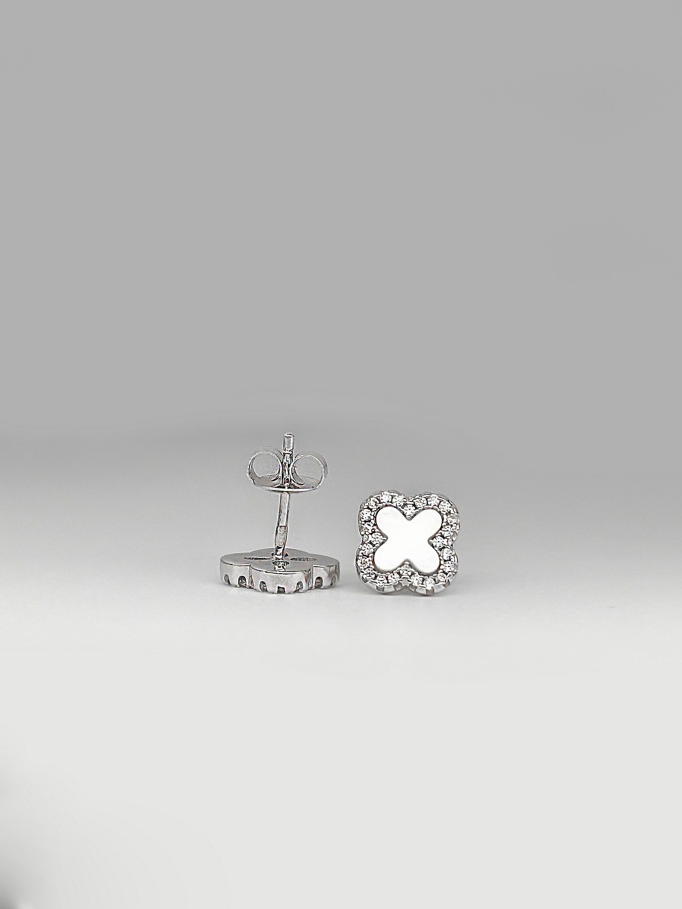 Срібні сережки - пусети з перламутром і цирконієм діамантового огранювання Клевер 1см