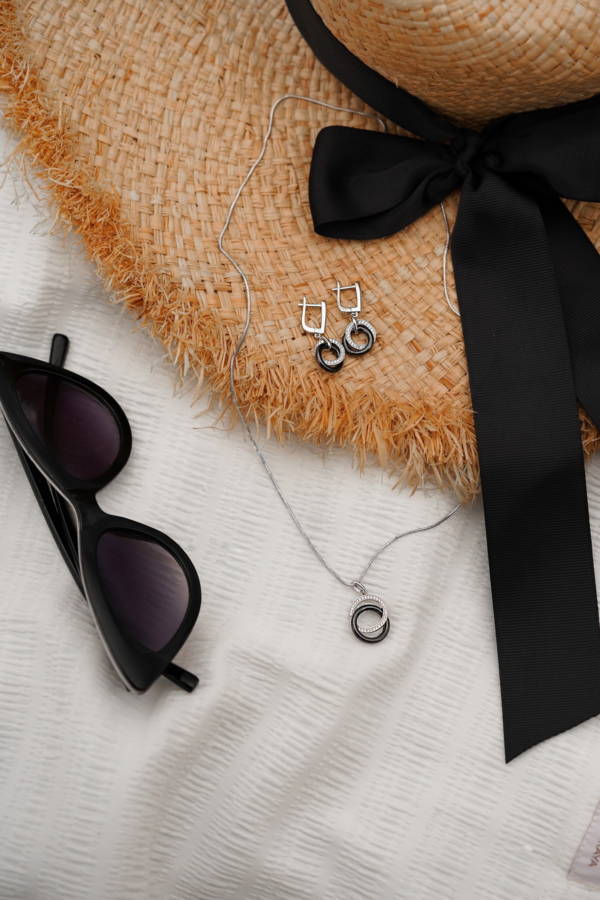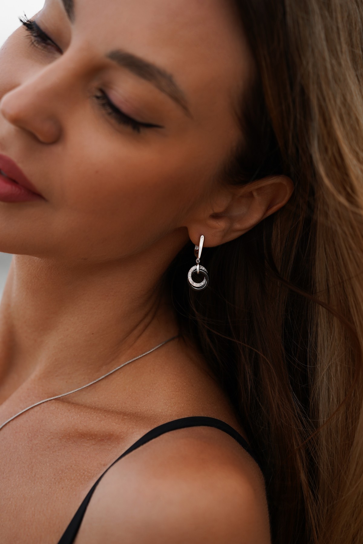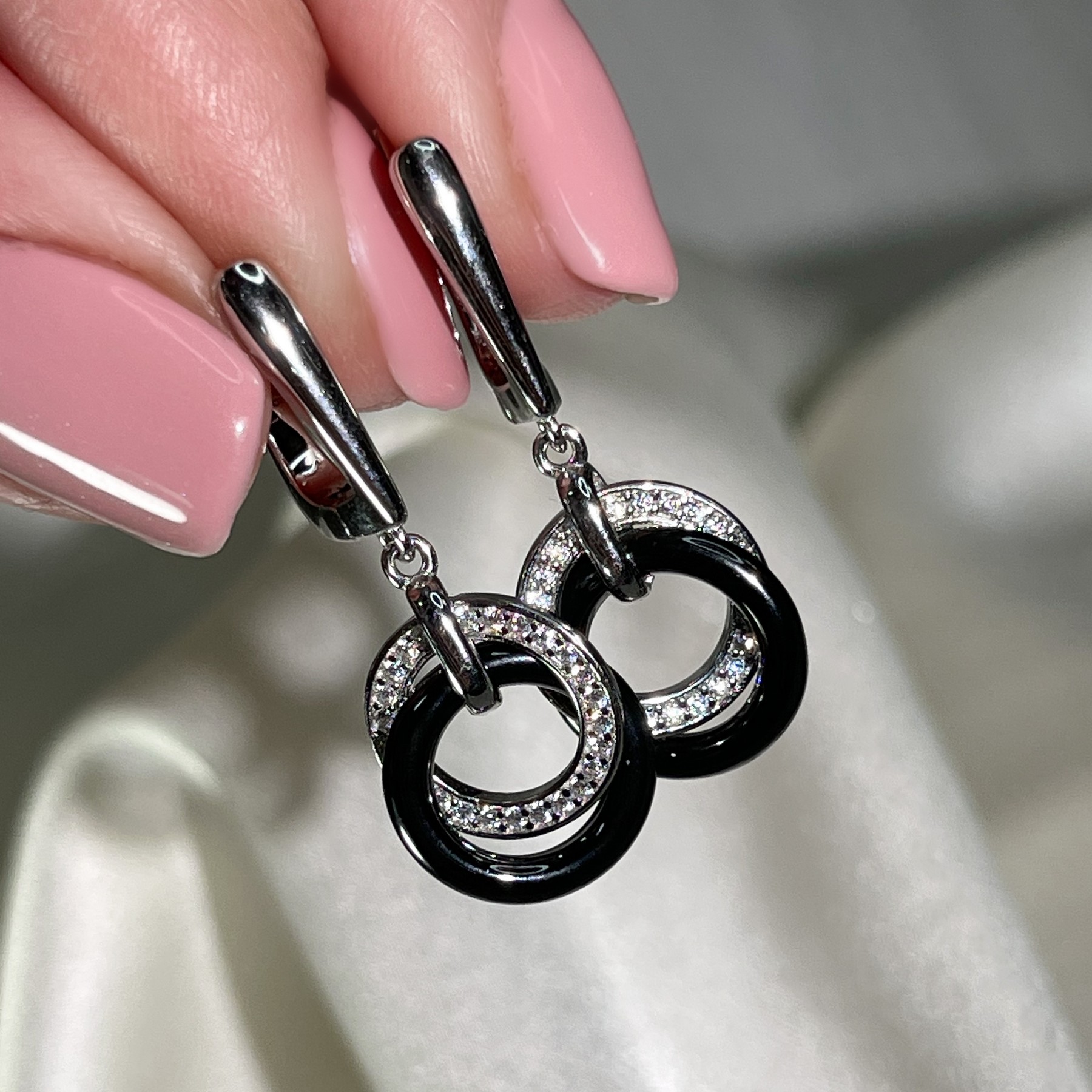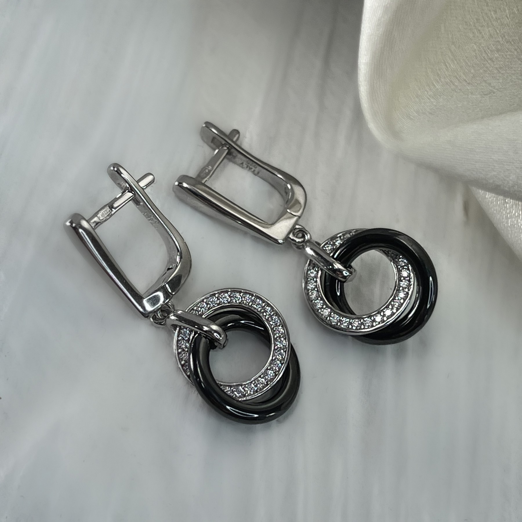 Срібні сережки з чорною керамікою та цирконієм діамантового огранювання 003351