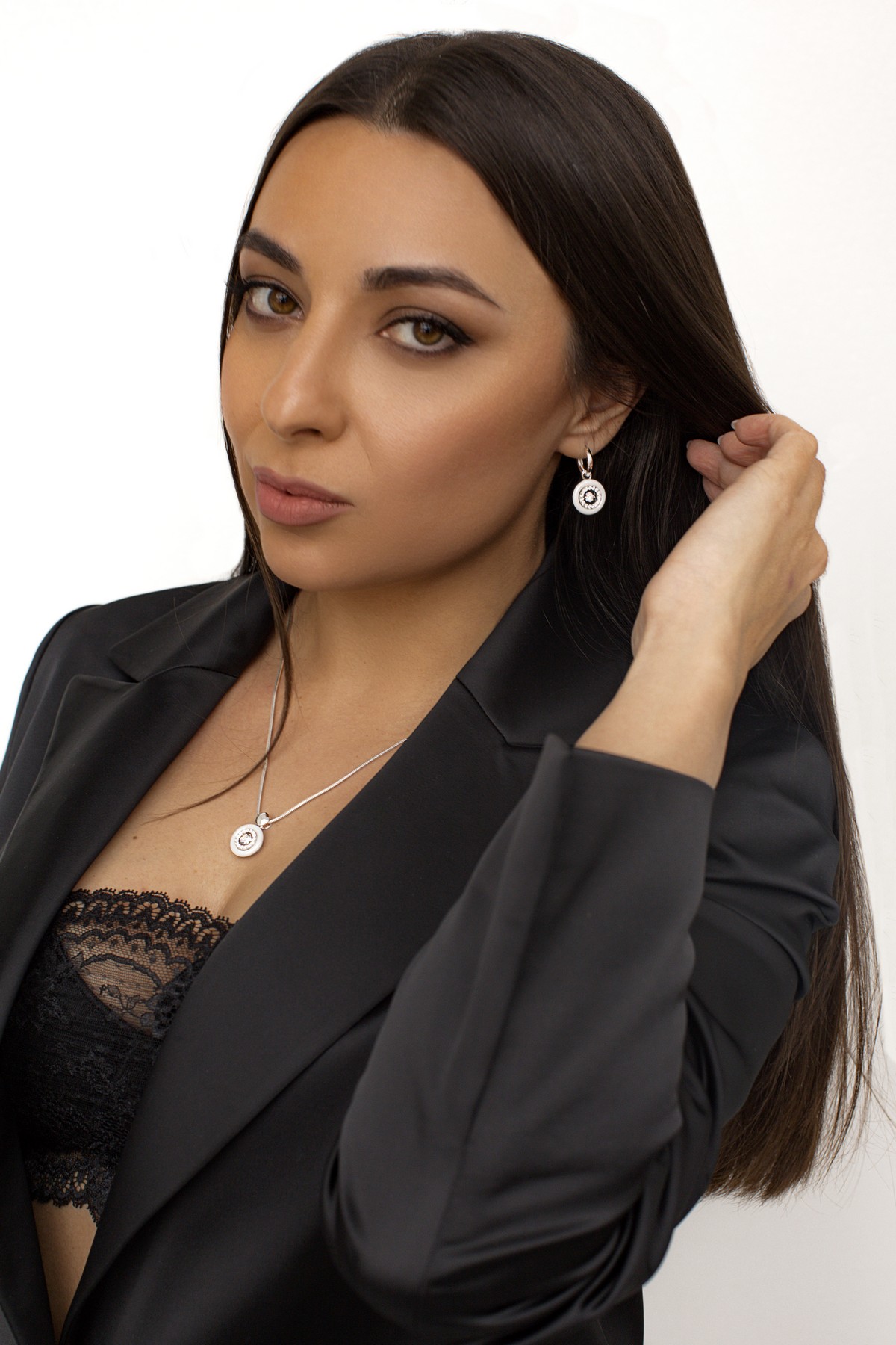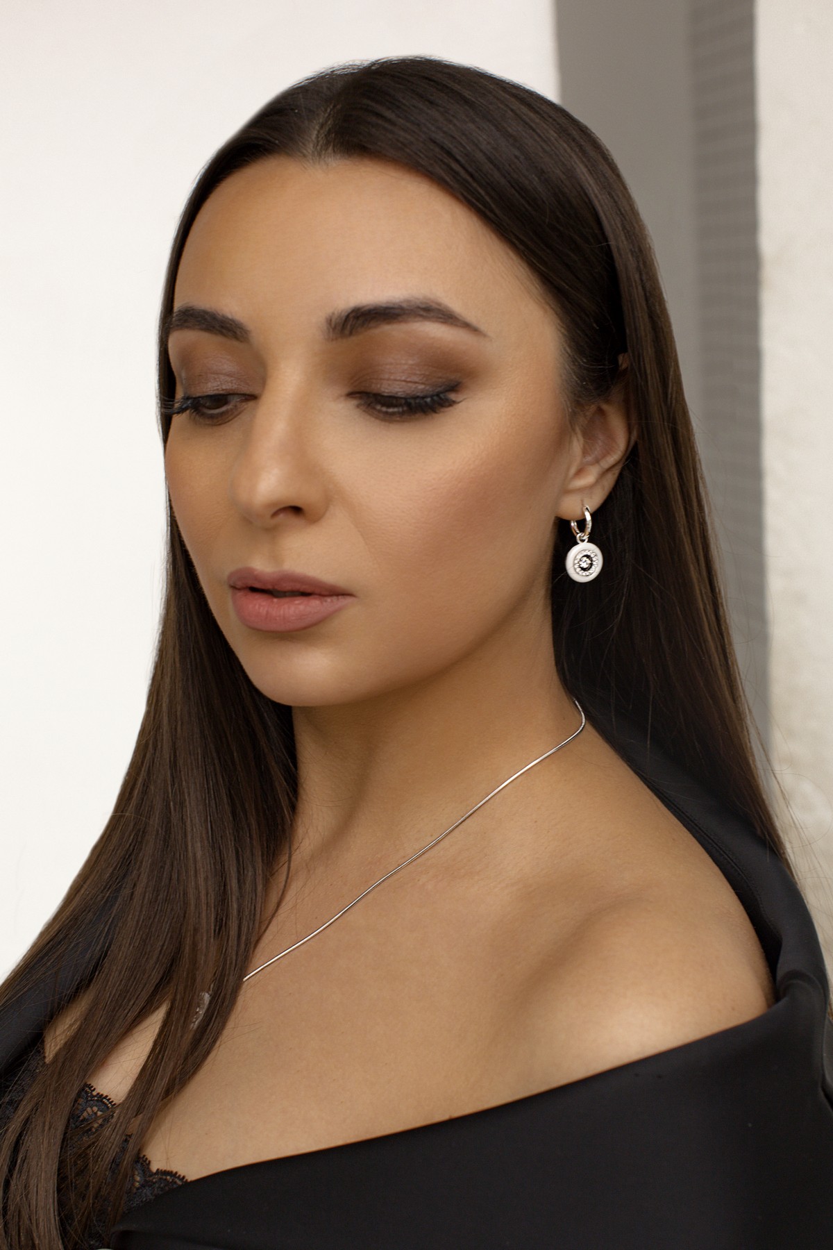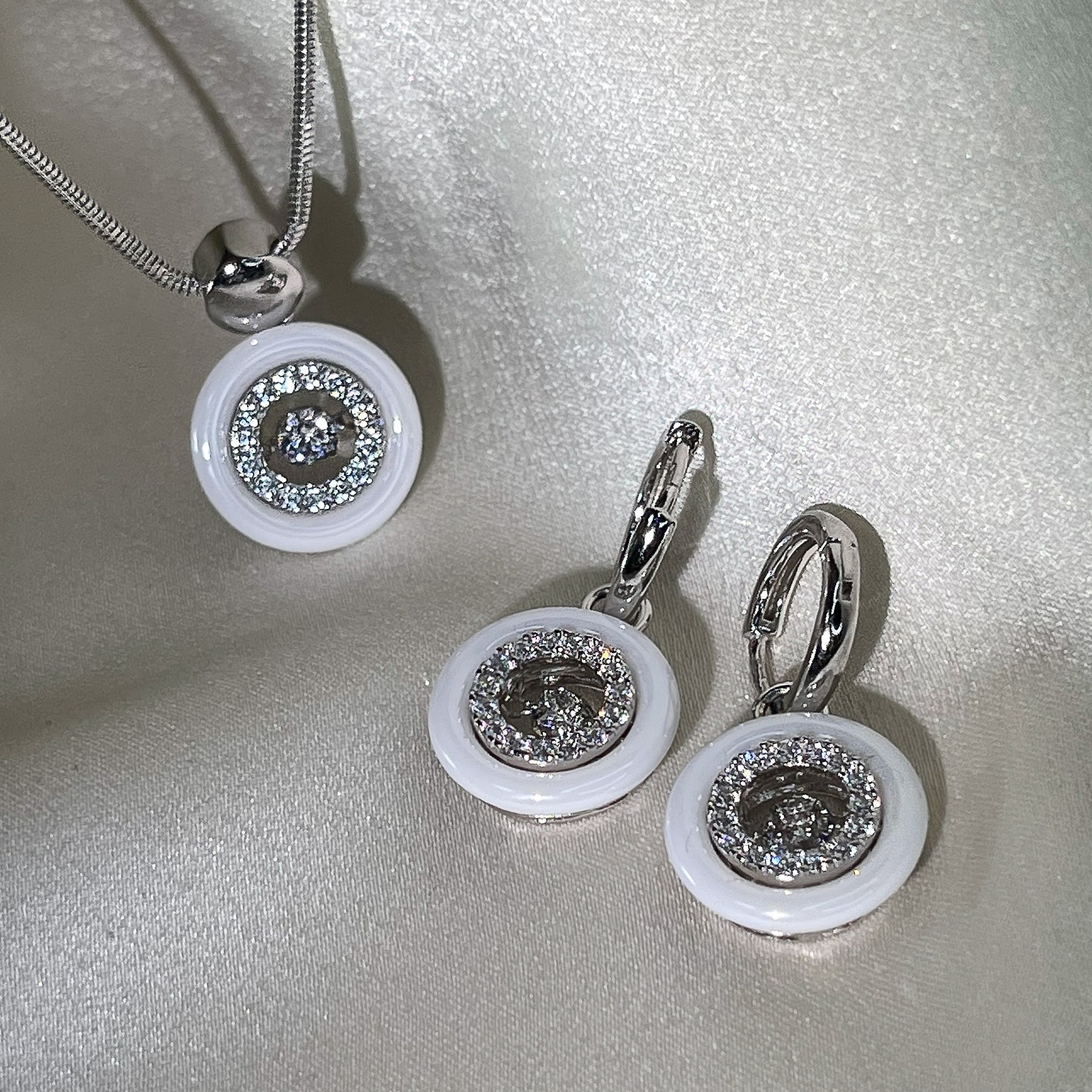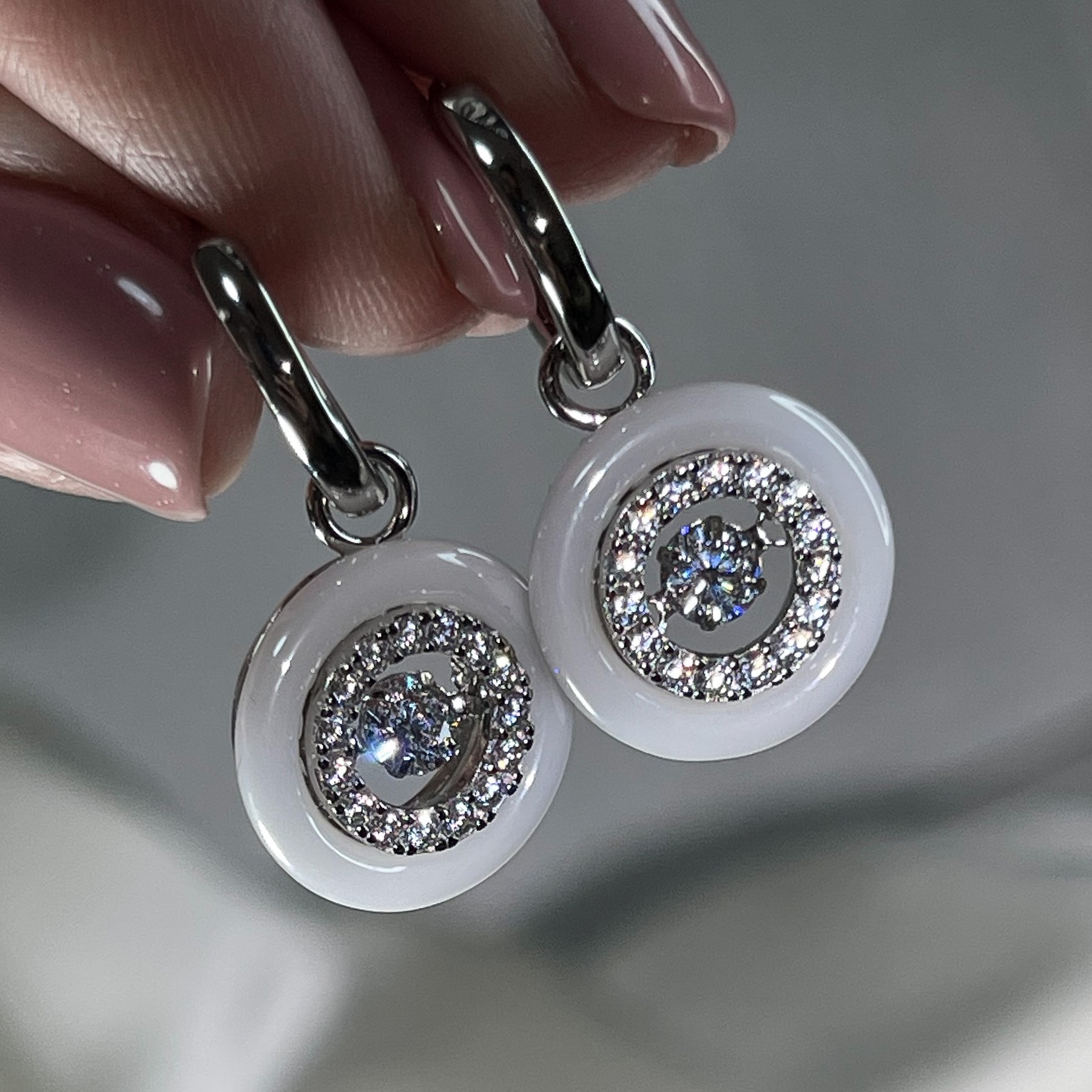 Срібні сережки з білою керамікою та танцюючим цирконієм діамантового огранювання 006782