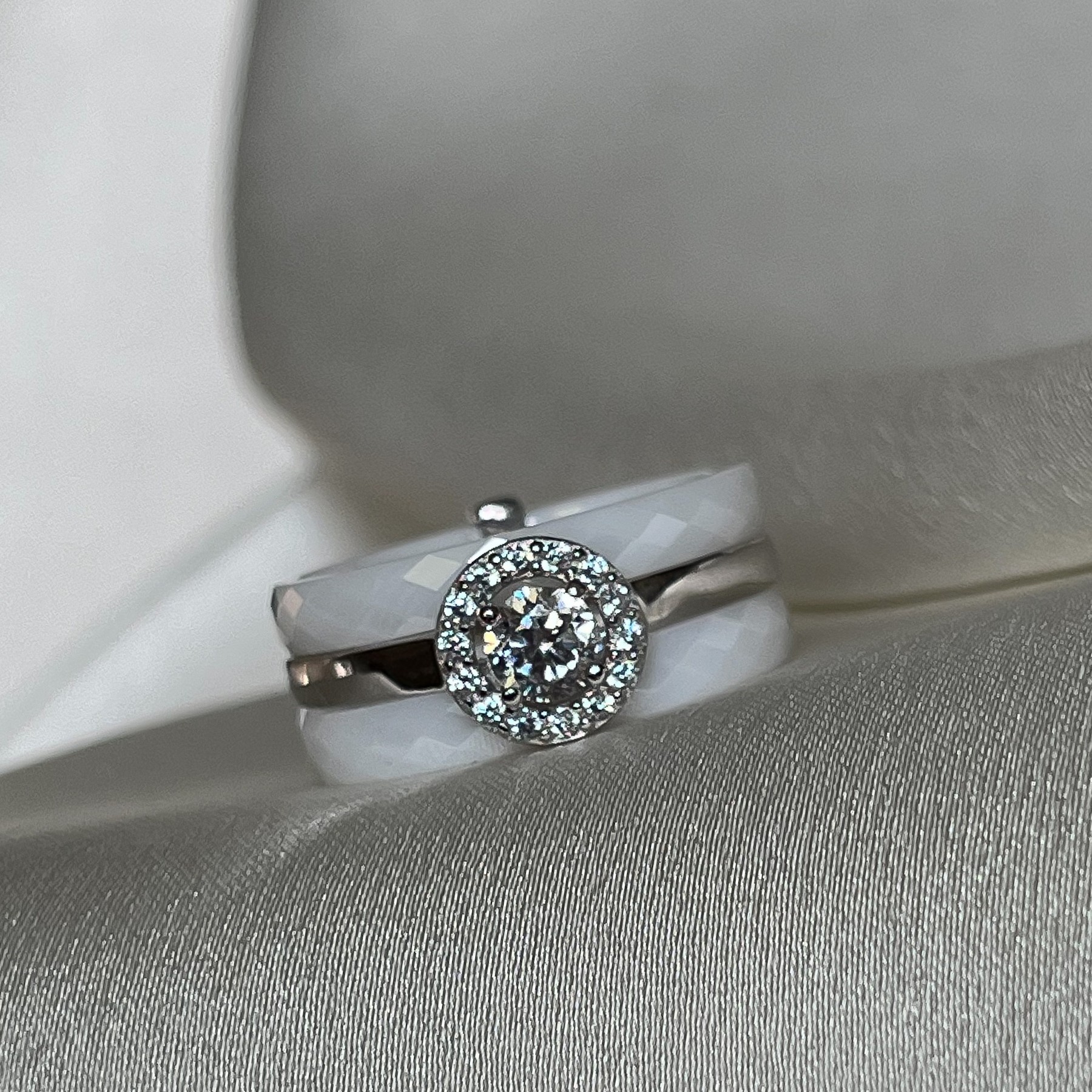 Каблучка срібна з білою керамікою і цирконієм діамантової огранки 006687