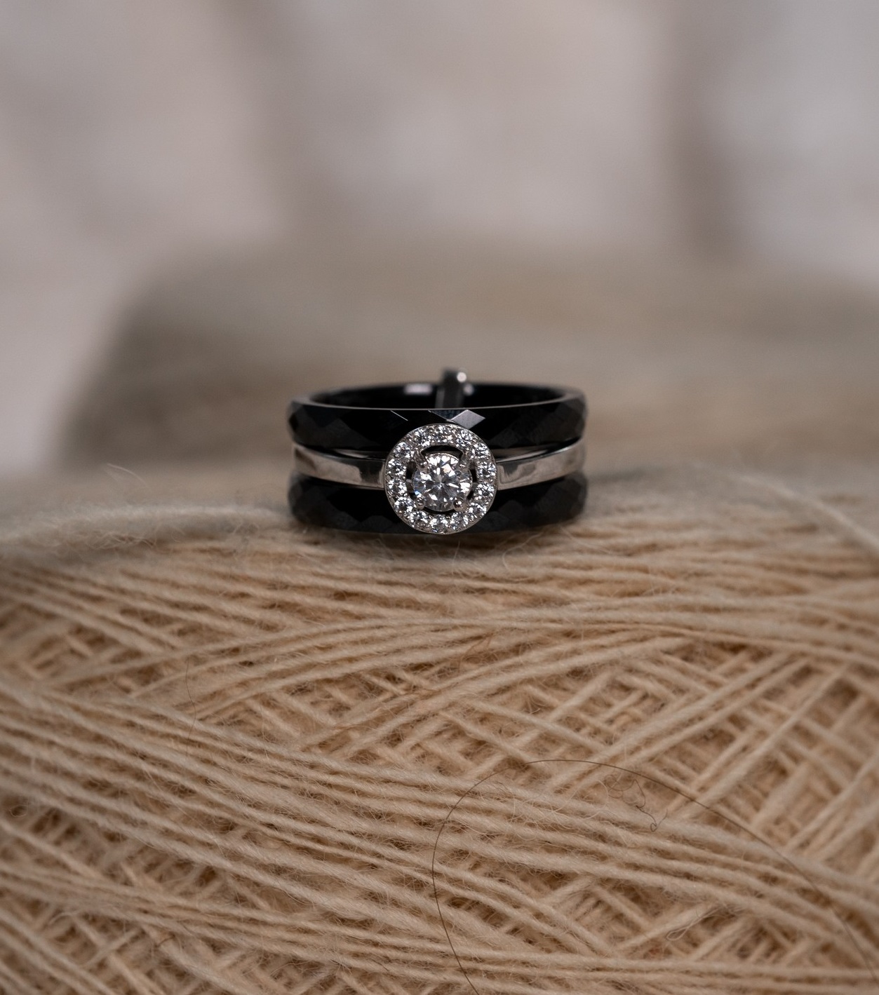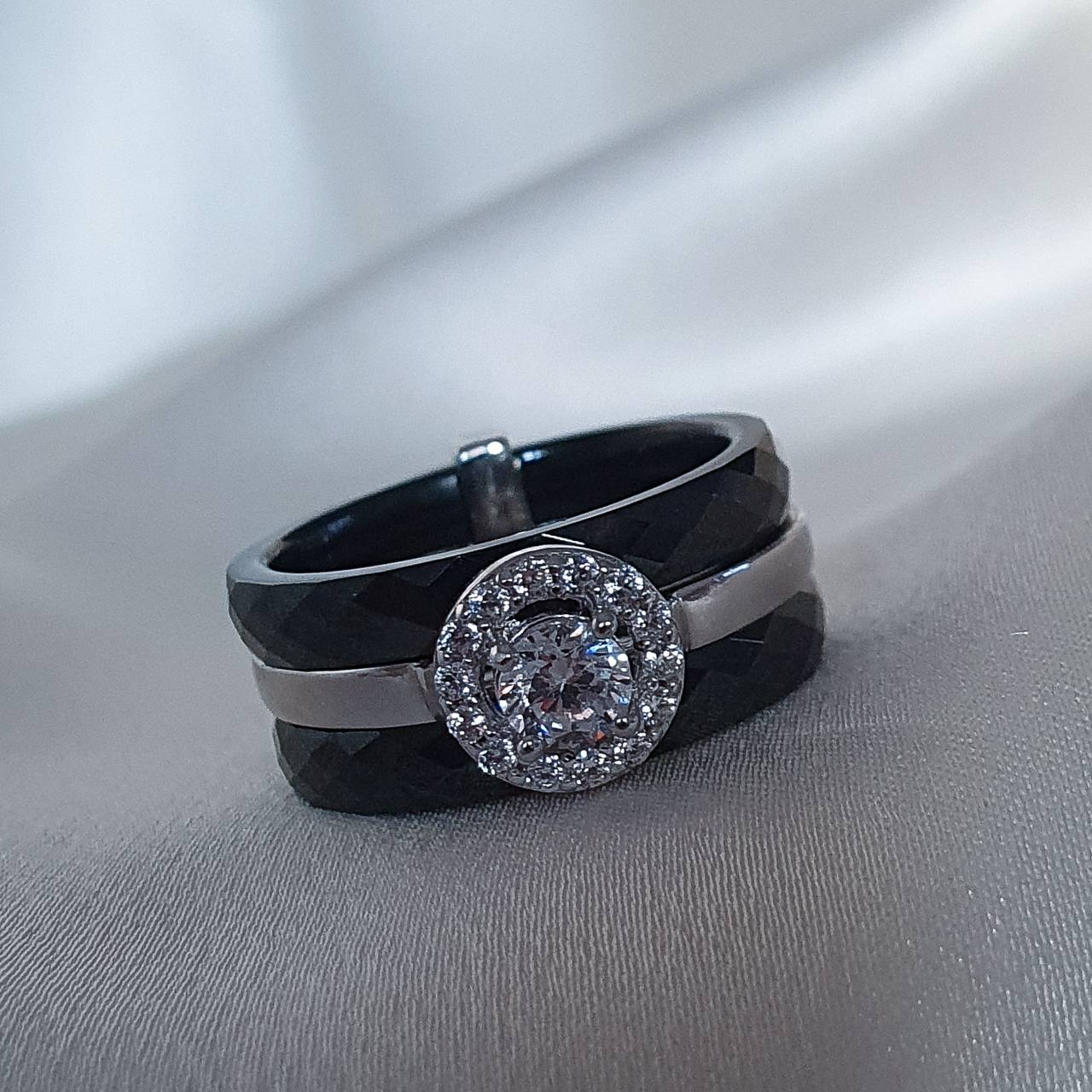 Каблучка срібна з чорною керамікою і цирконієм діамантової огранки 000670