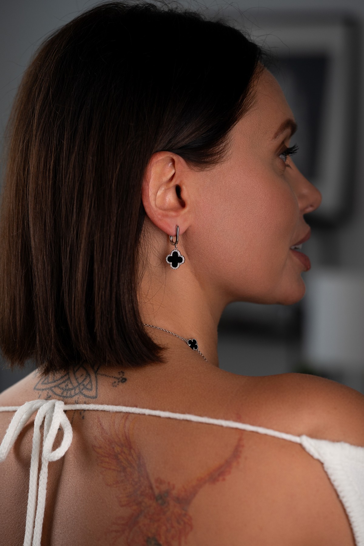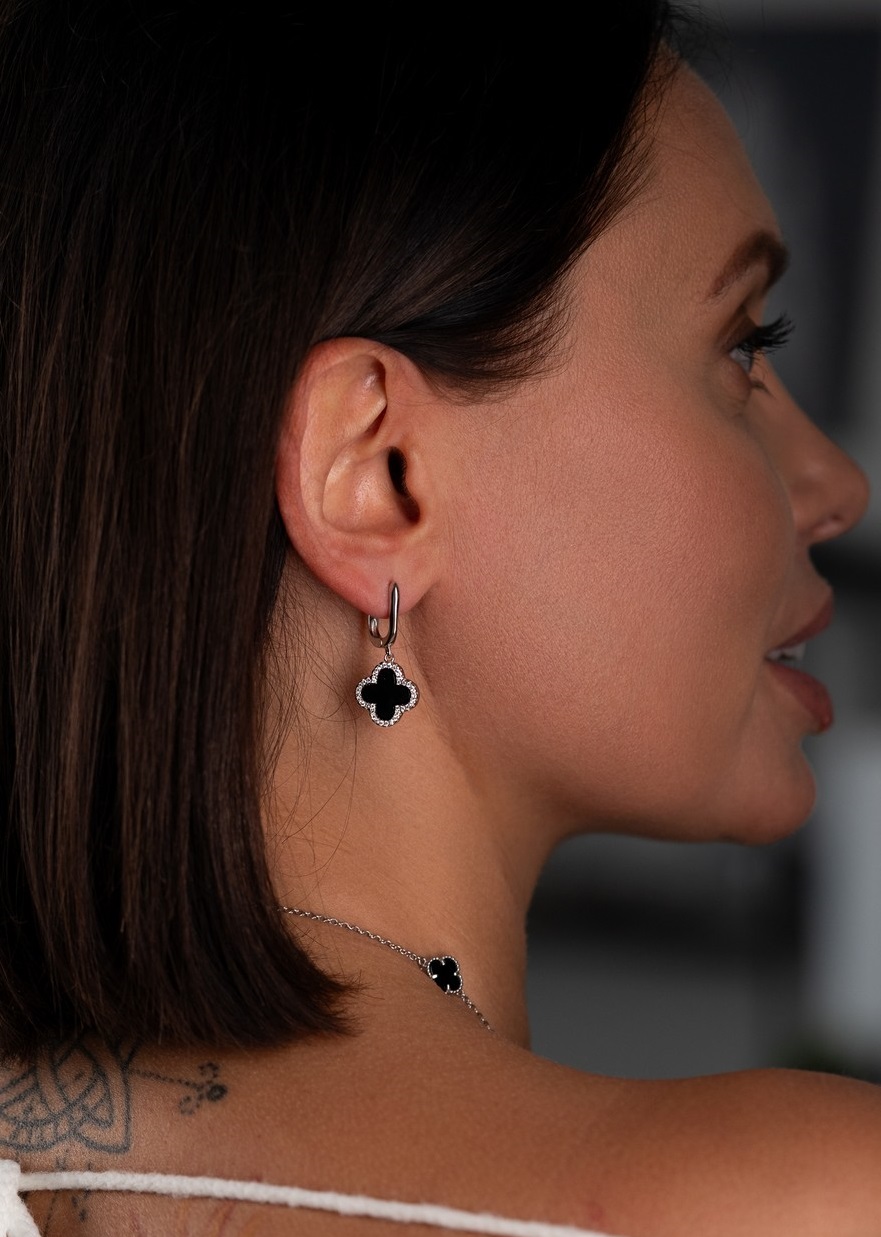 Сережки срібні Клевер 1,5см з оніксом і цирконієм діамантової огранки 002252