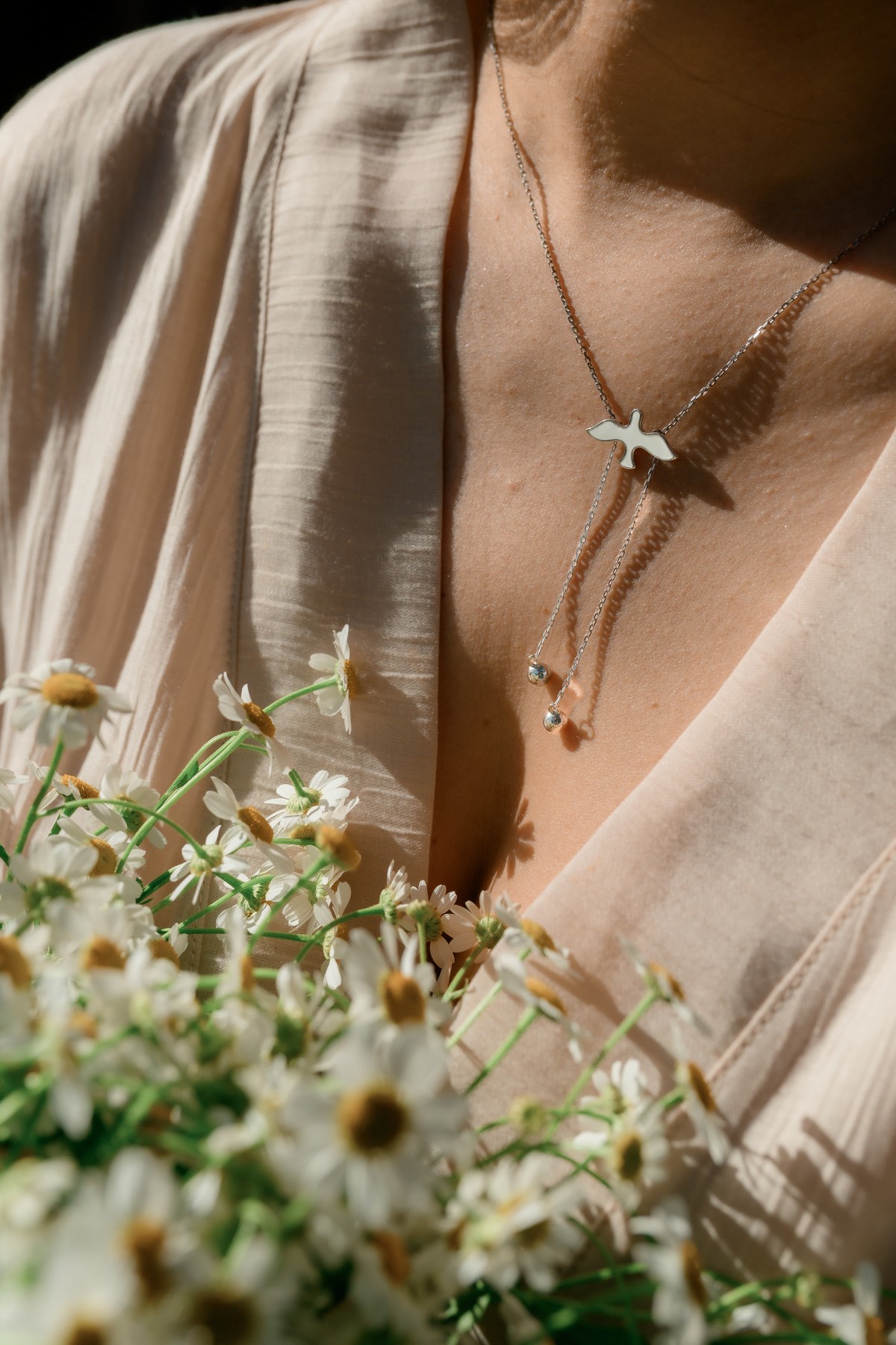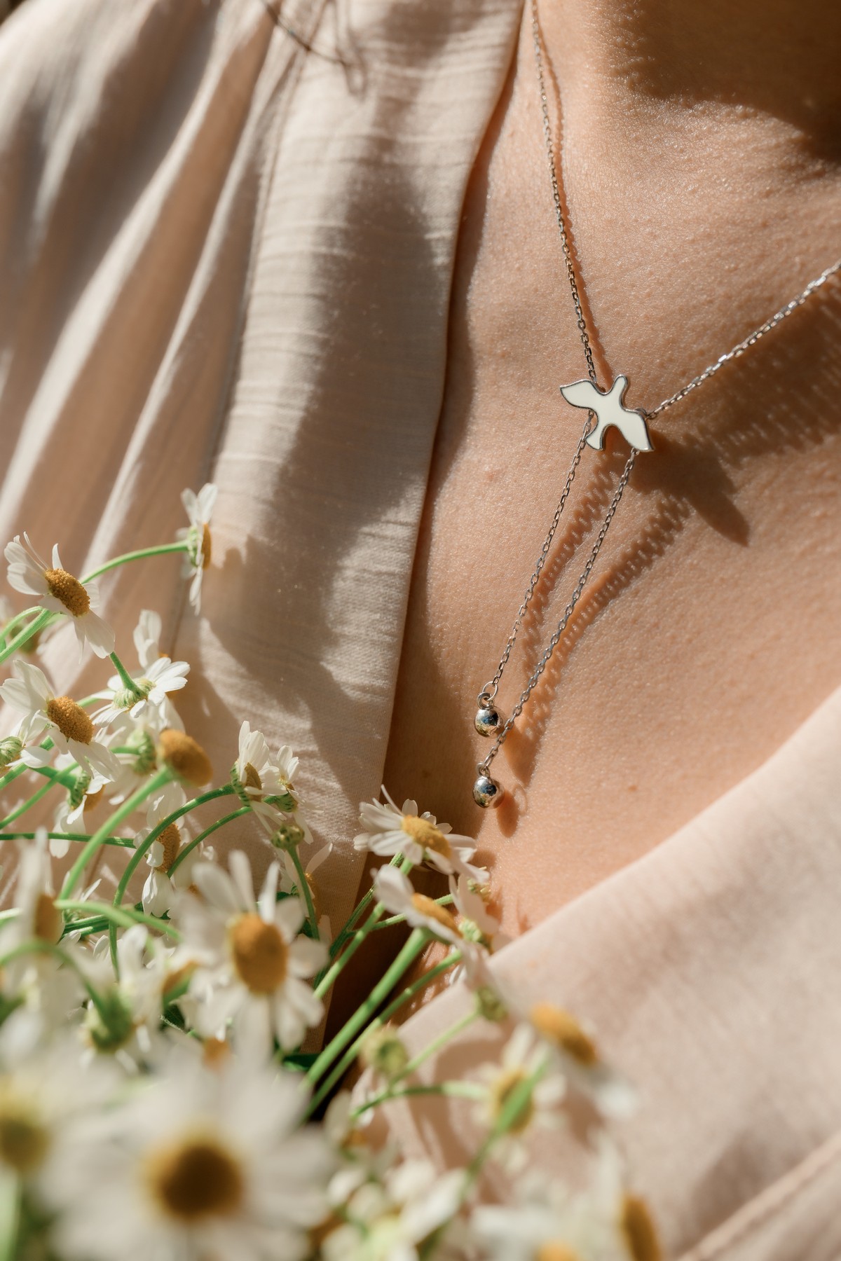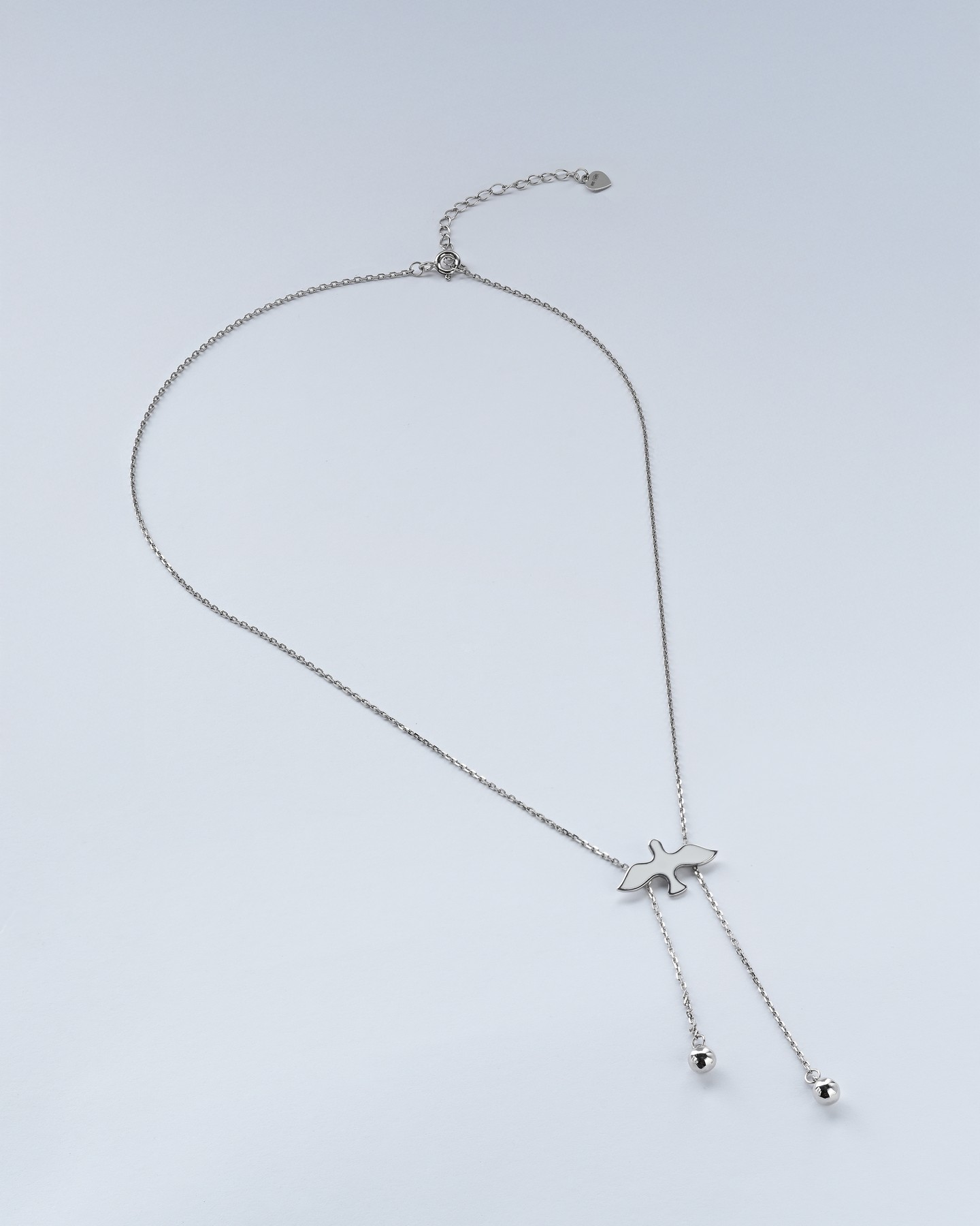 Срібне кольє-краватка Птах з білою емаллю 006885