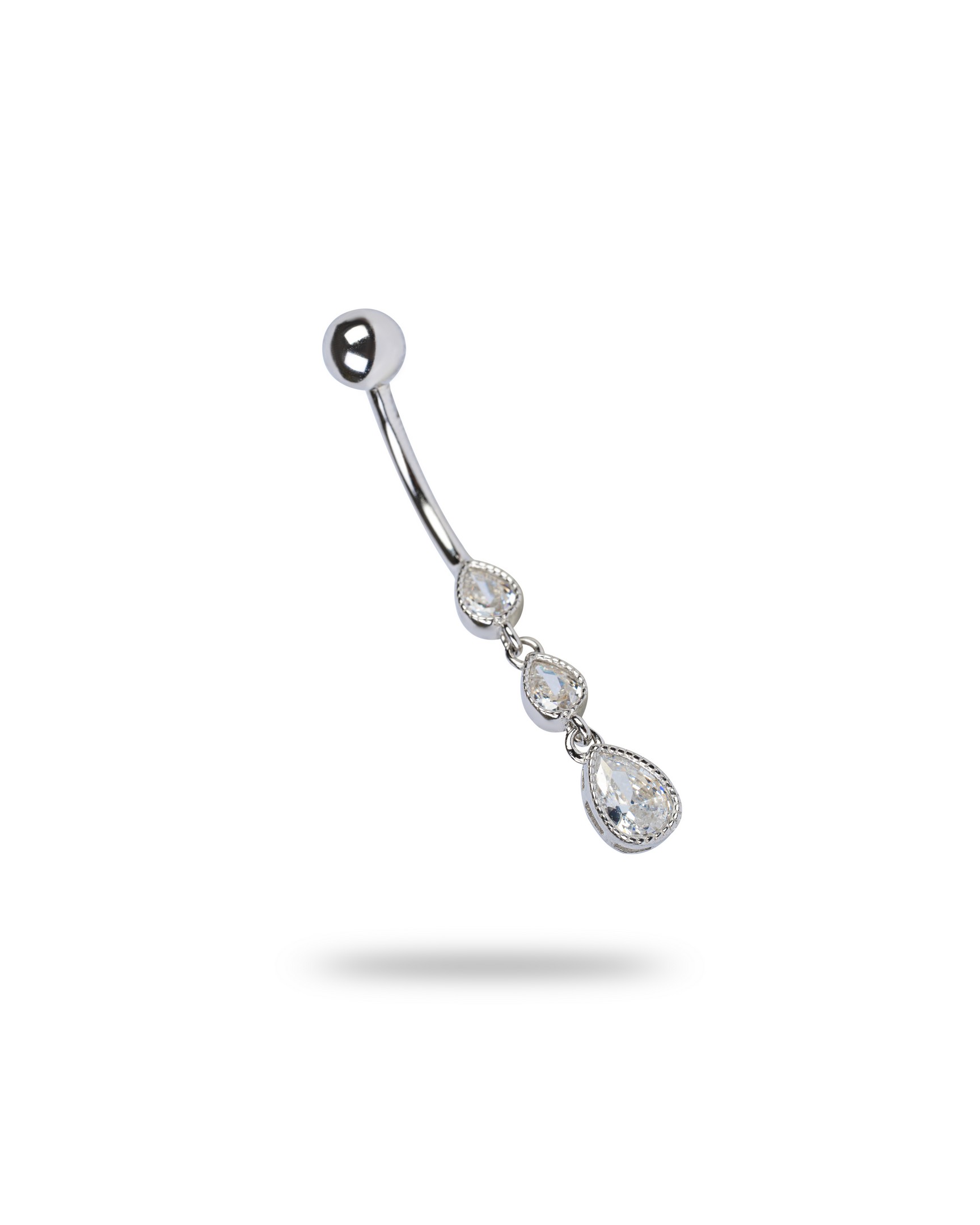 Пірсинг срібний в пупок з крупним цирконієм діамантового огранювання та підвіскою Три каплі 006976