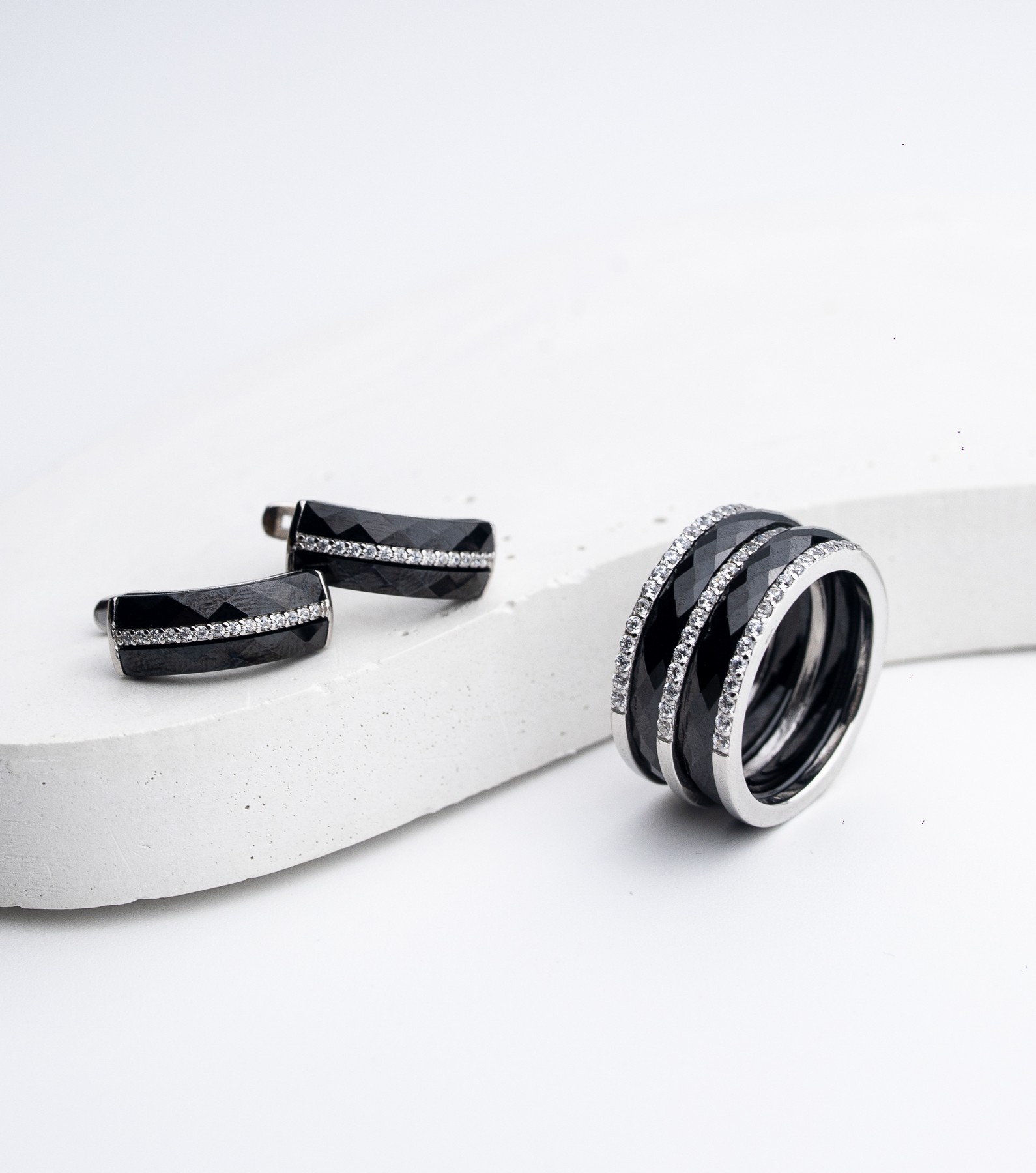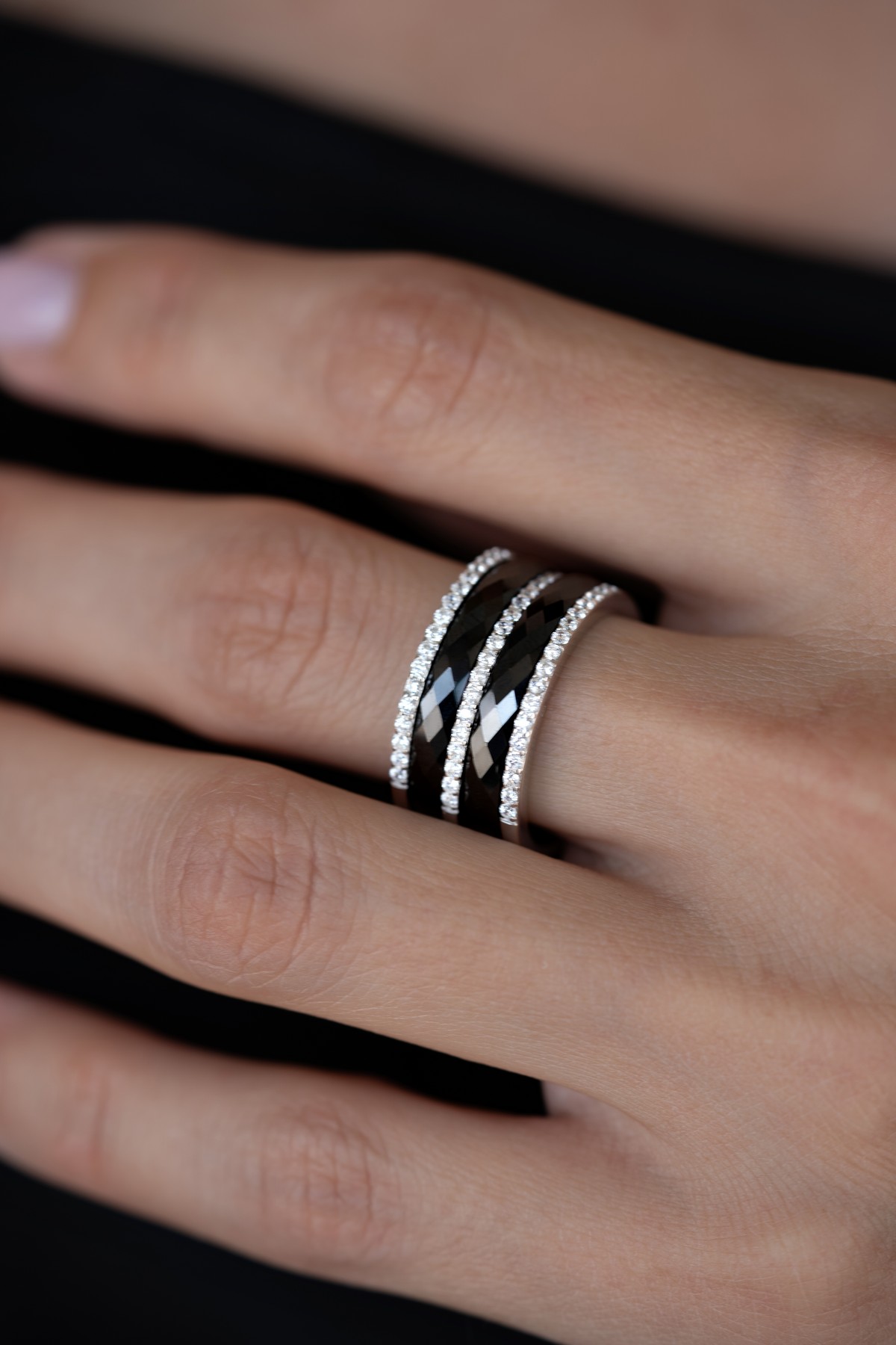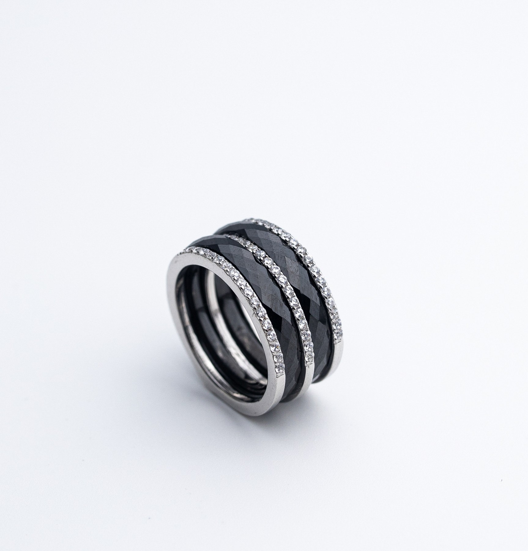 Каблучка срібна з чорною керамікою і цирконієм діамантової огранки 000673