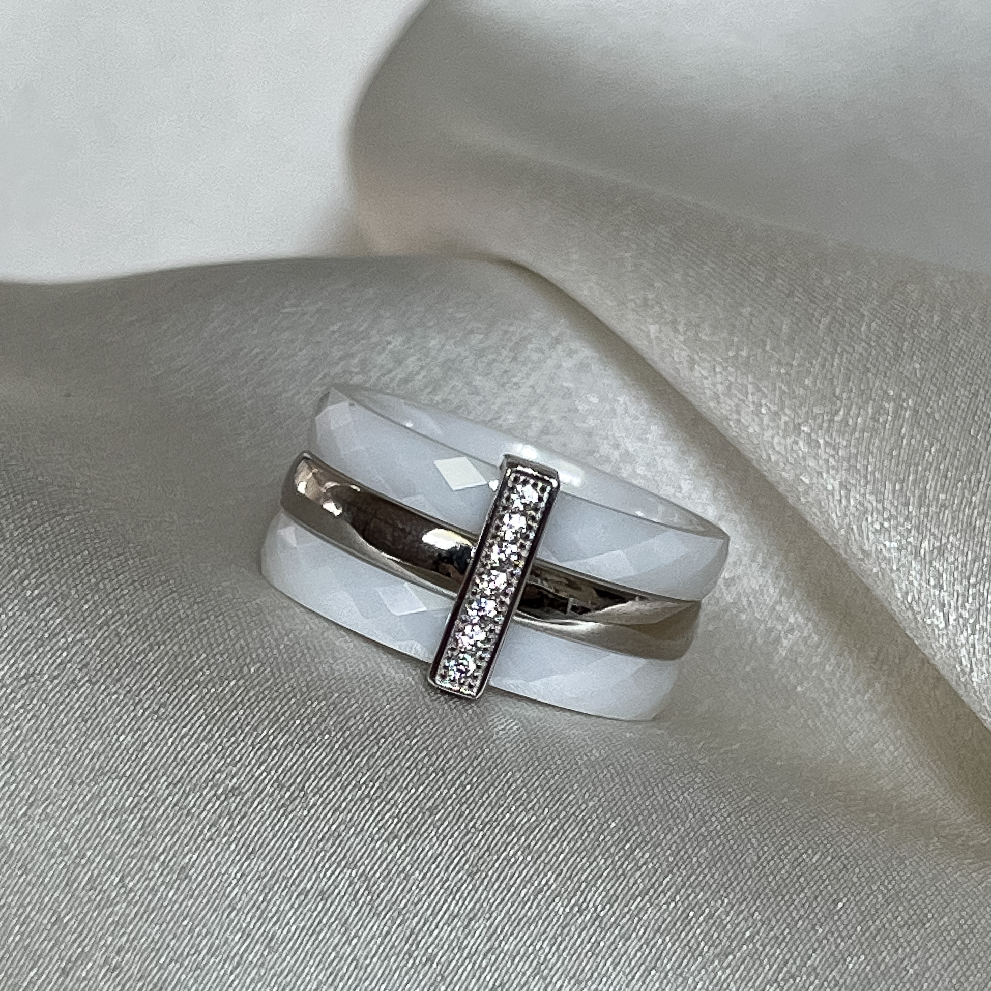 Каблучка срібна з білою керамікою і цирконієм діамантової огранки 006605