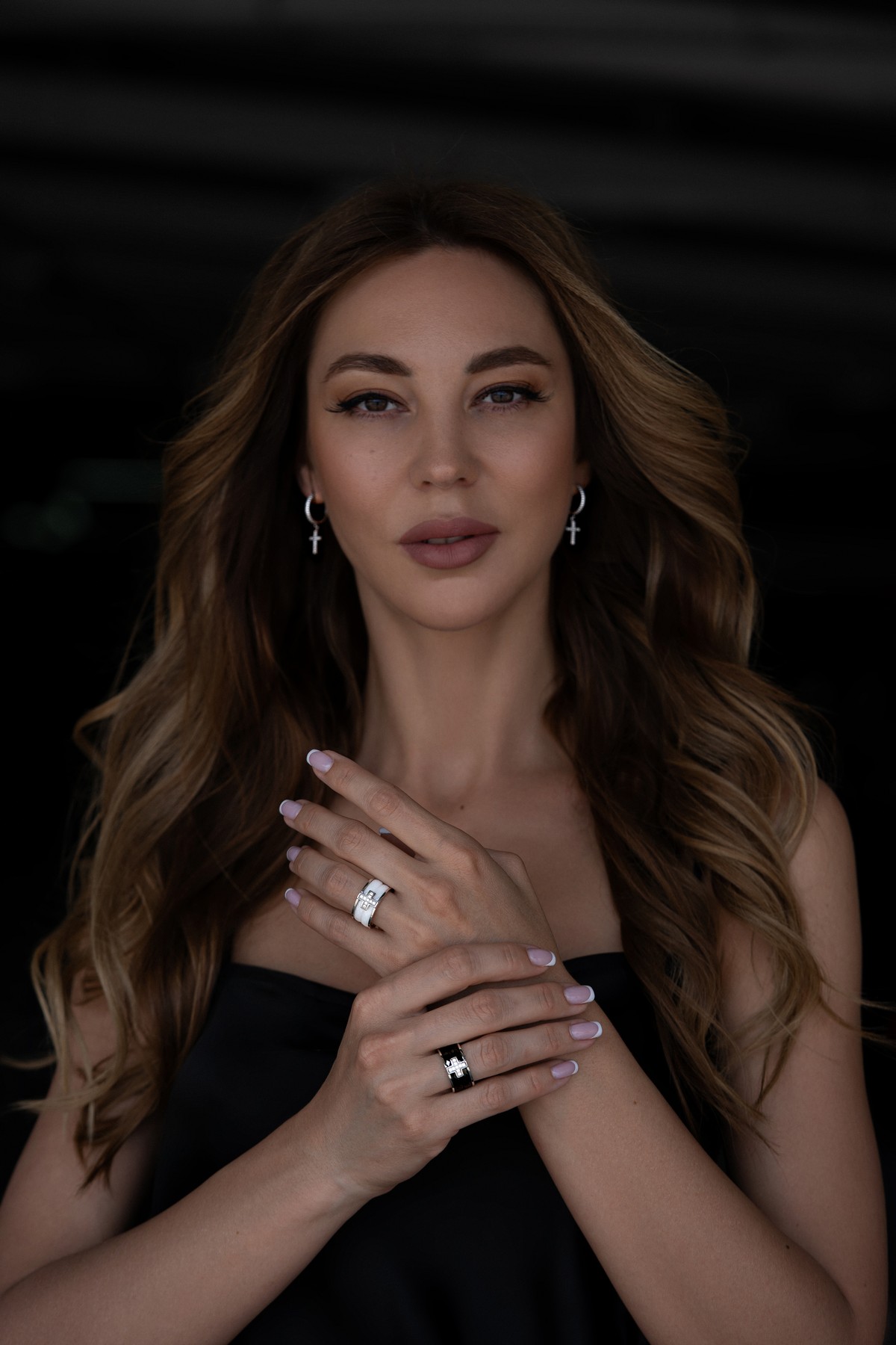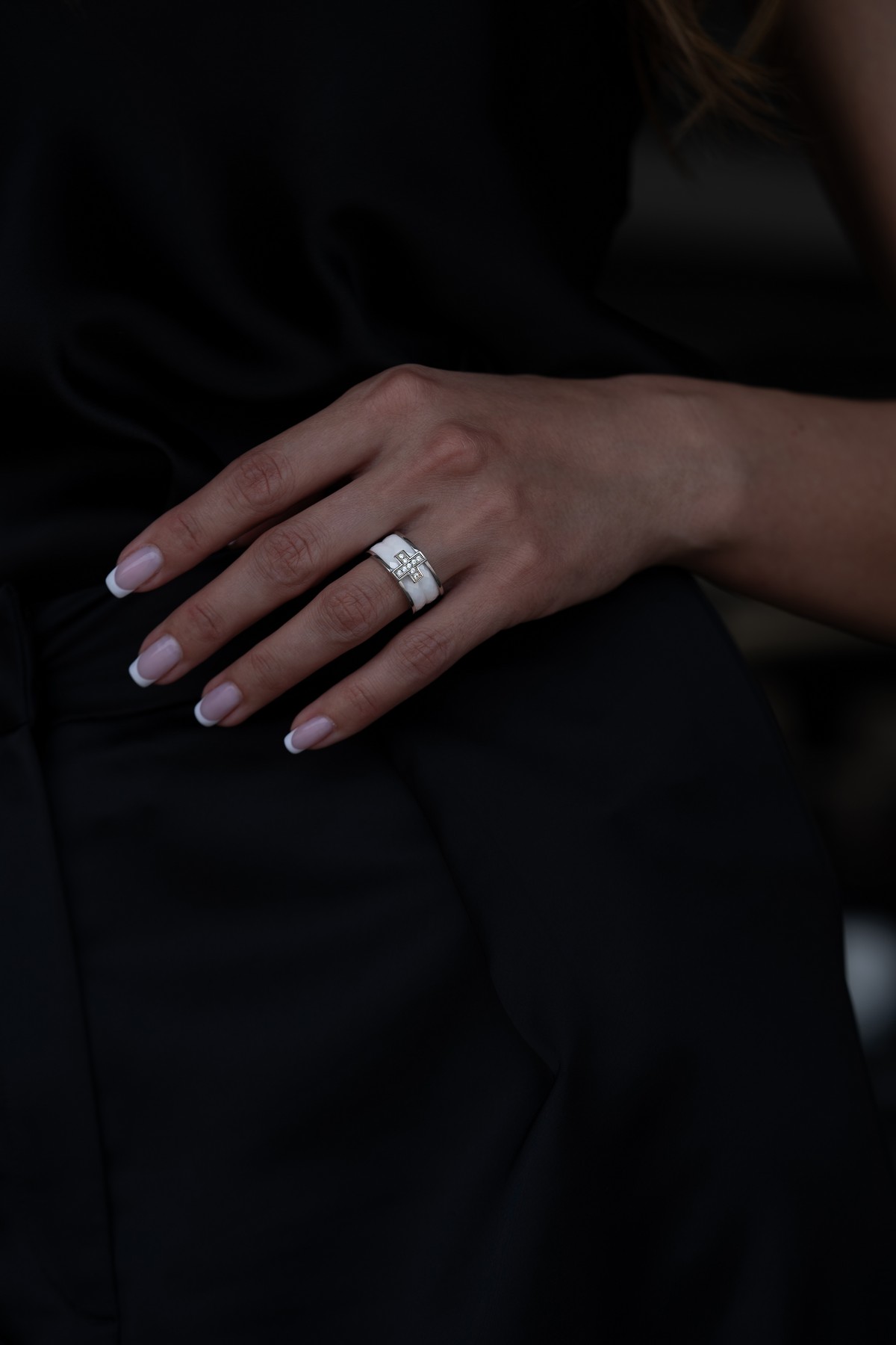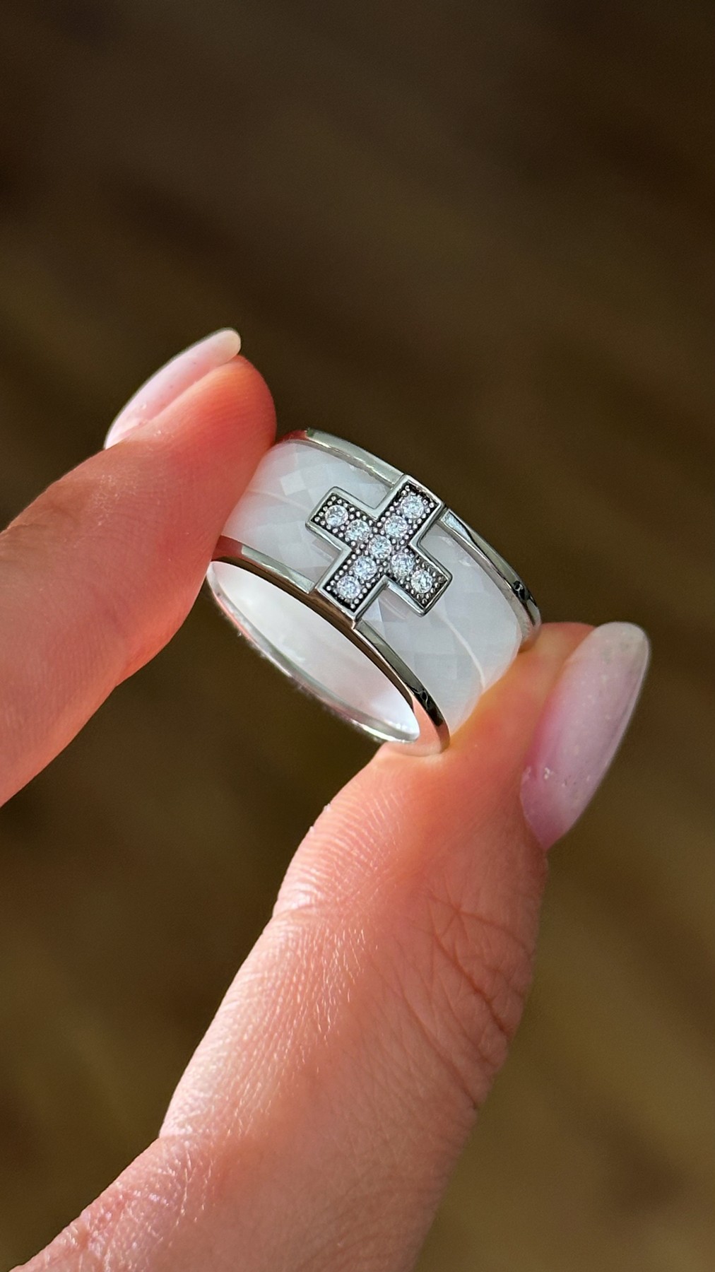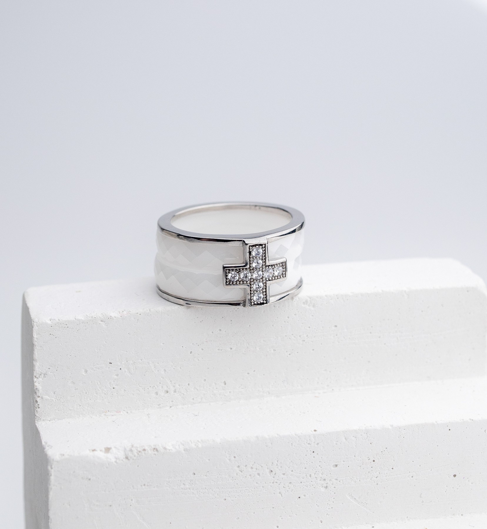 Каблучка срібна з білою керамікою і хрестом з цирконієм діамантової огранки
