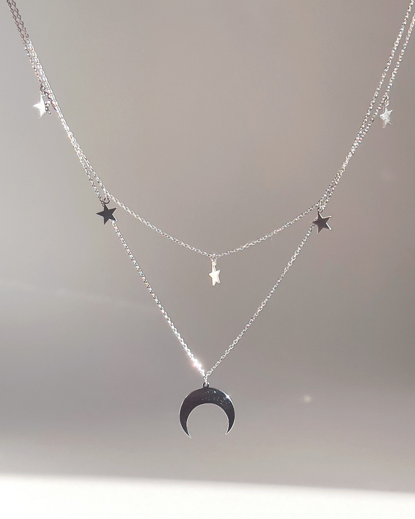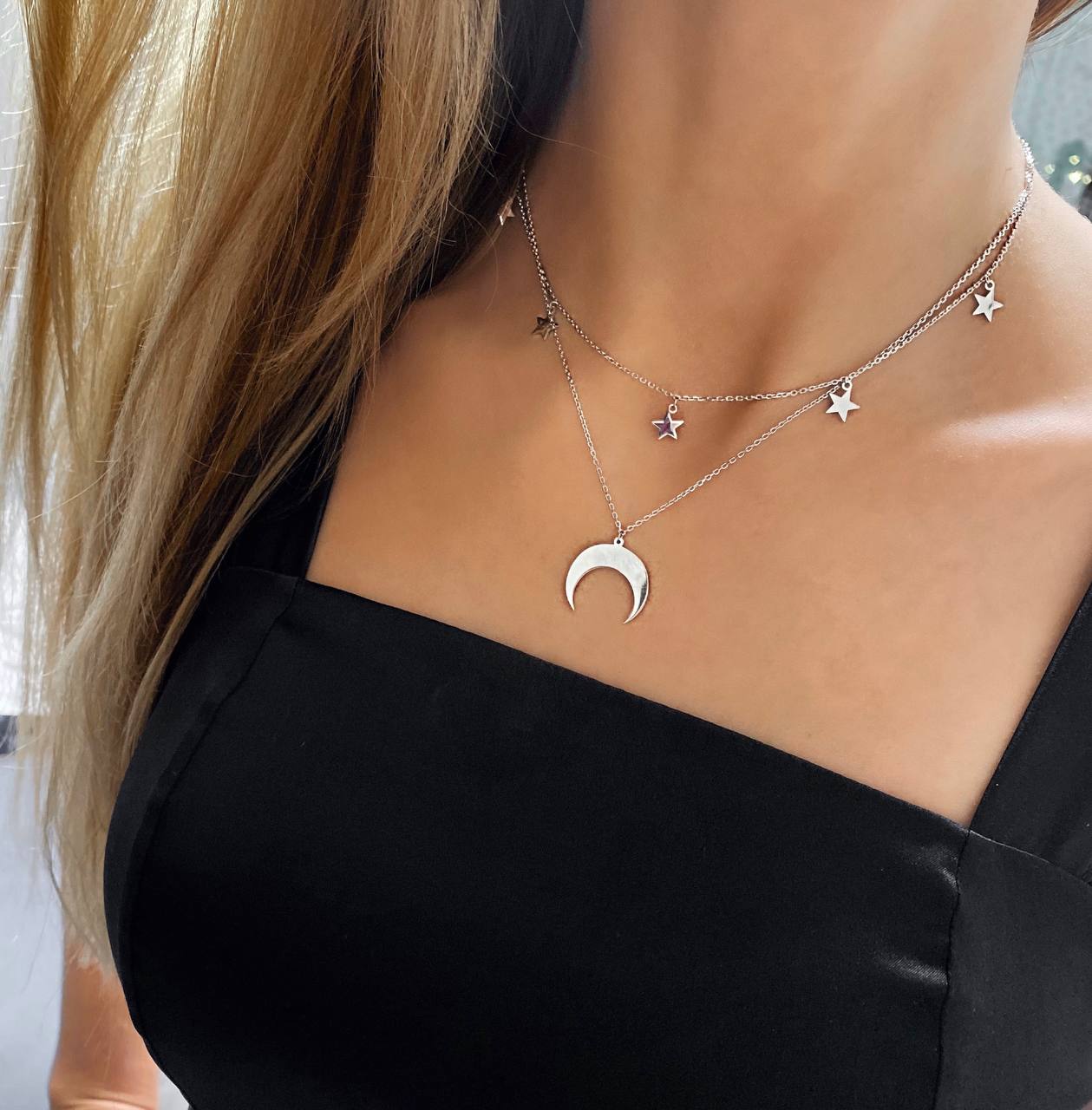 Срібне кольє подвійне Лунниця із зірками 925°