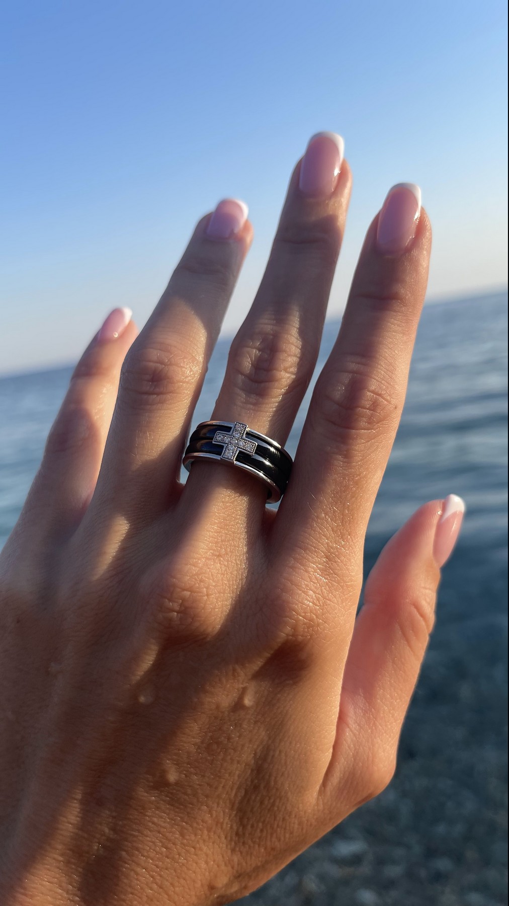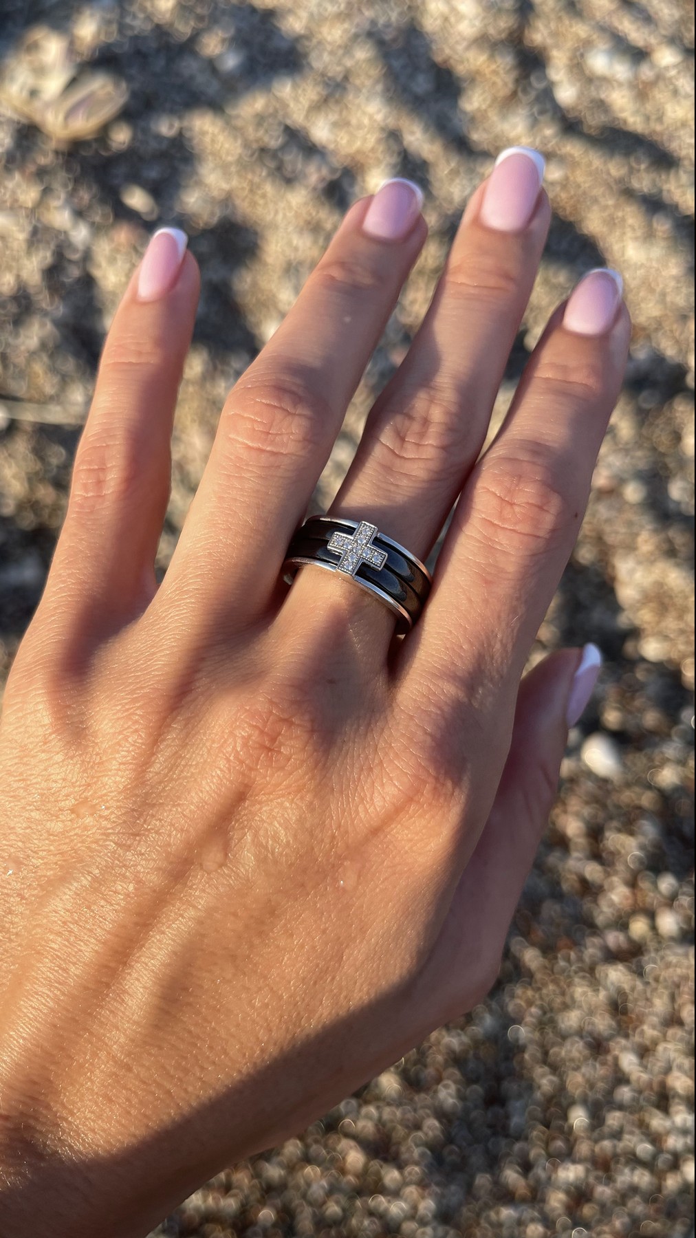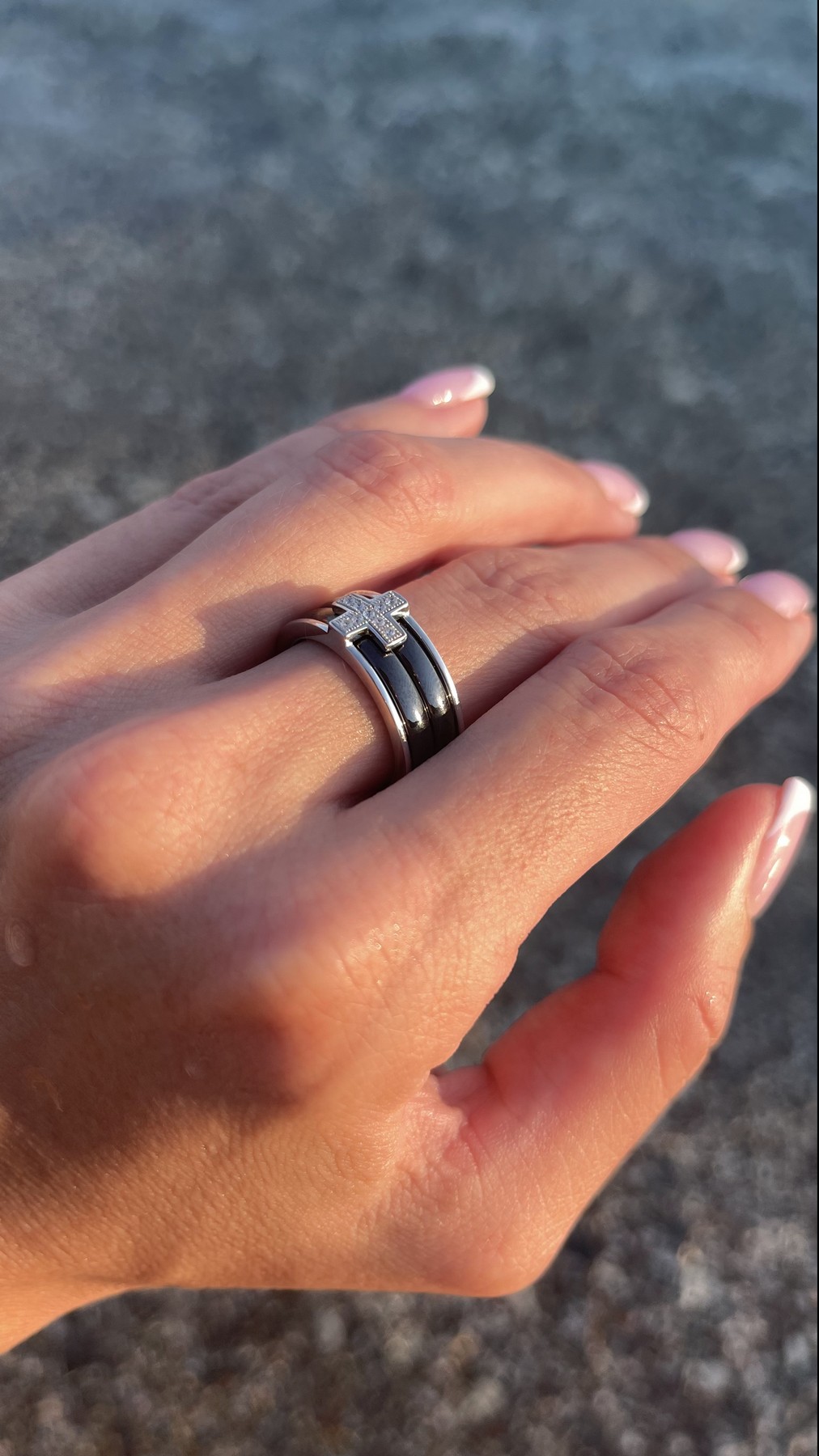 Кольцо серебряное с черной керамикой и крестом с цирконием бриллиантовой огранки