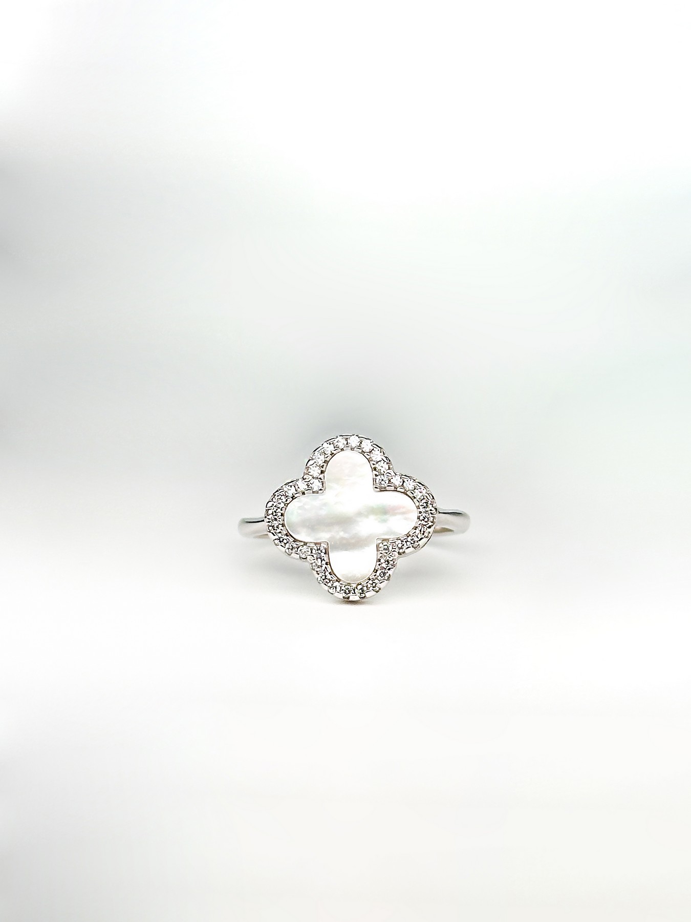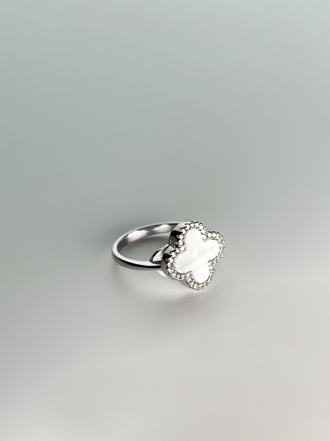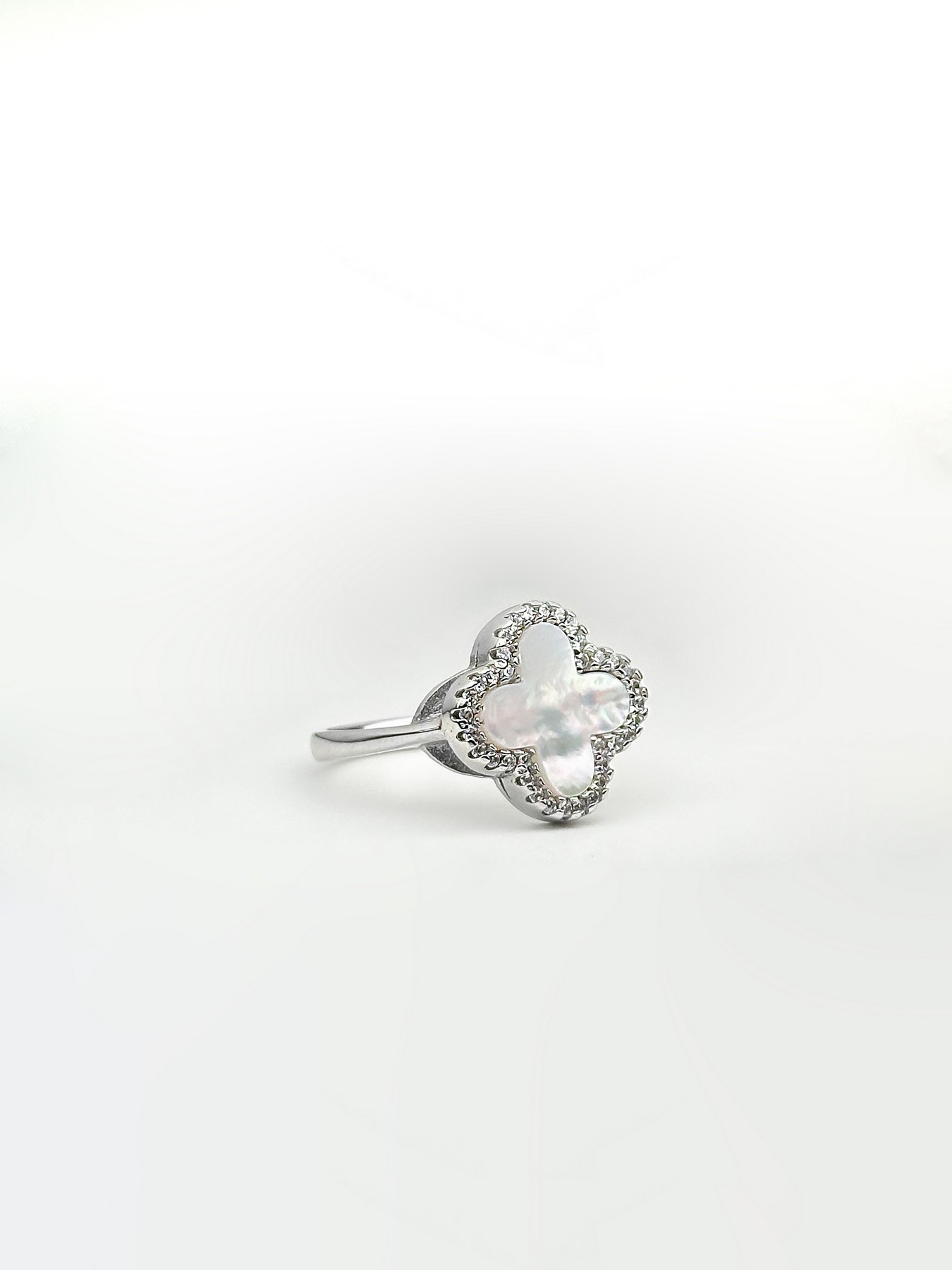 Кольцо серебряное с перламутром и цирконием бриллиантовой огранки Клевер 1,5см 001909