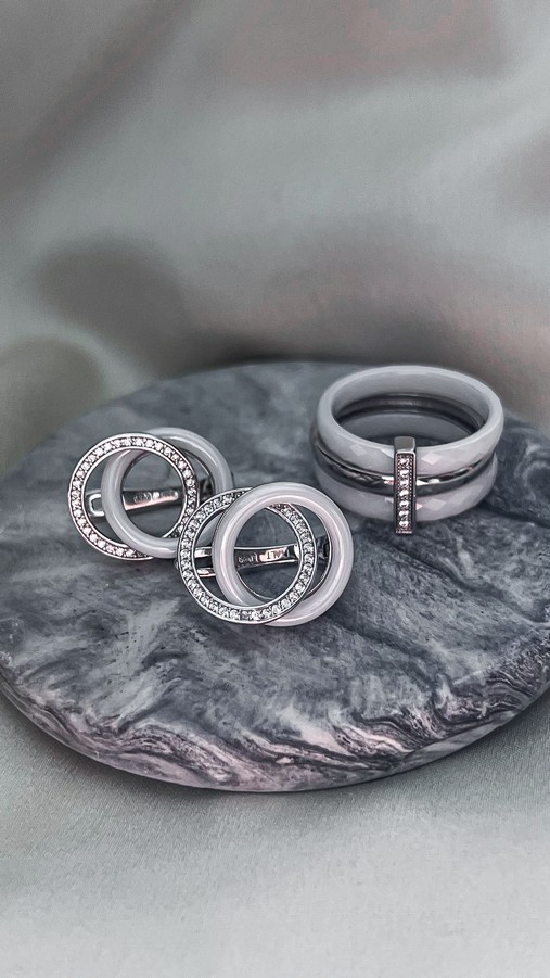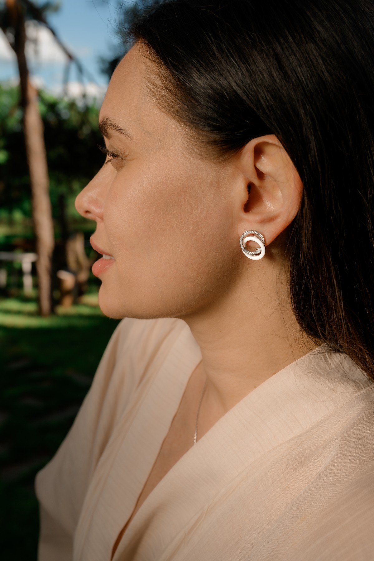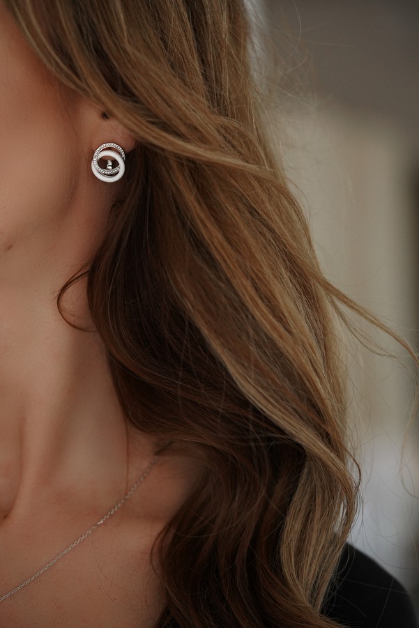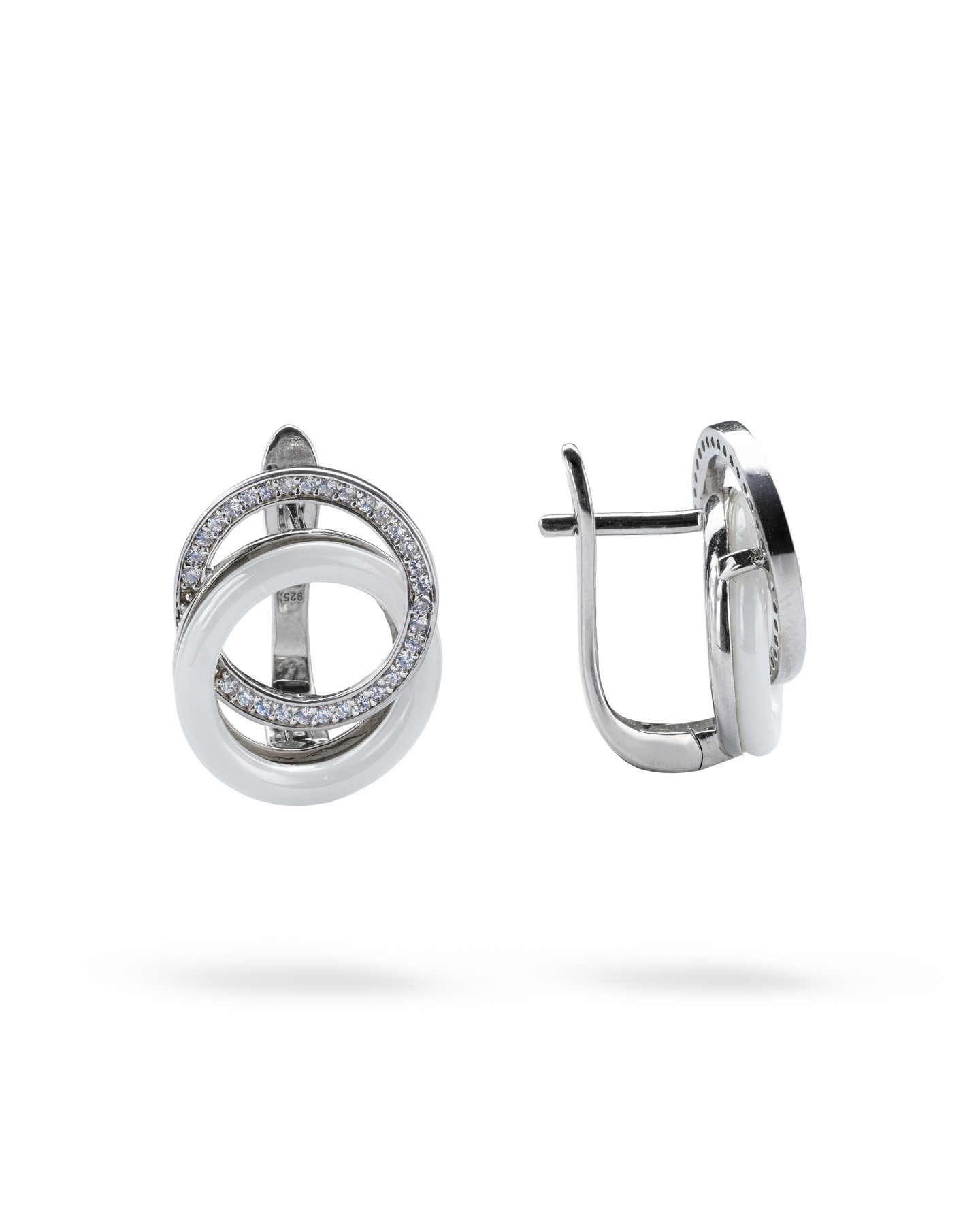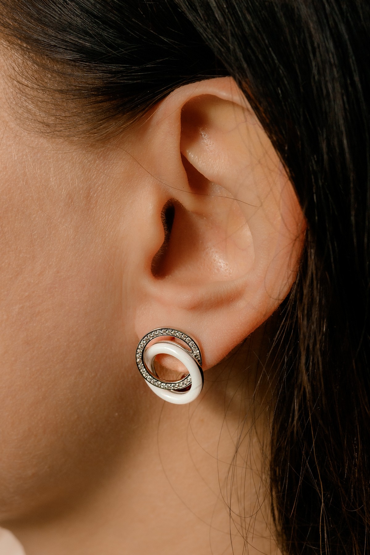 Серебряные серьги с белой керамикой и цирконием бриллиантовой огранки 006603