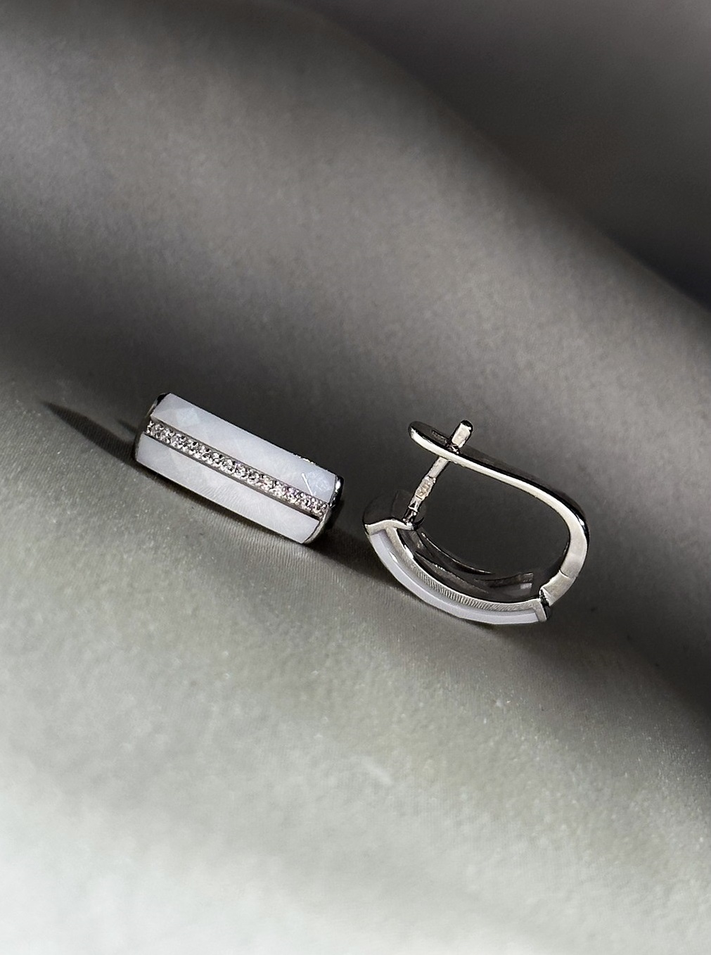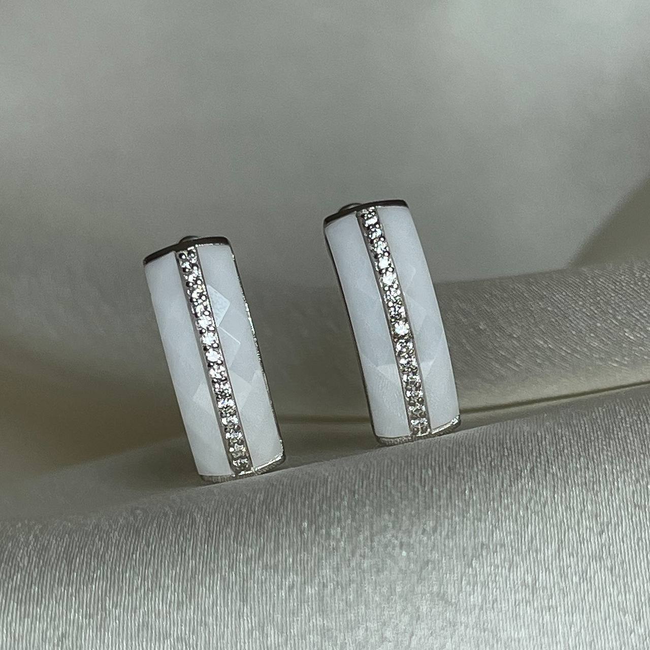 Серебряные серьги с белой керамикой и цирконием бриллиантовой огранки