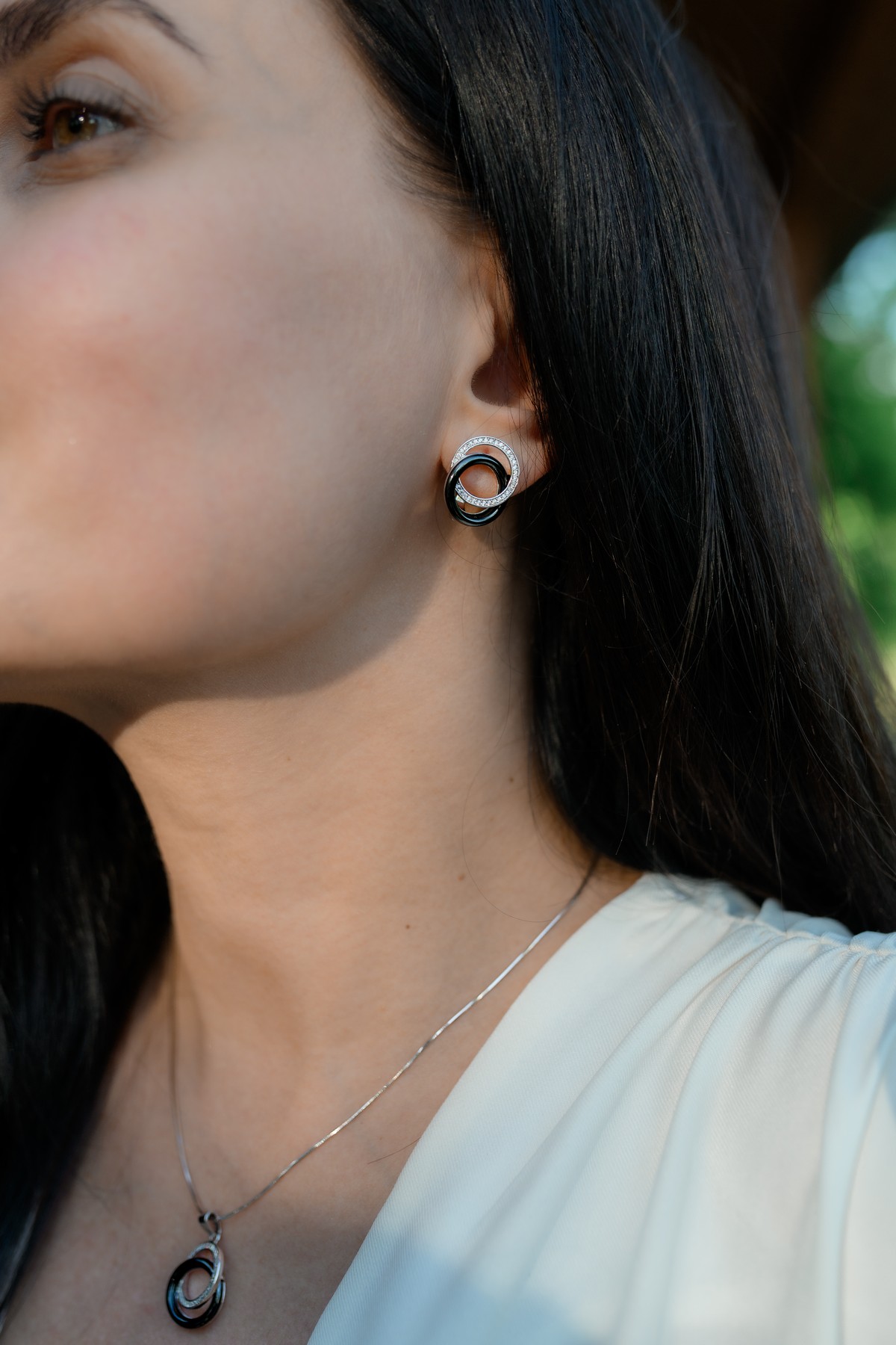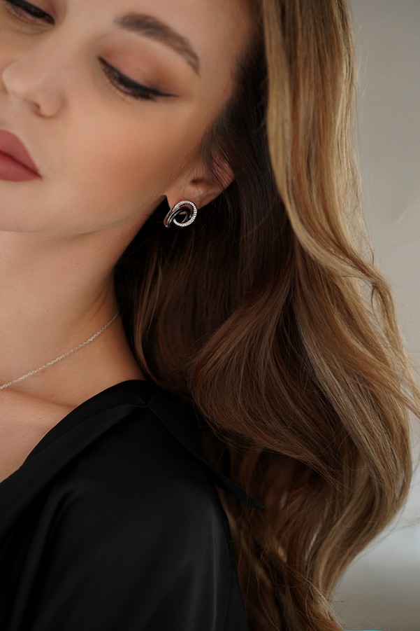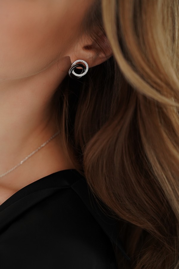 Серебряные серьги с черной керамикой и цирконием бриллиантовой огранки 003350