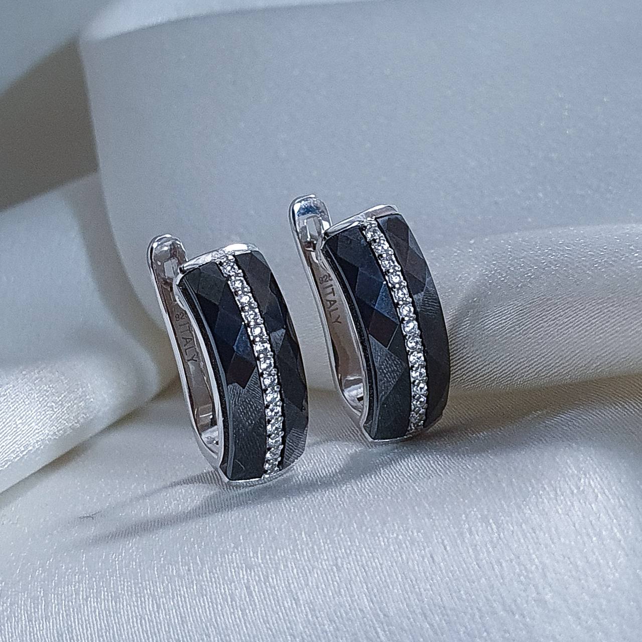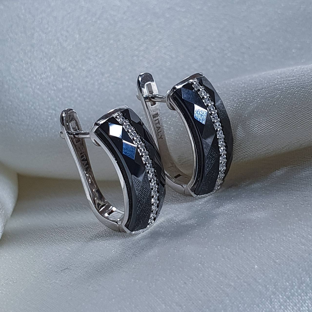 Серебряные серьги с черной керамикой и цирконием бриллиантовой огранки