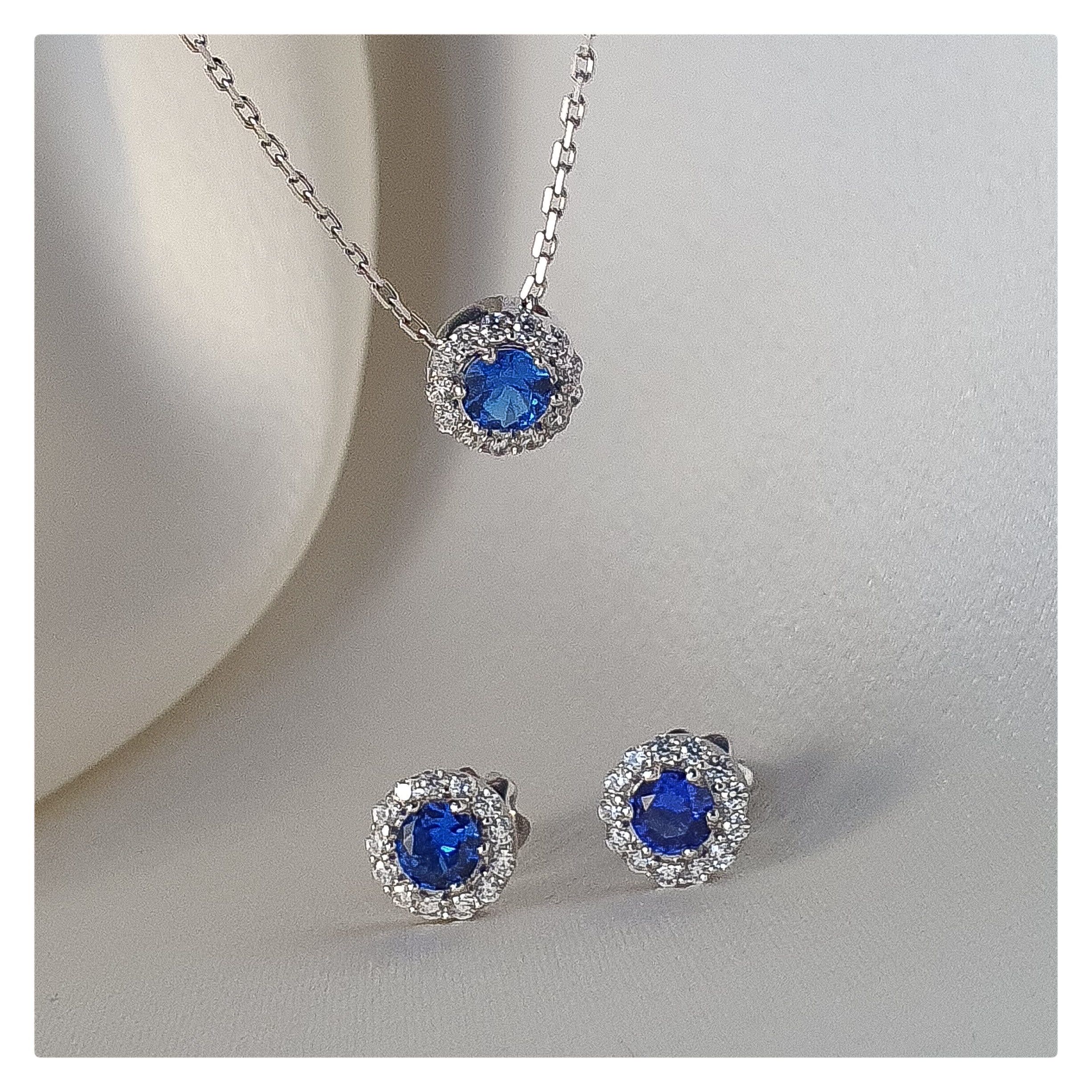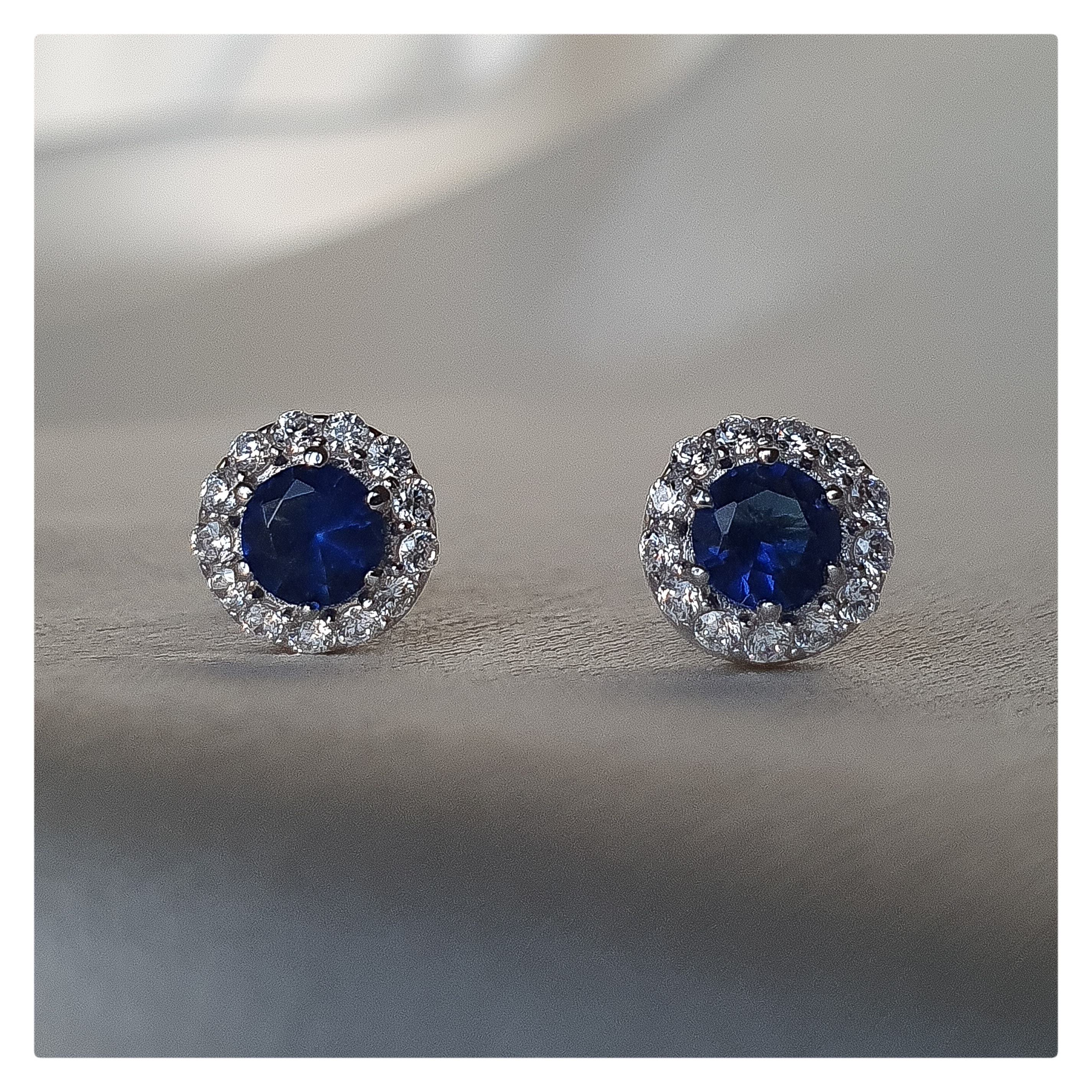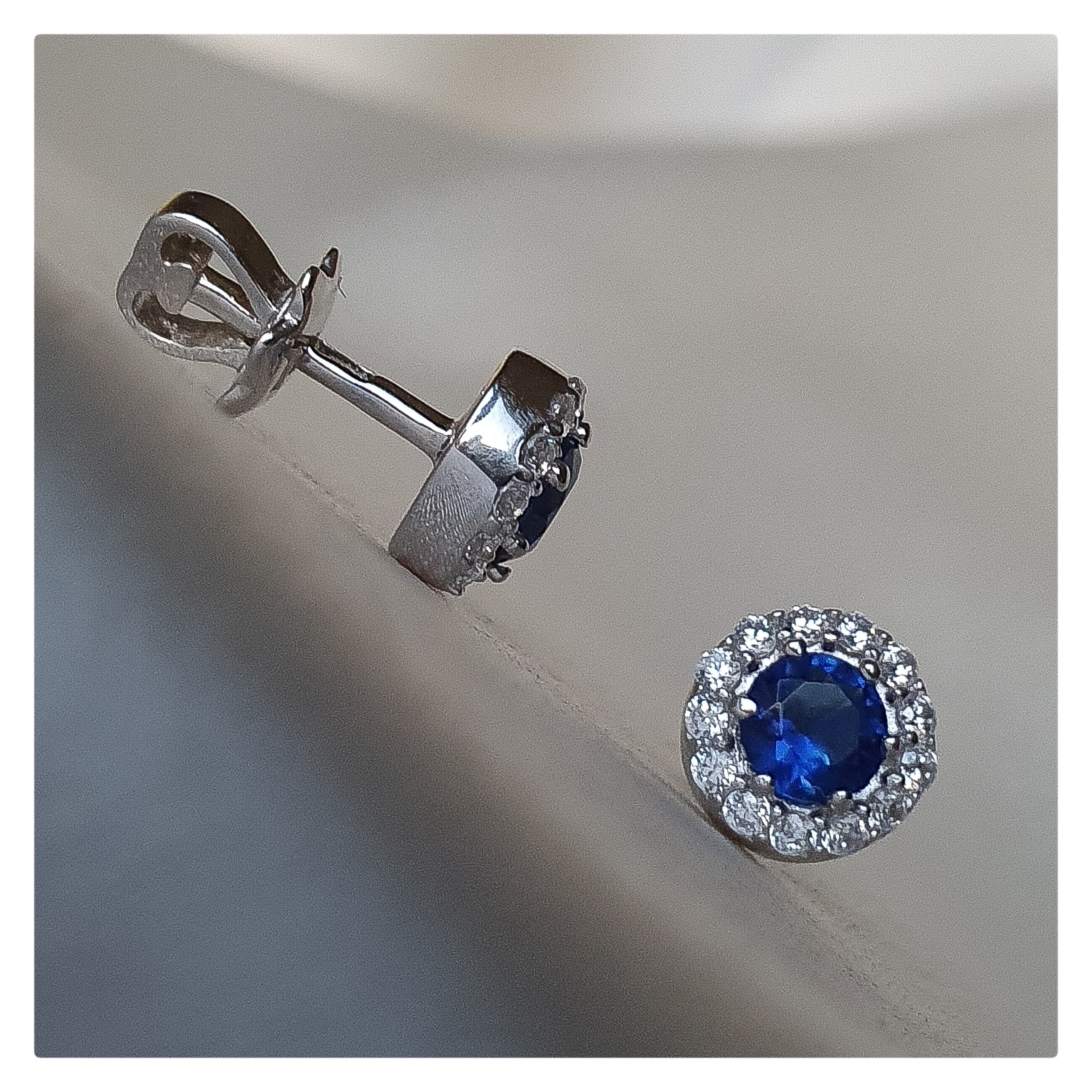 Серьги - пусеты (гвоздики) с крупным синим цирконием и россыпью бриллиантовой огранки