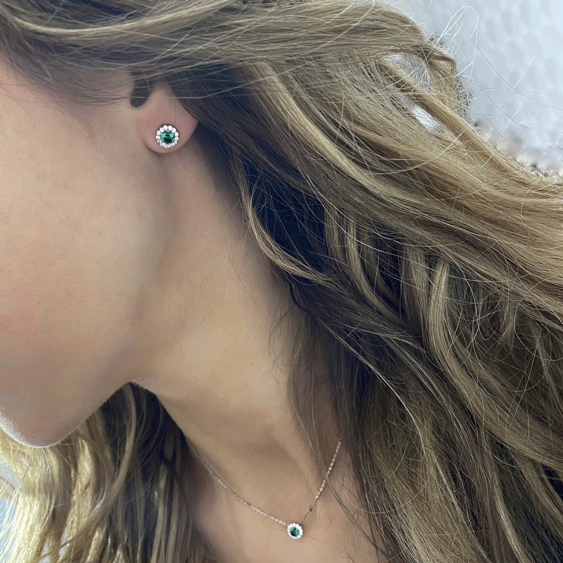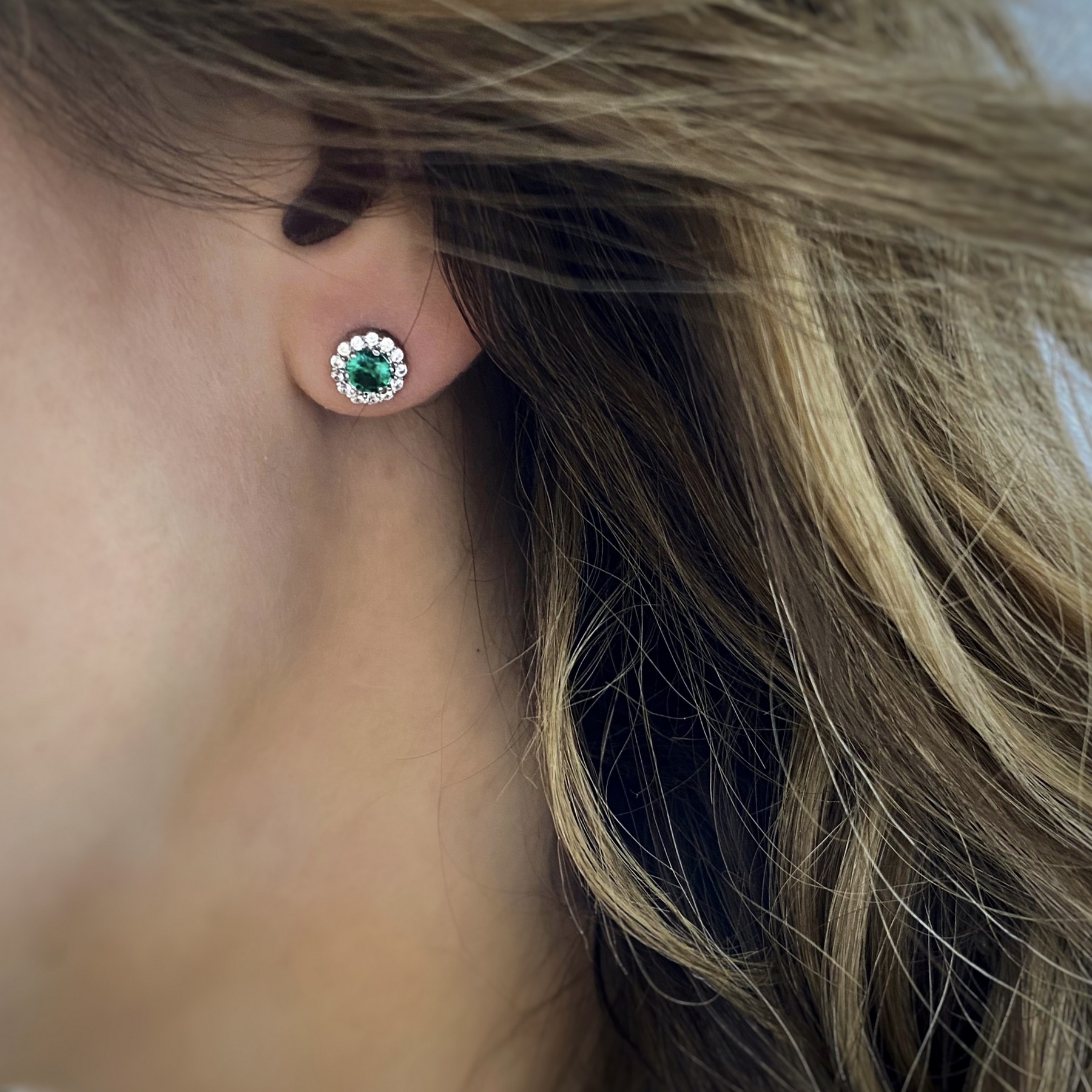 Серьги - пусеты (гвоздики) с крупным зеленым цирконием и россыпью бриллиантовой огранки