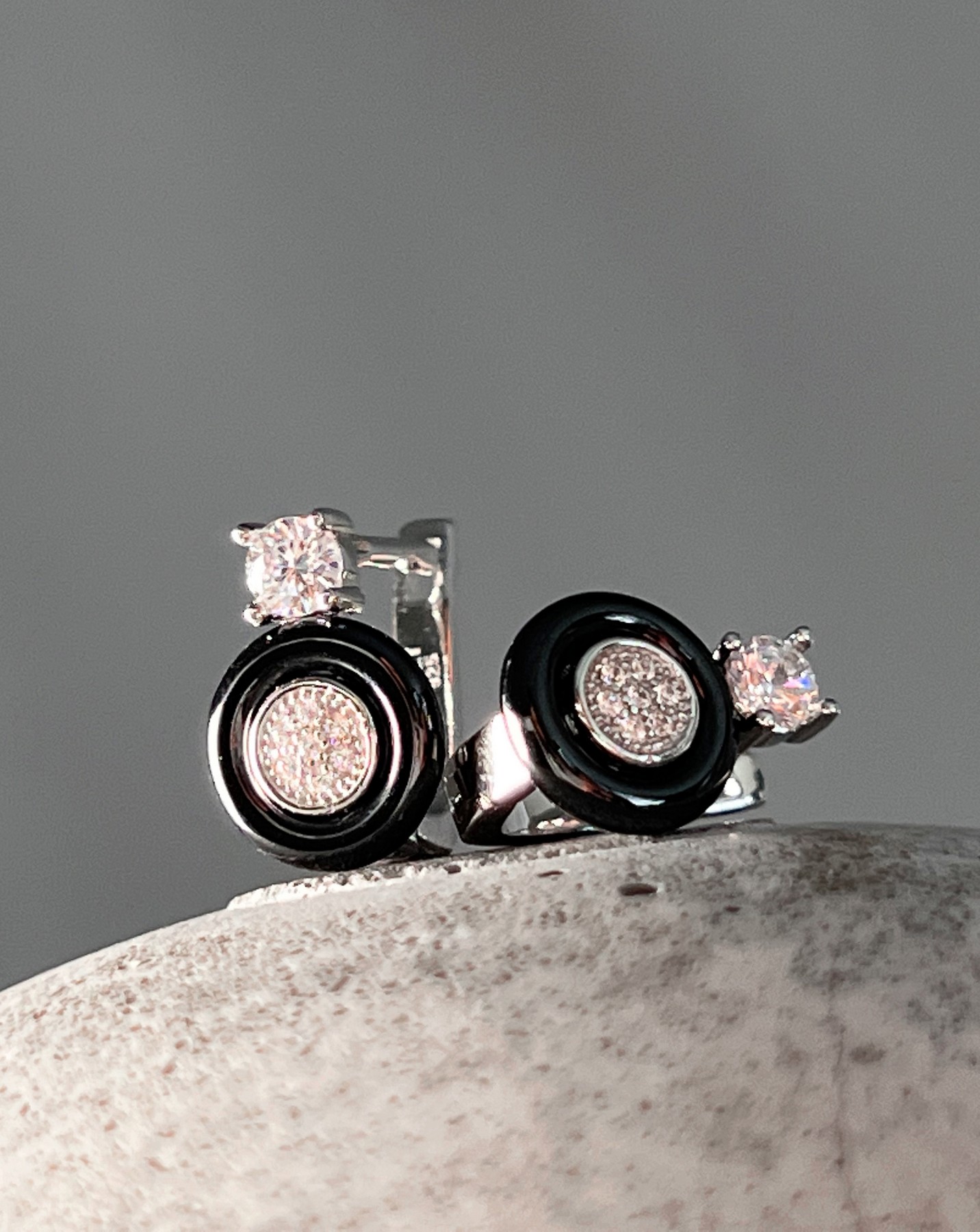 Серебряные серьги с черной керамикой и цирконием бриллиантовой огранки 003378
