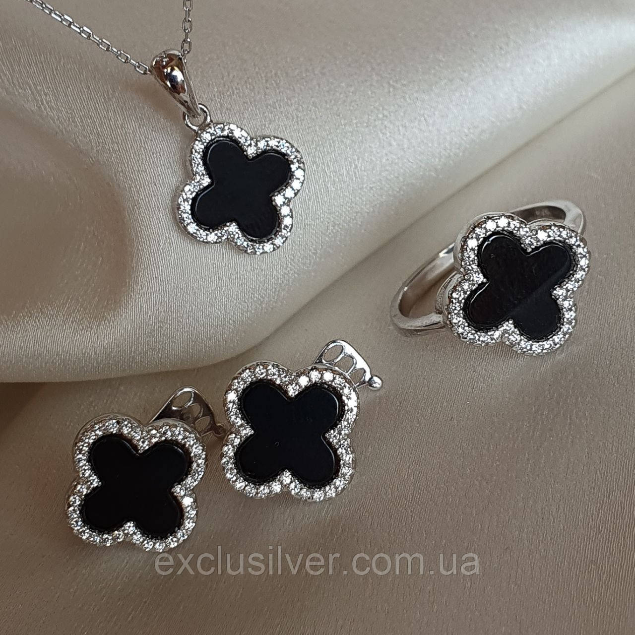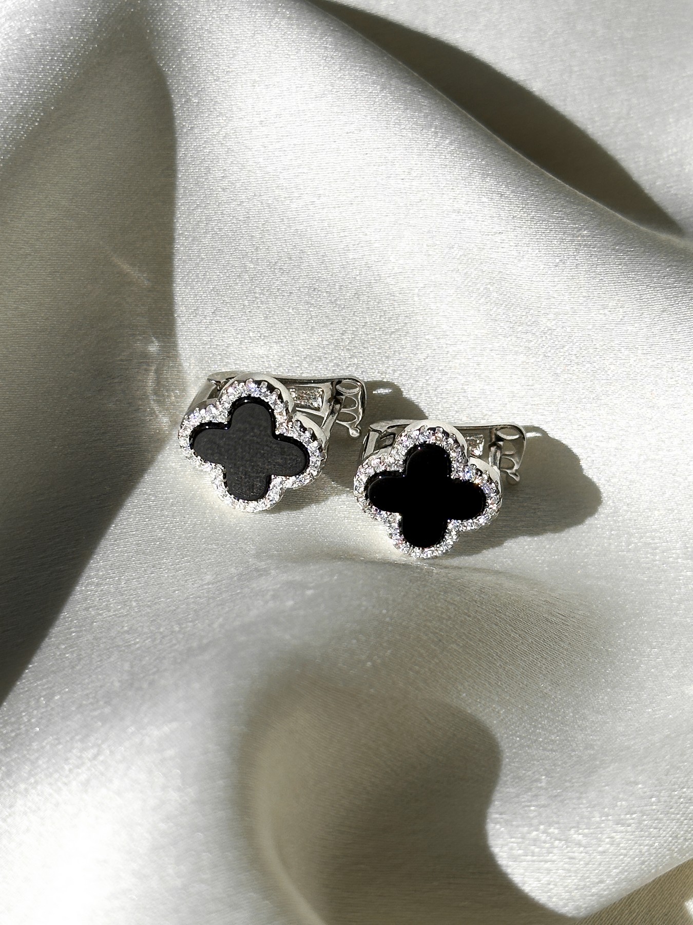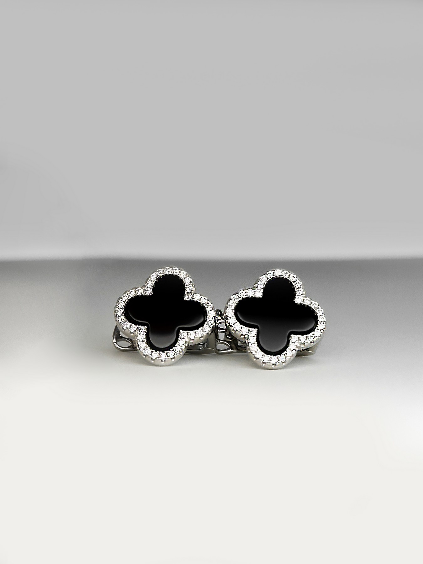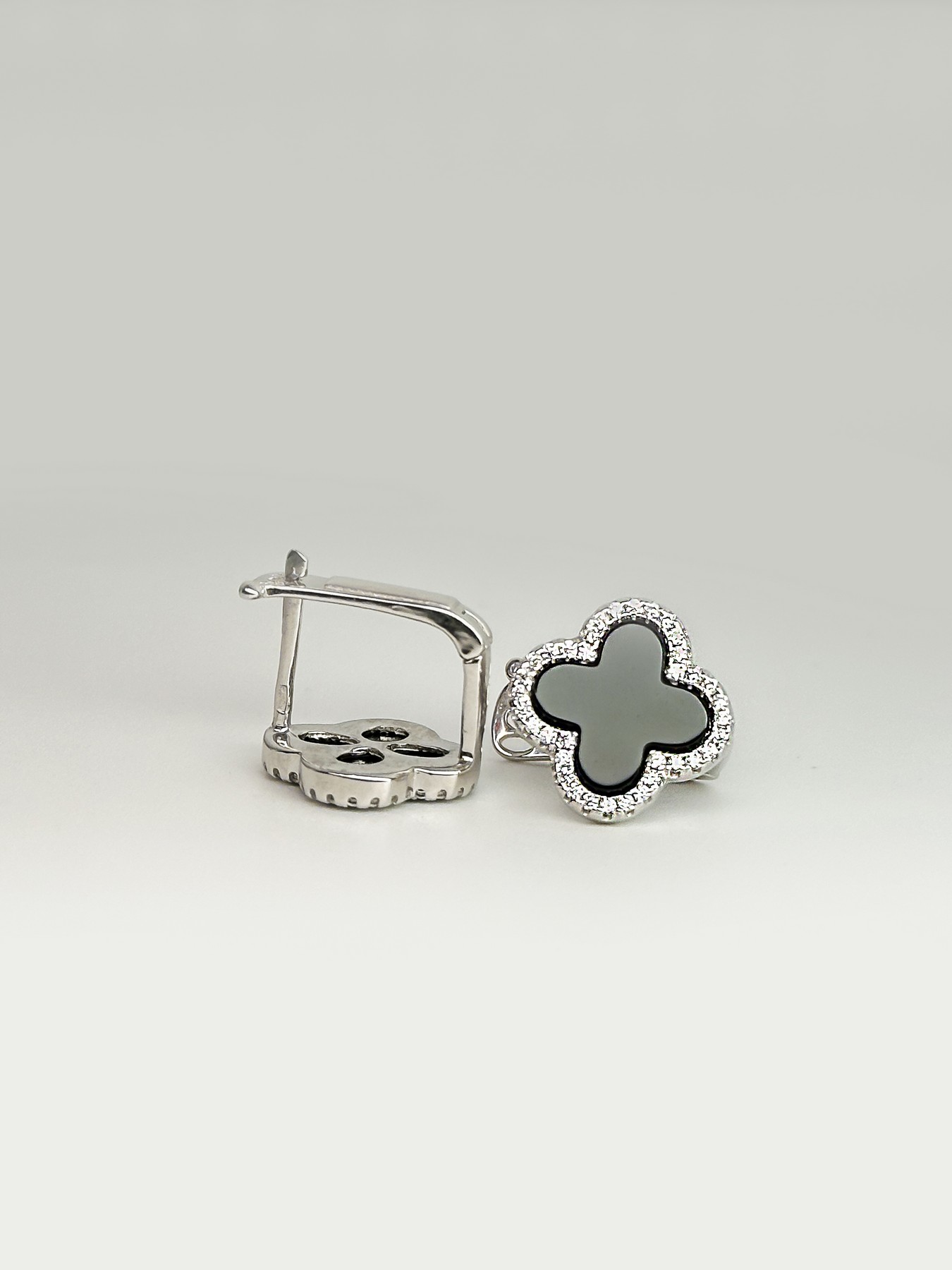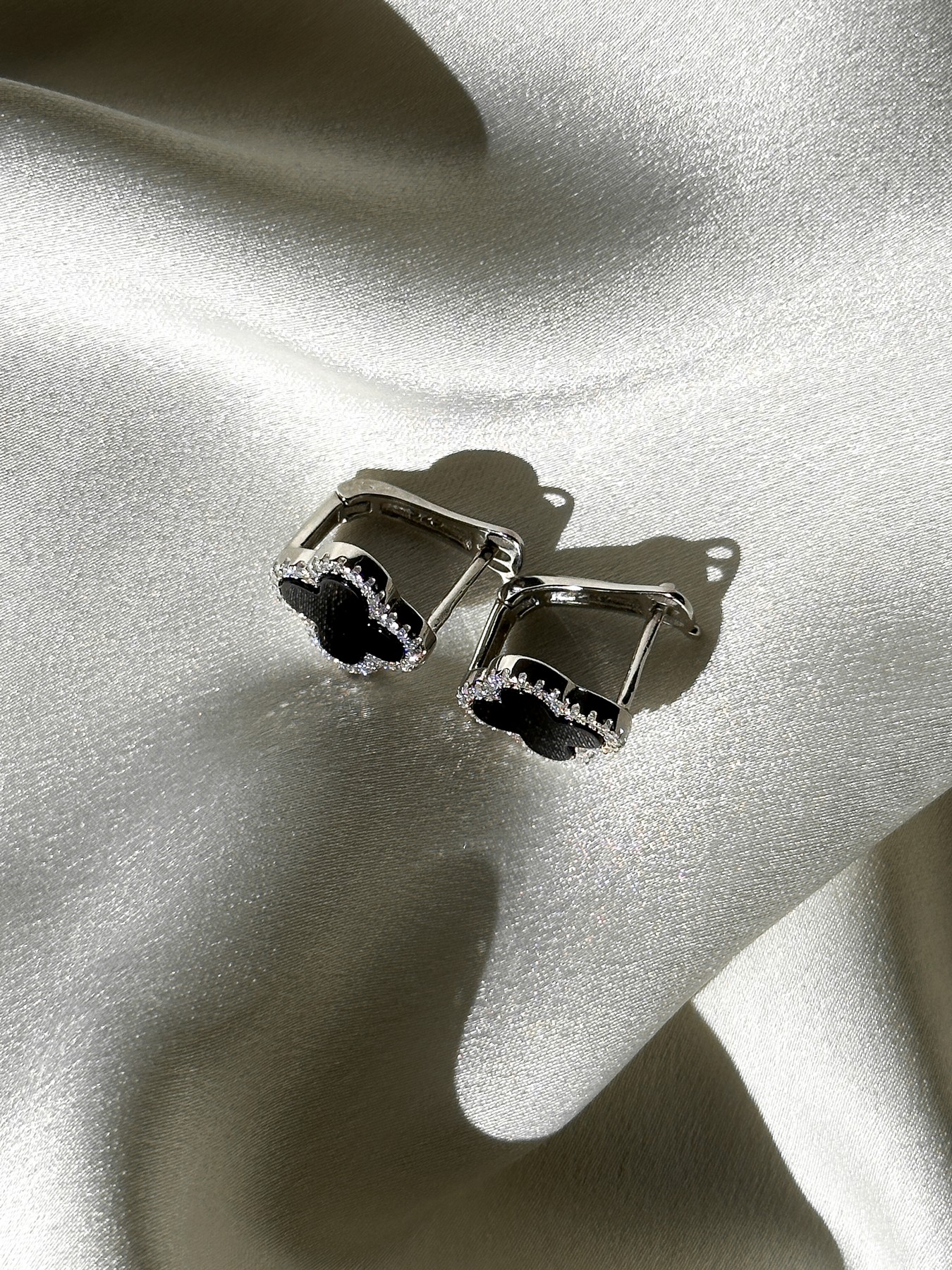 Серьги серебряные Клевер 1,5см с ониксом и цирконием бриллиантовой огранки