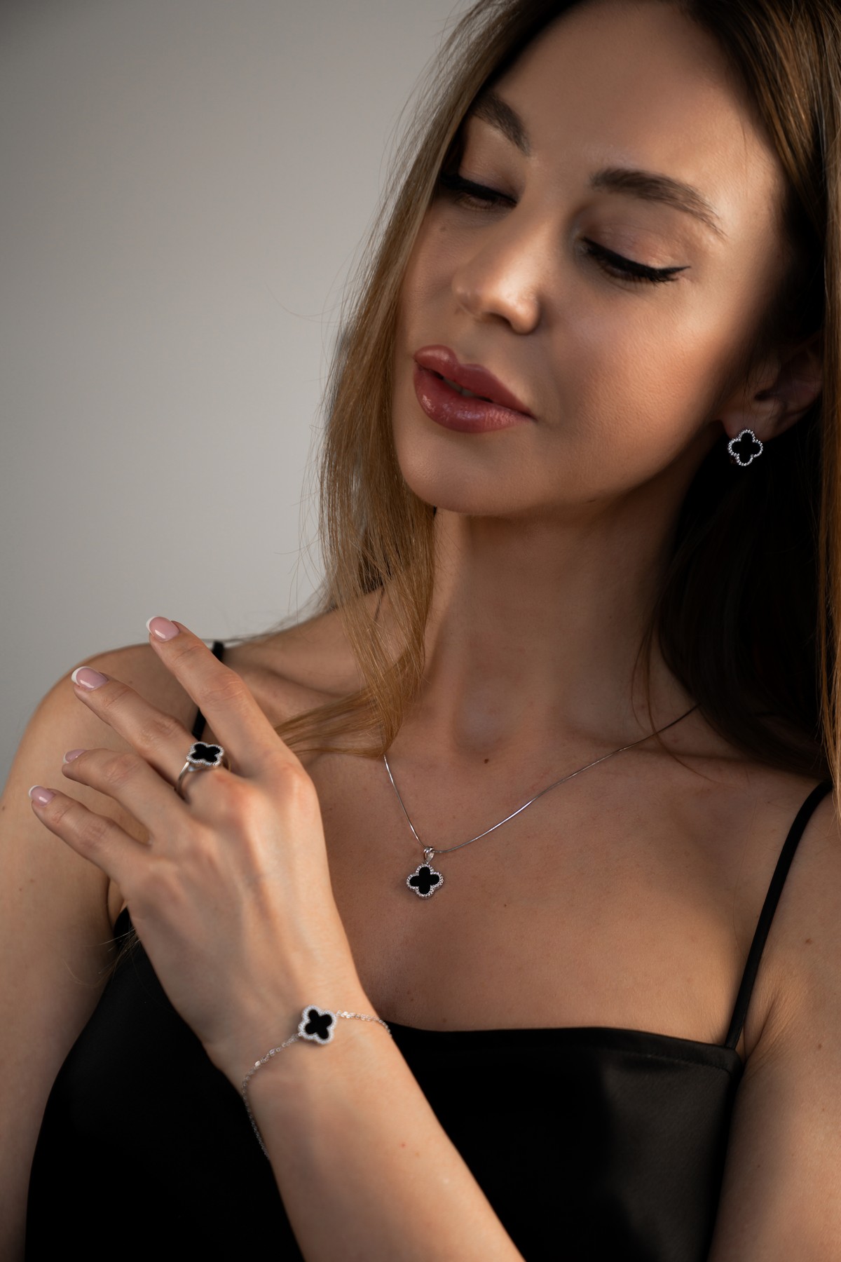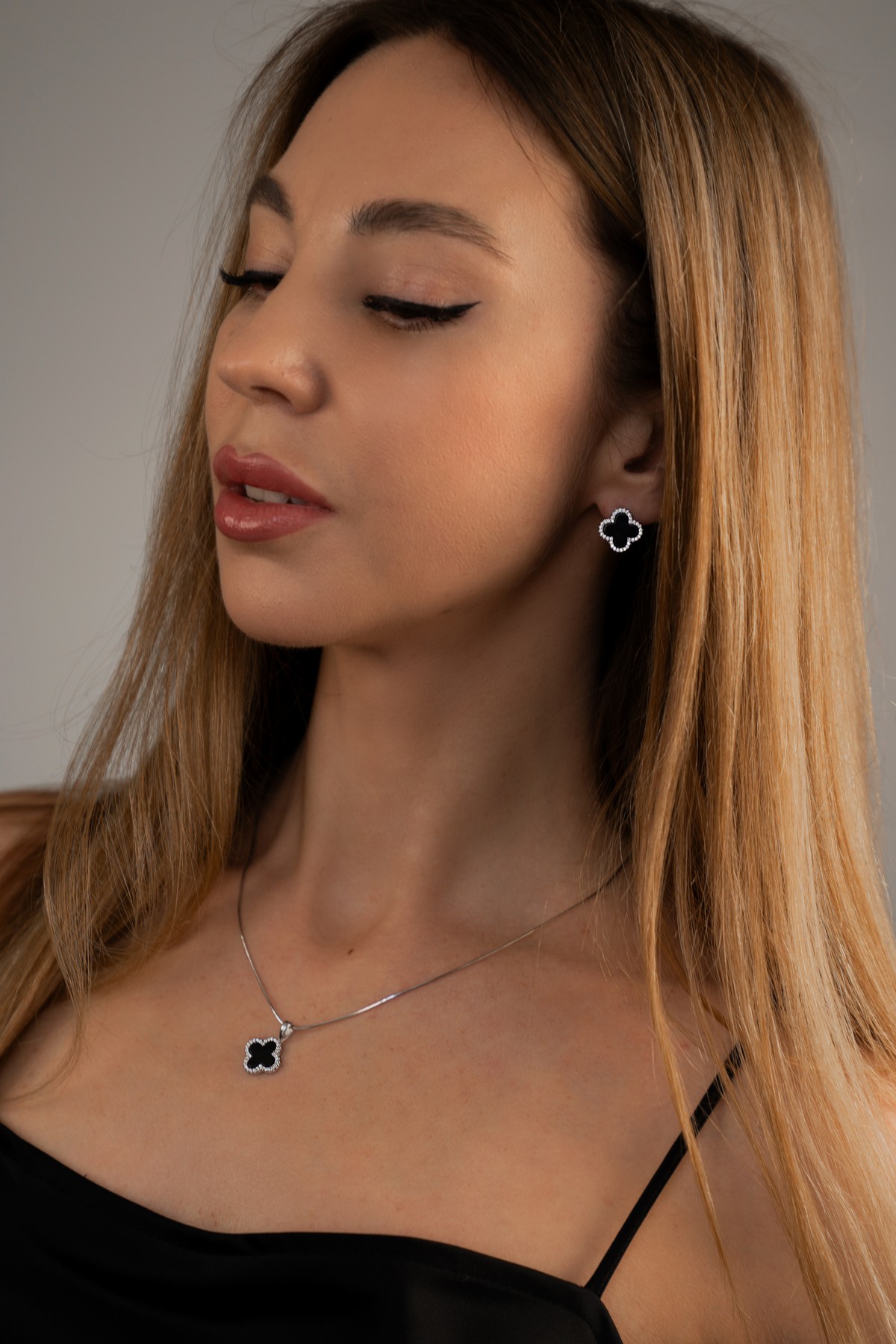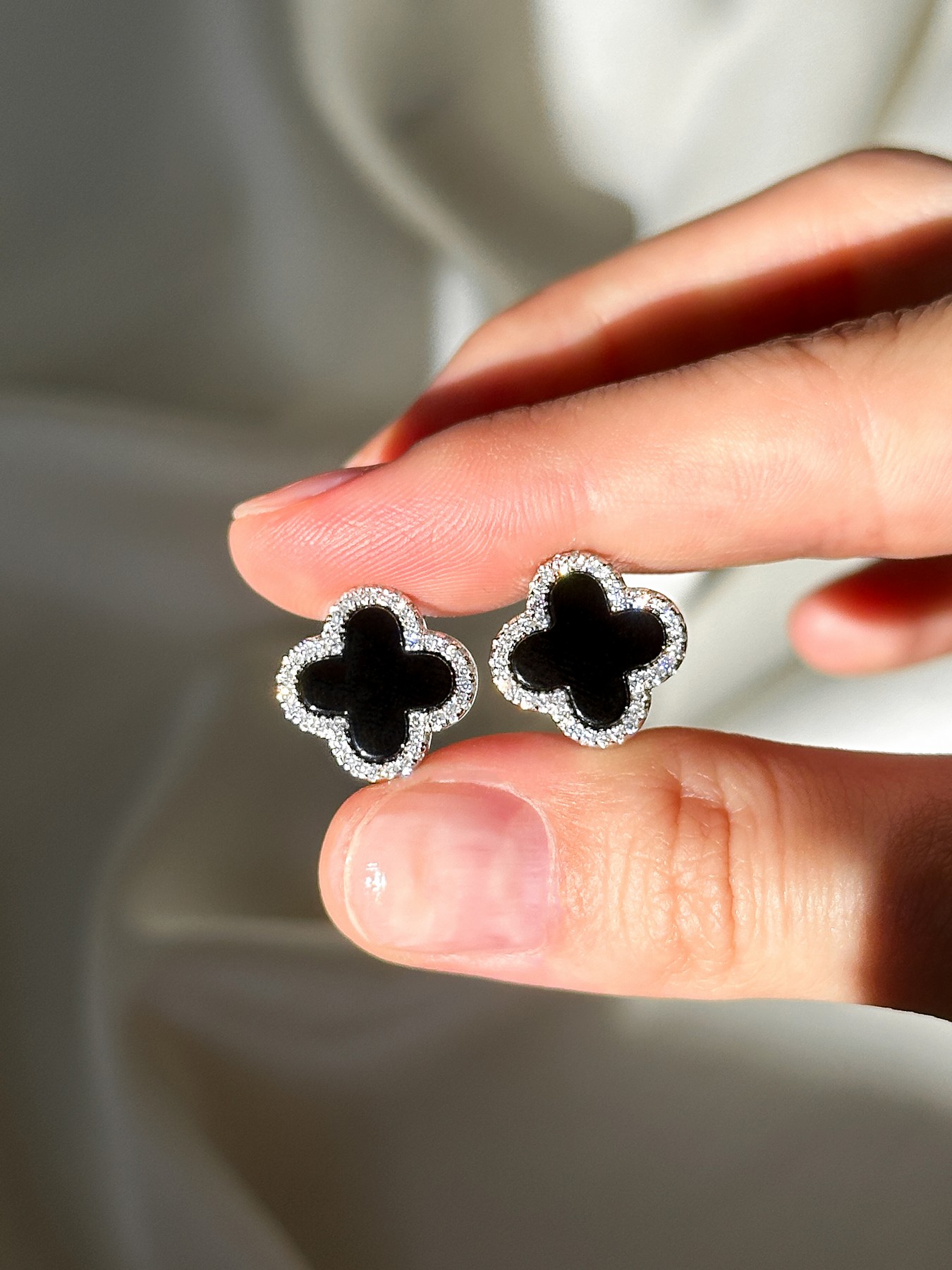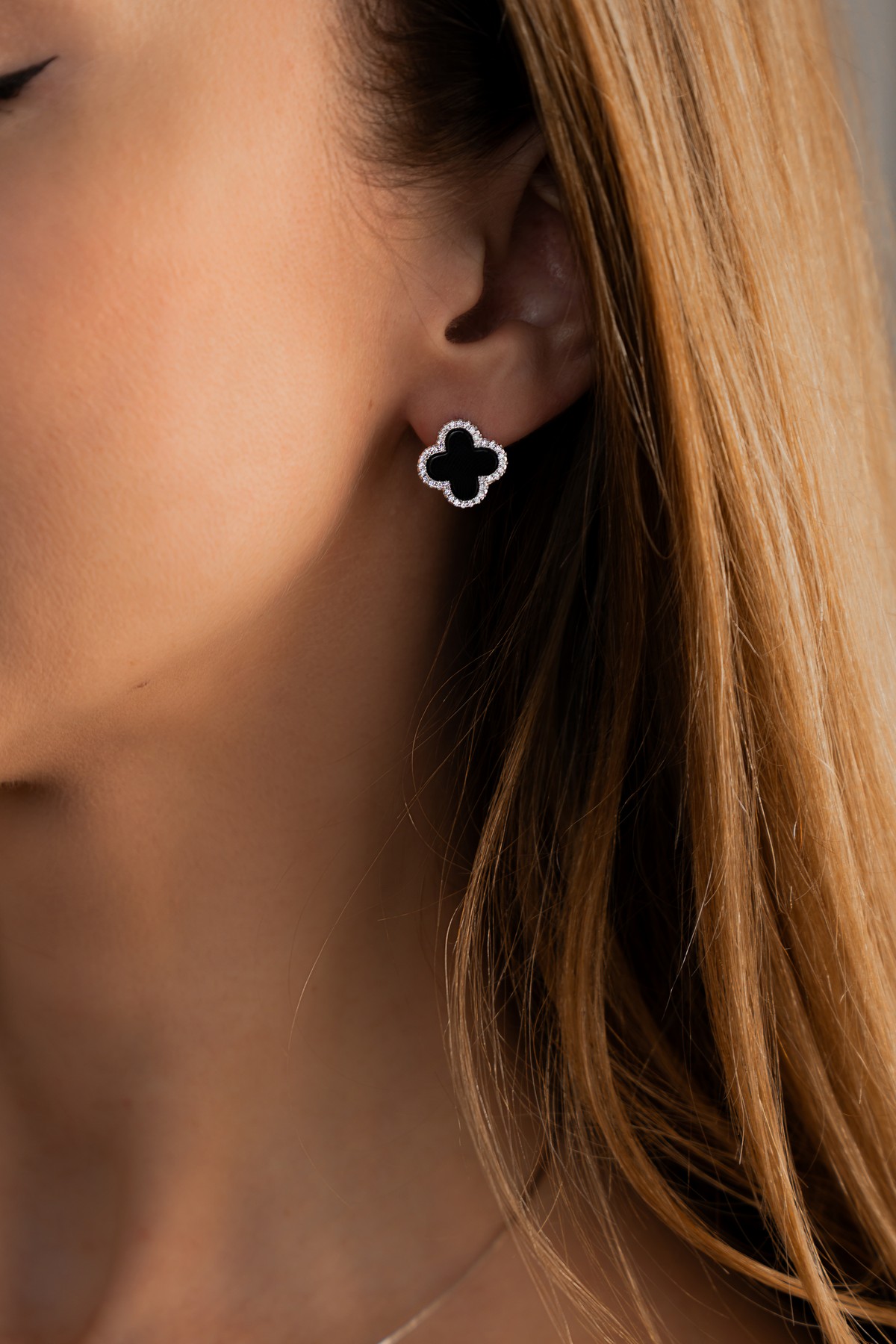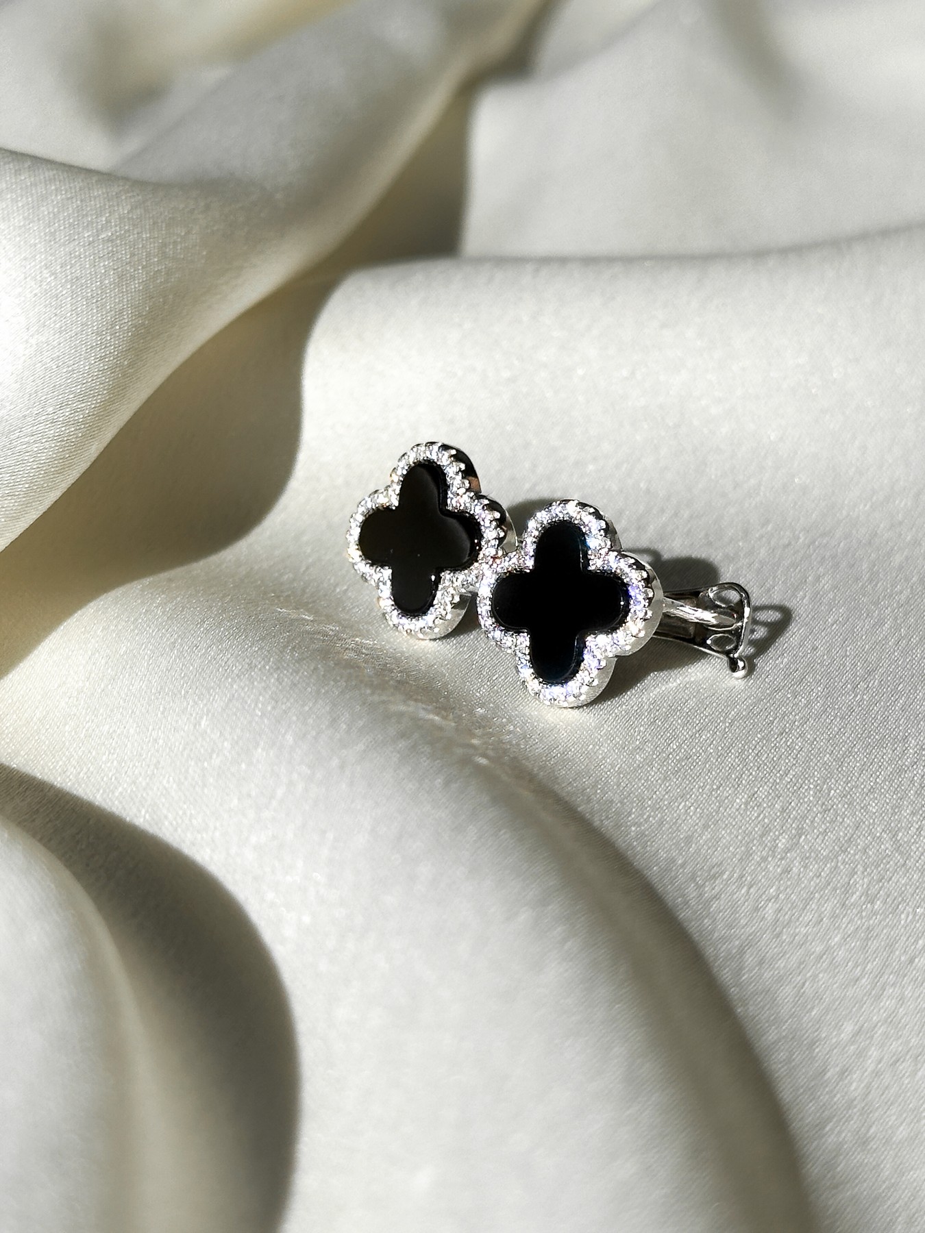 Серьги серебряные Клевер 1,5см с ониксом и цирконием бриллиантовой огранки
