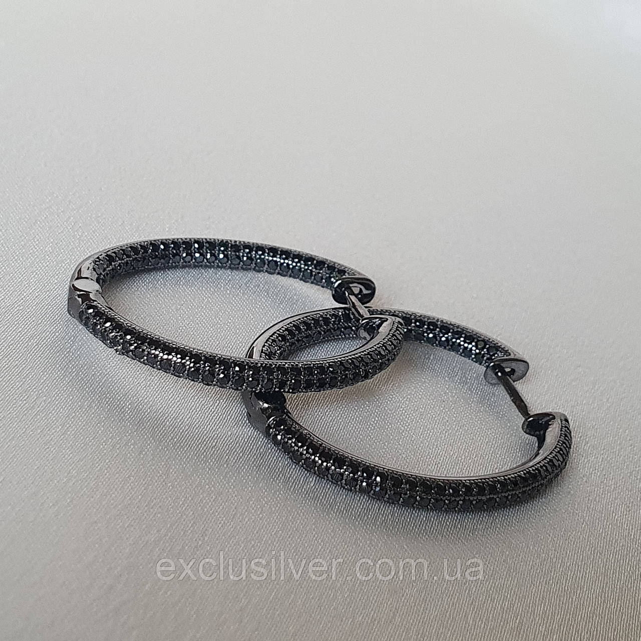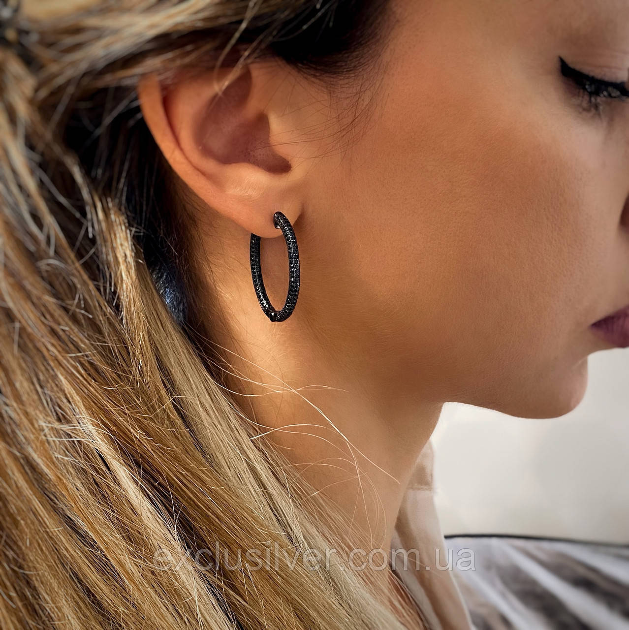 Сережки - кільця срібні з чорним цирконієм діамантової огранки