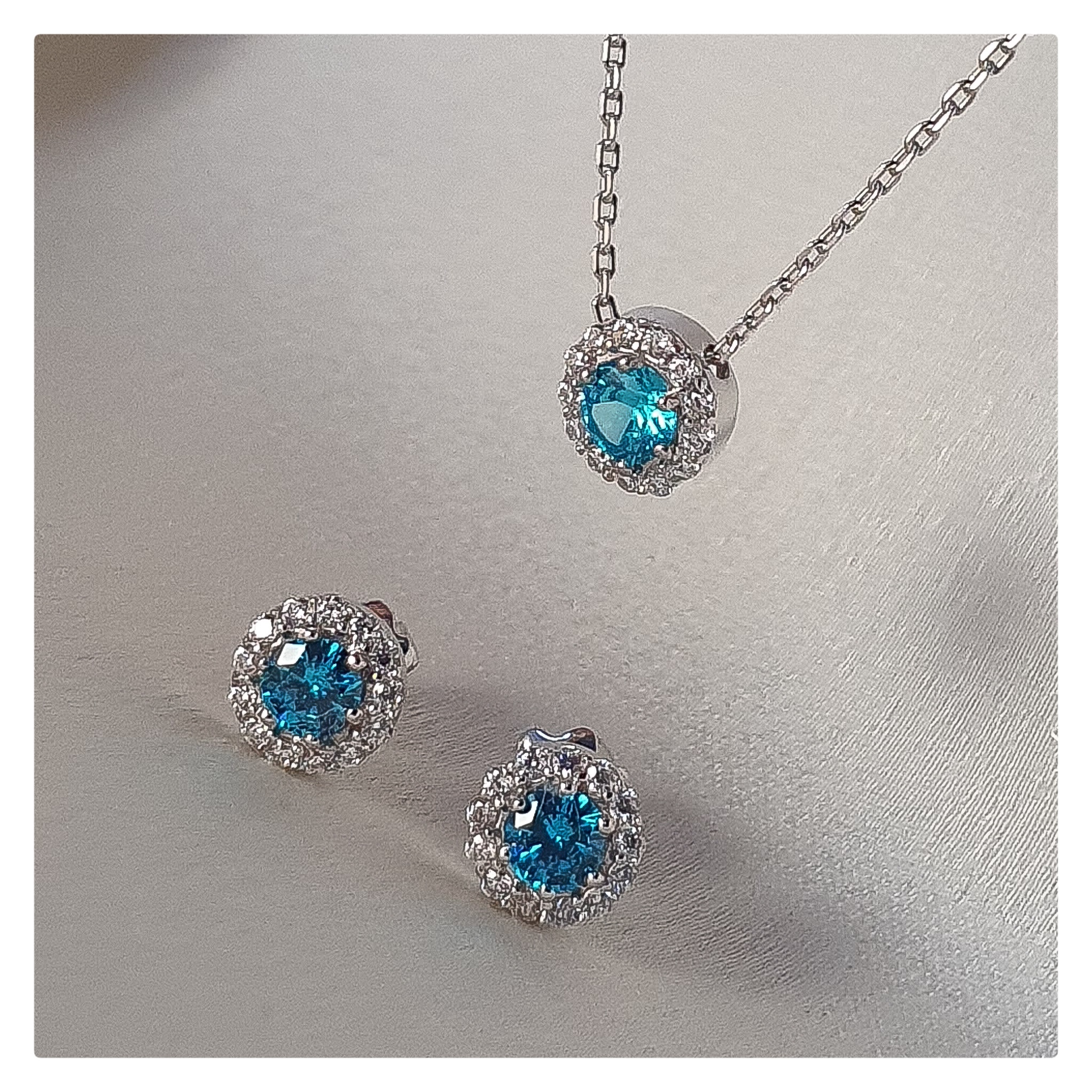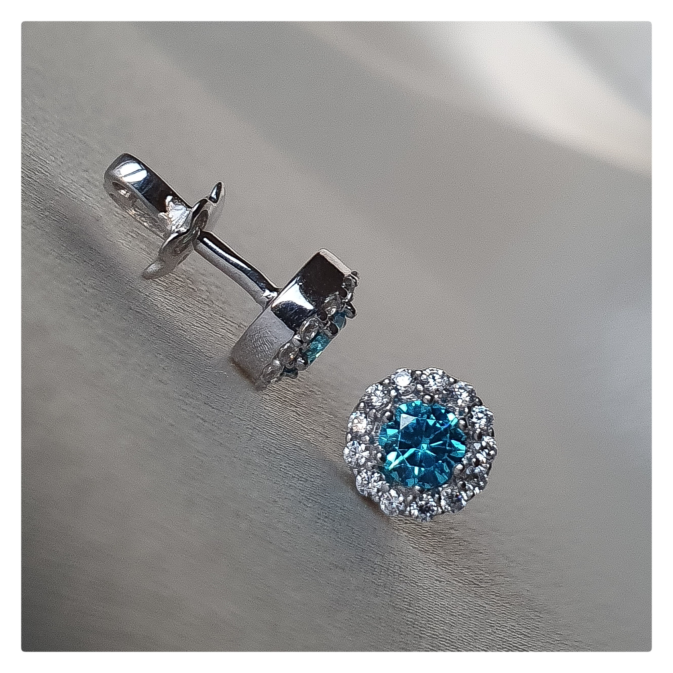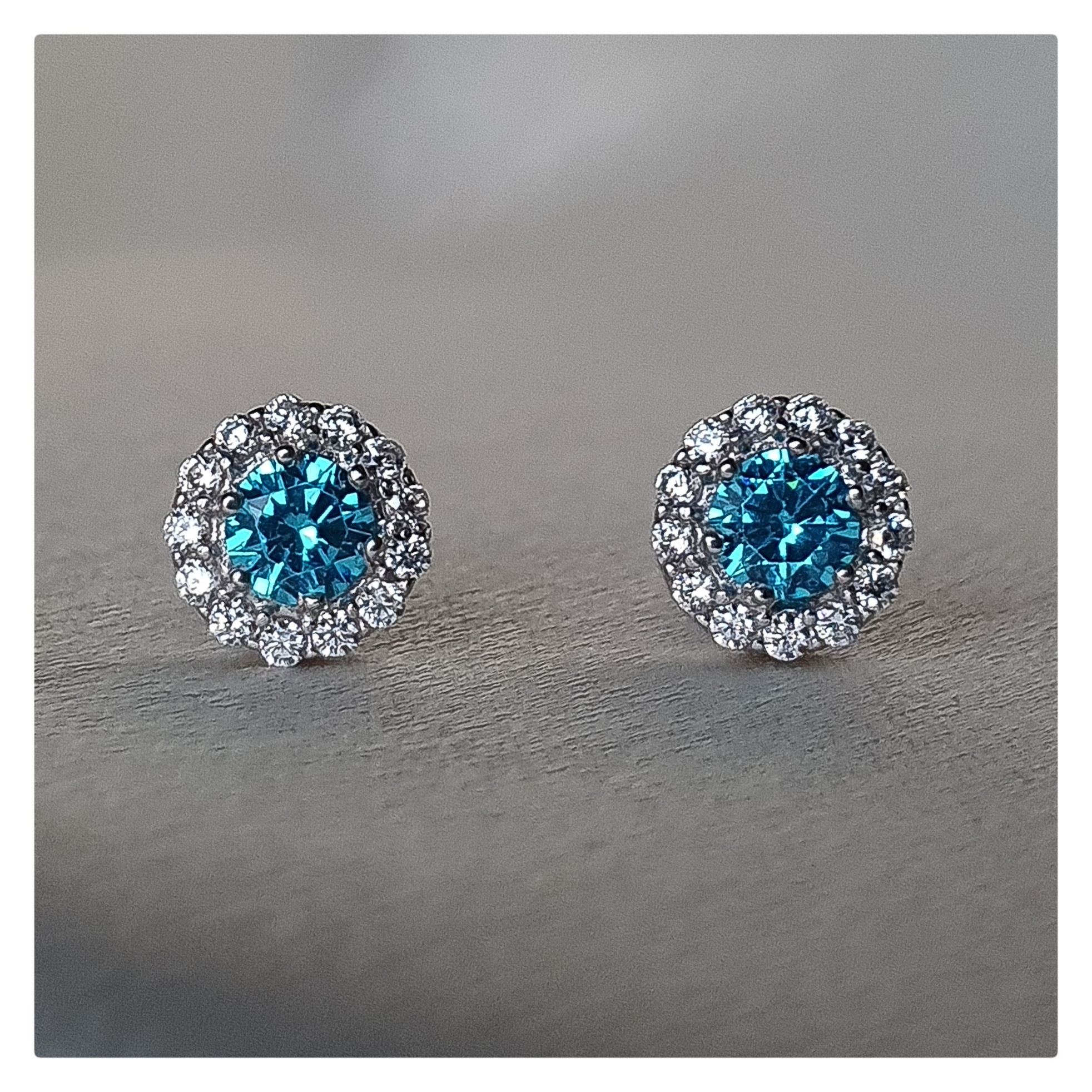 Сережки - пусети (гвоздики) з блакитним цирконієм і розсипом діамантової огранки