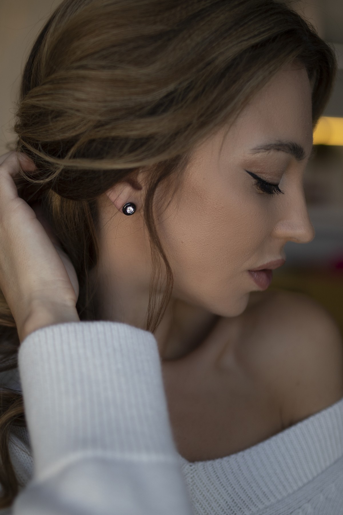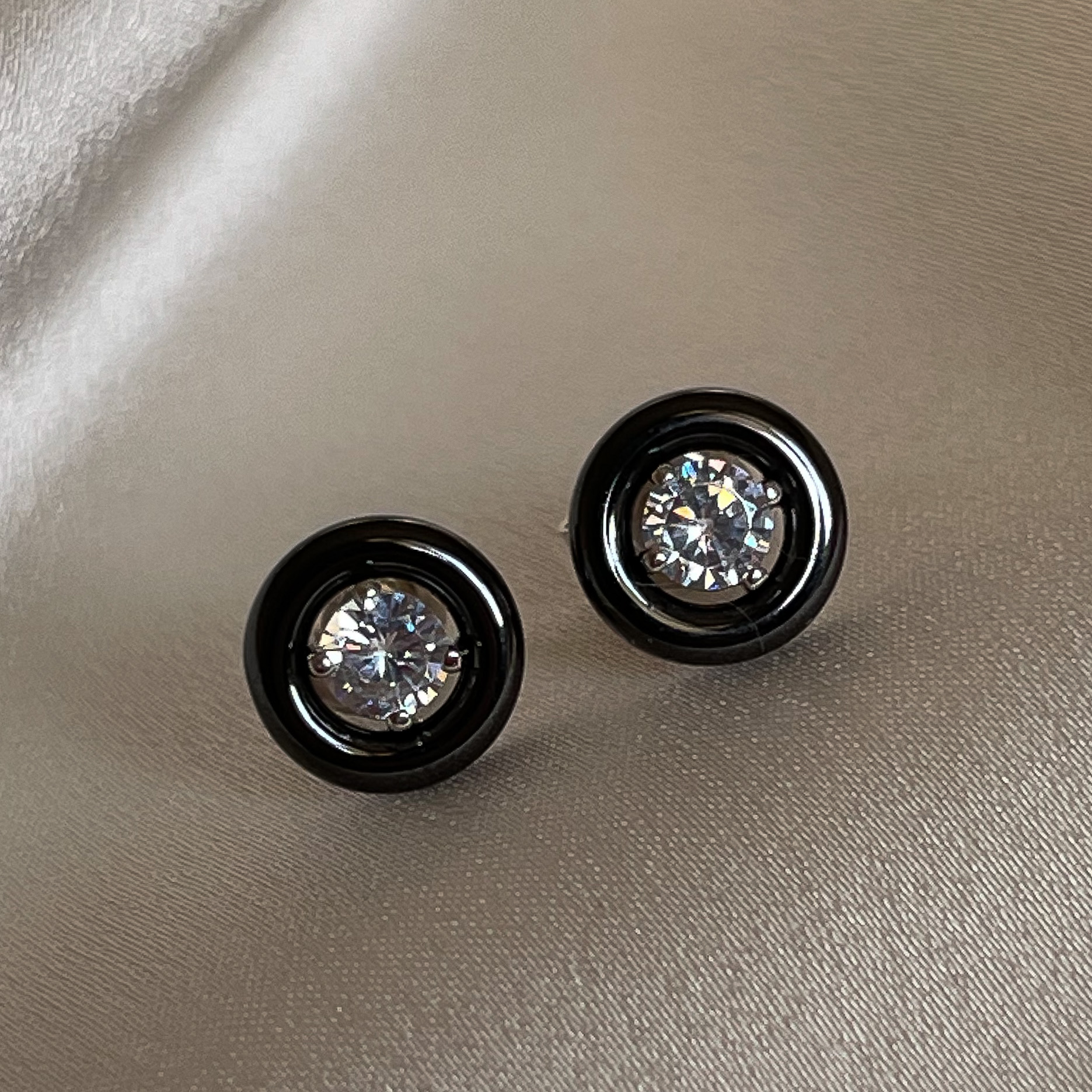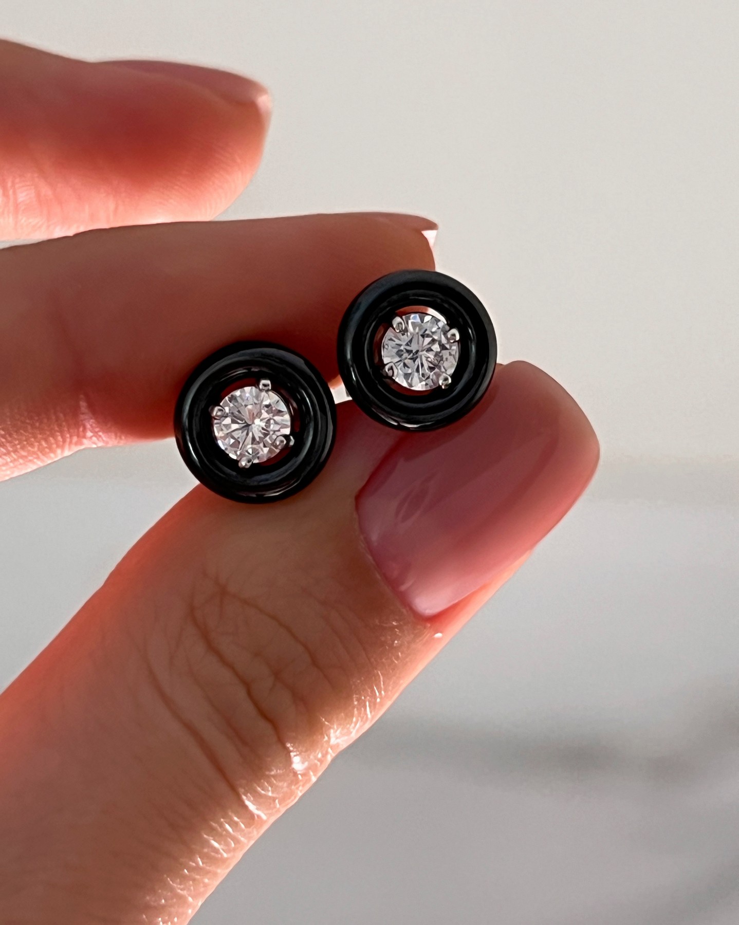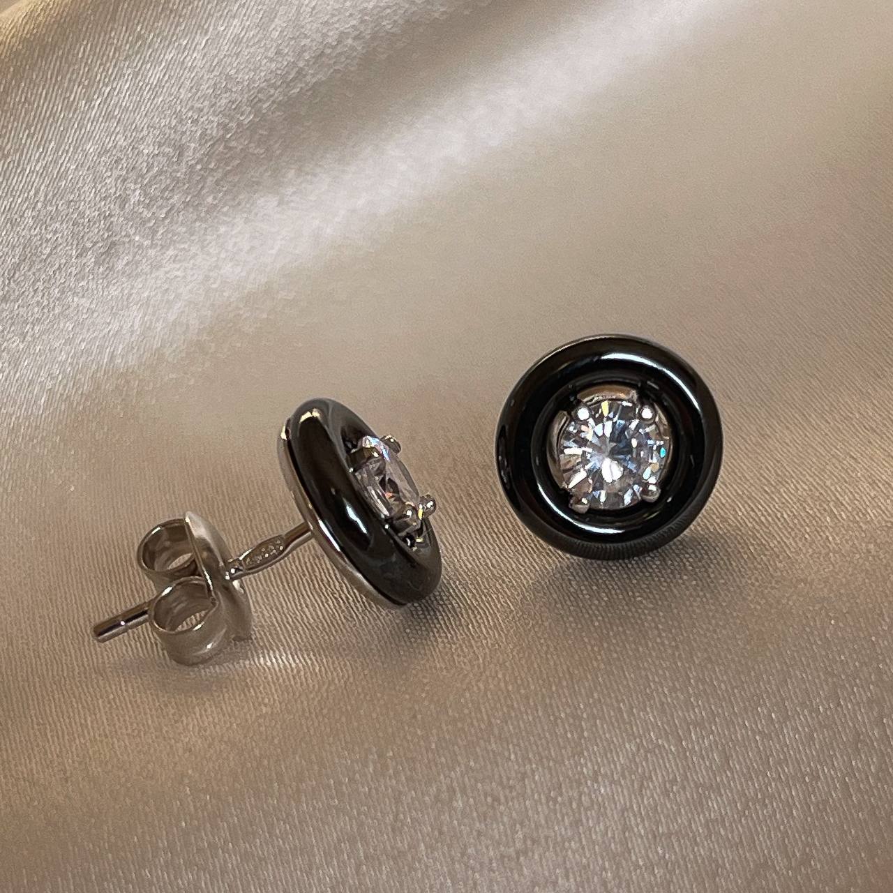 Сережки - пусети (гвоздики) срібні з чорною керамікою і цирконієм діамантового огранювання 003367
