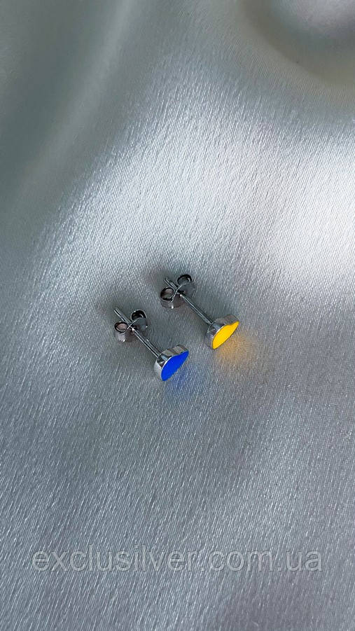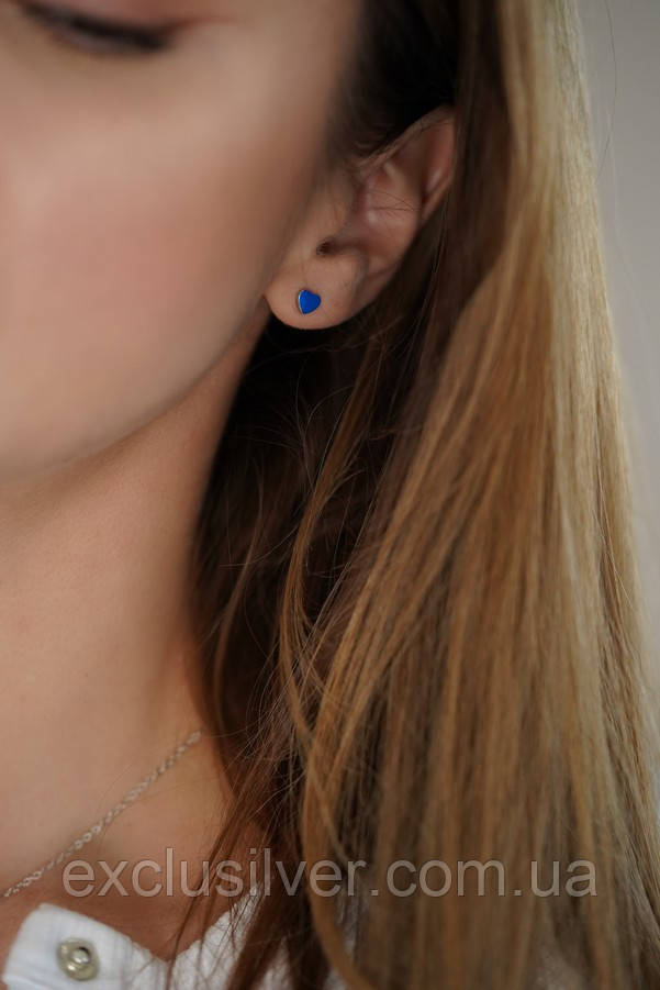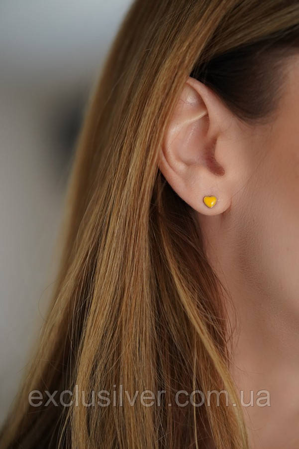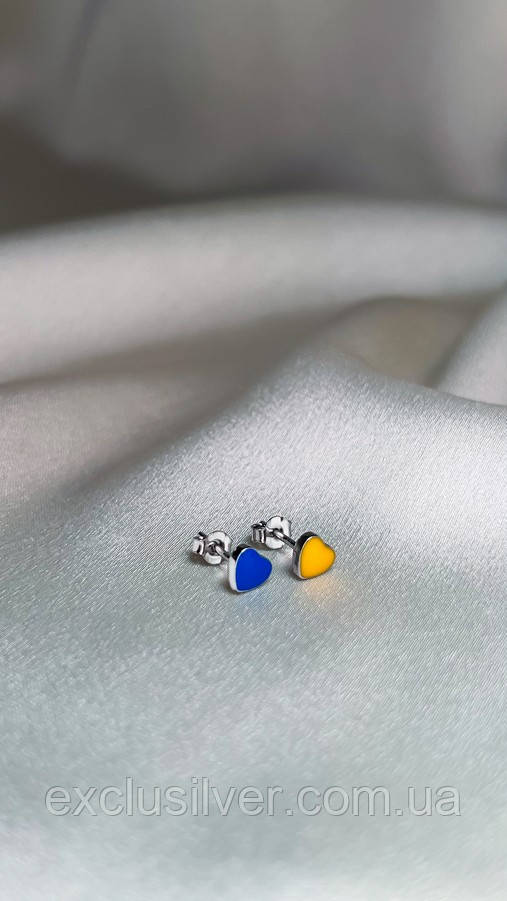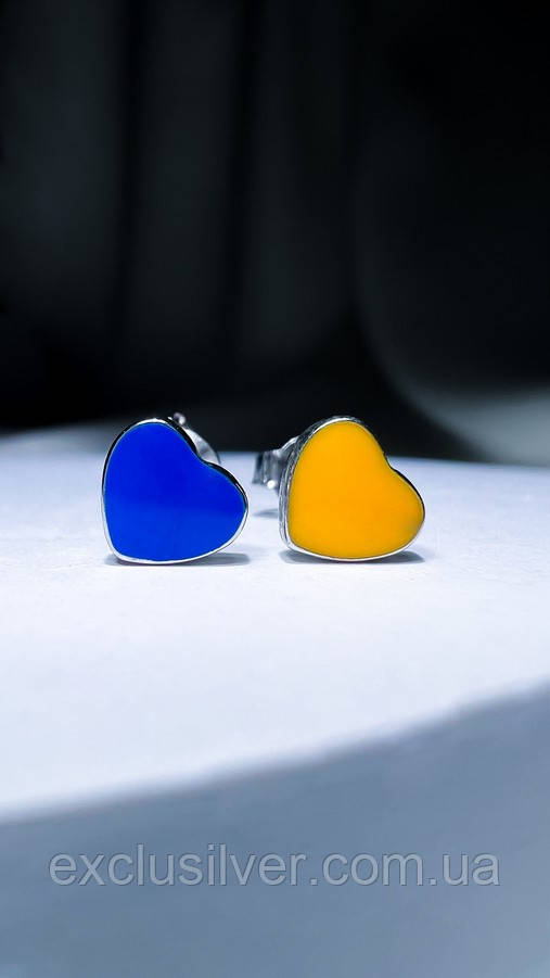 Сережки - пусети (гвоздики) срібні із жовто-блакитною емаллю Серця